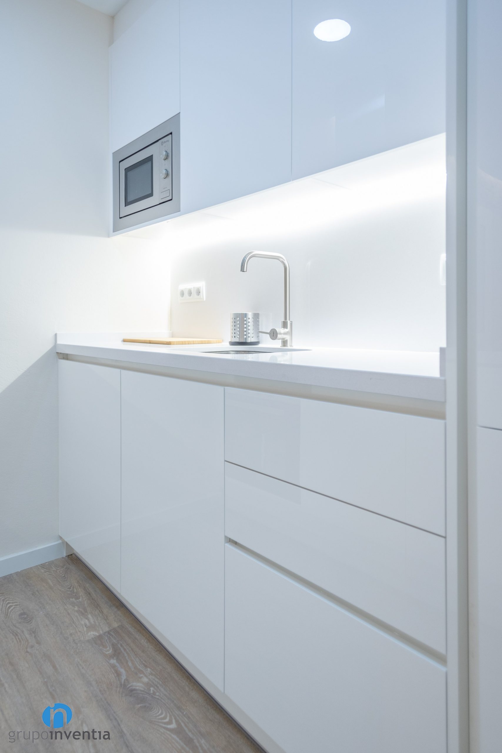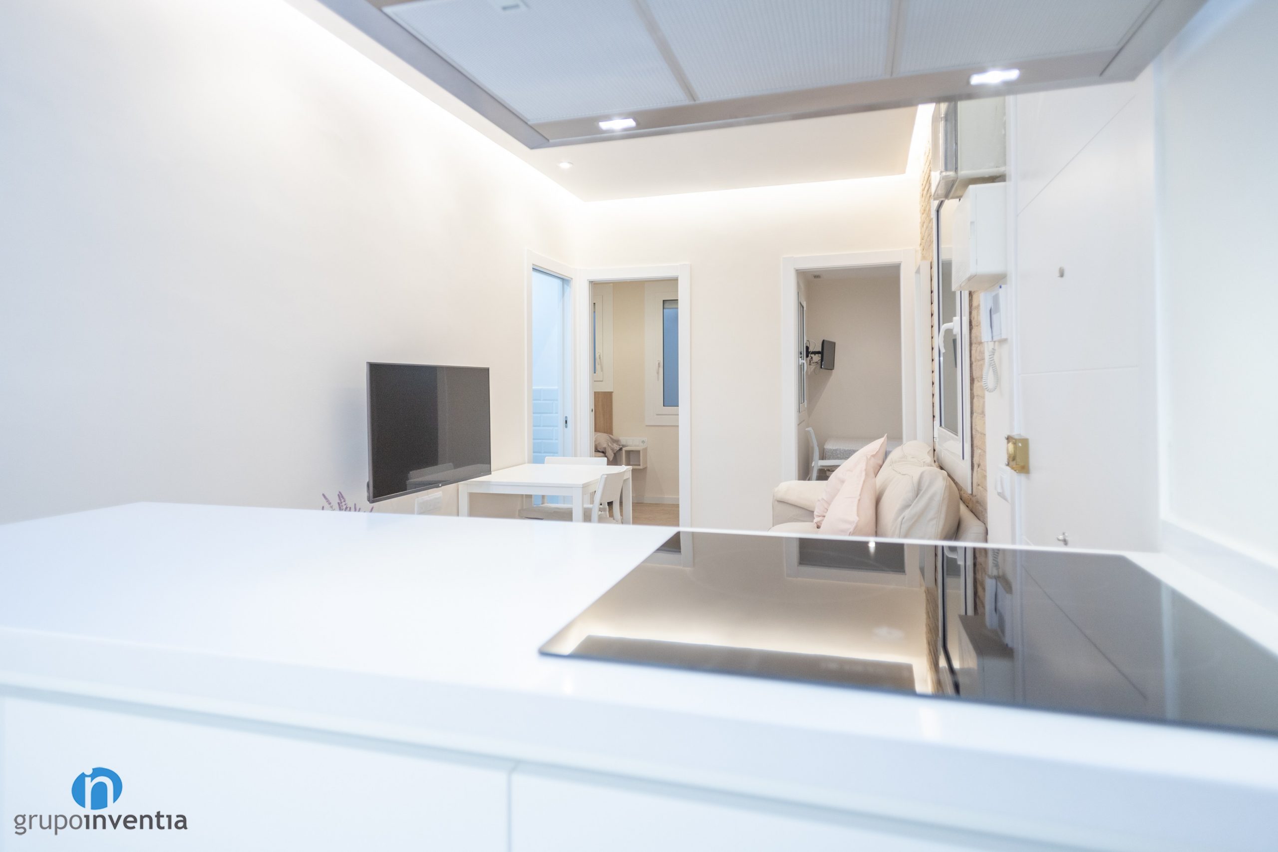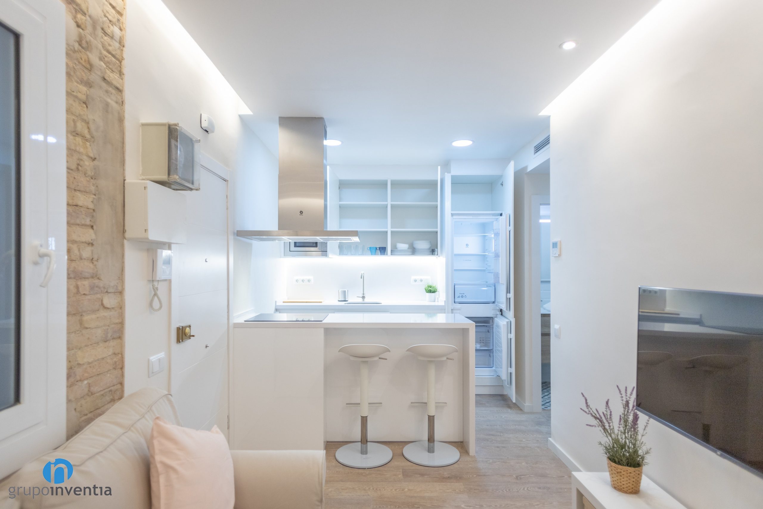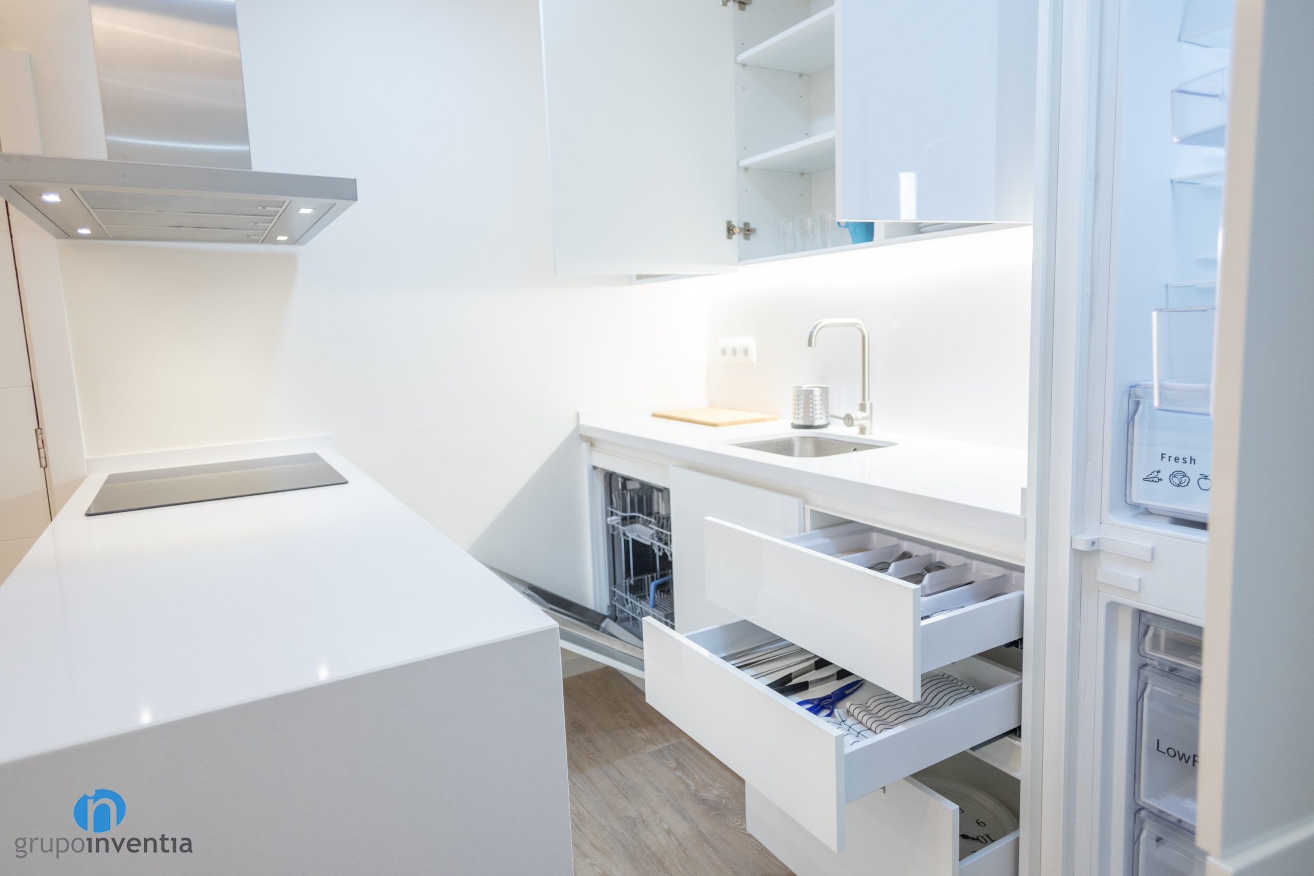 En esta reforma integral se ha trabajado en una reforma de cocina de concepto abierto y que se ha distribuido a dos frentes. El lado izquierdo es el abierto y se ha colocado un tramo de encimera. Ofrece una amplia superficie de apoyo y está equipado con una placa vitrocerámica, más un horno integrado justo debajo. Además cuenta con capacidad de almacenaje en su parte inferior y puede usarse como barra de desayuno.