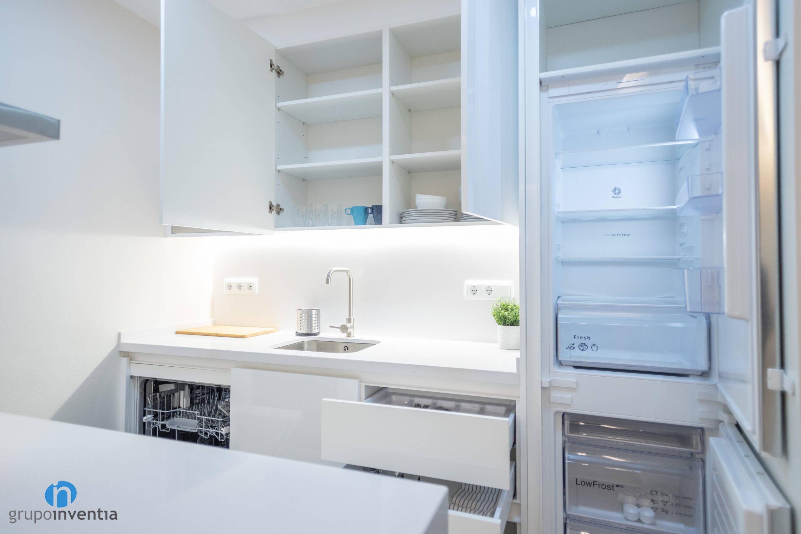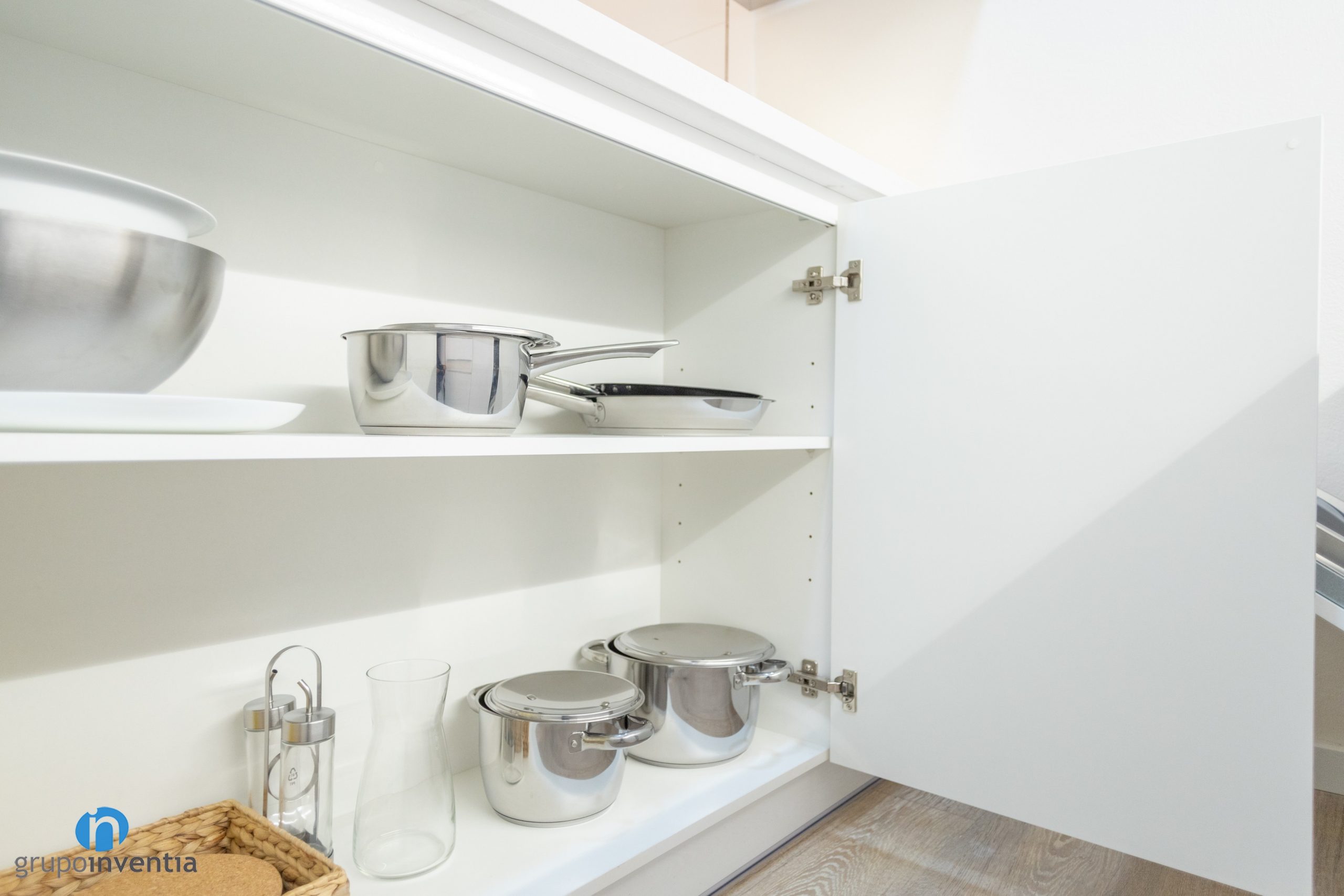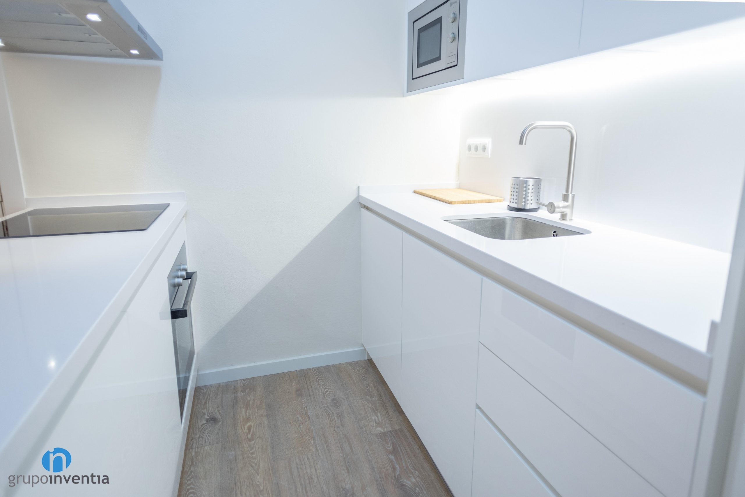 En esta reforma integral se ha trabajado en una reforma de cocina de concepto abierto y que se ha distribuido a dos frentes. El lado izquierdo es el abierto y se ha colocado un tramo de encimera. Ofrece una amplia superficie de apoyo y está equipado con una placa vitrocerámica, más un horno integrado justo debajo. Además cuenta con capacidad de almacenaje en su parte inferior y puede usarse como barra de desayuno.