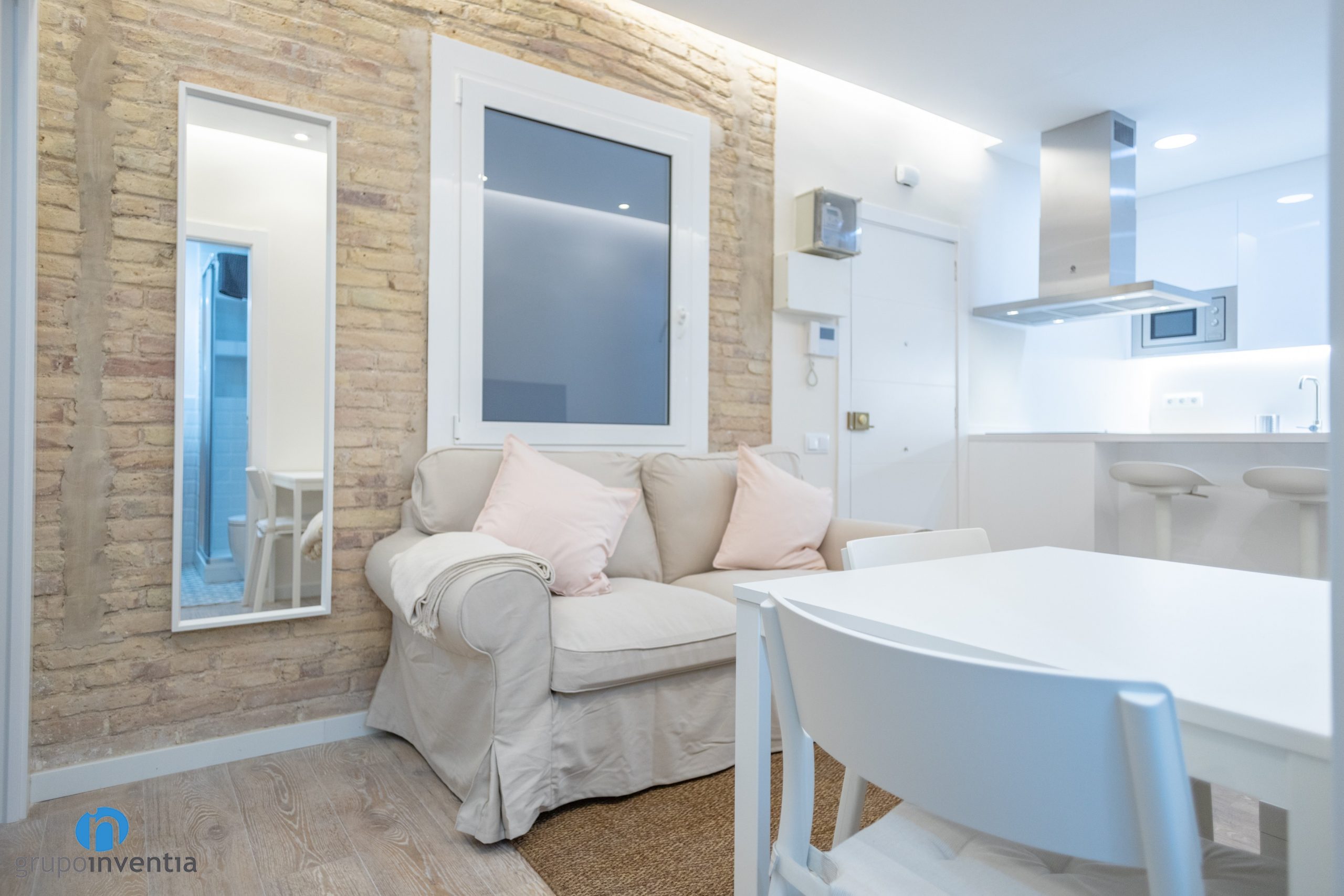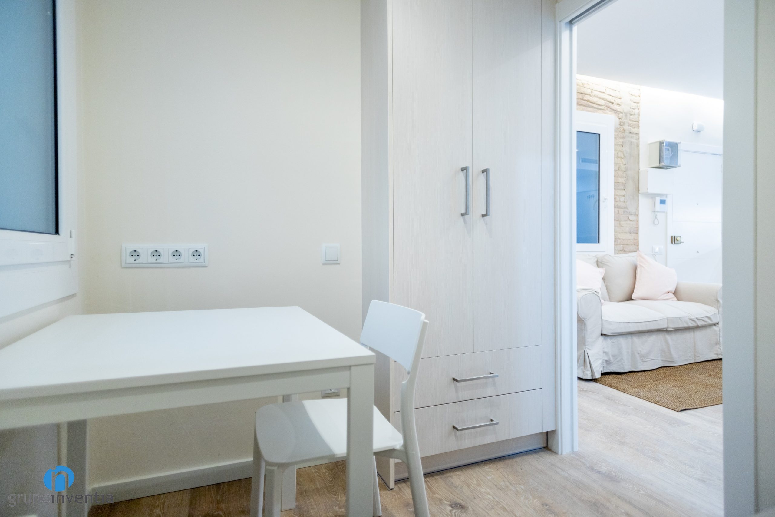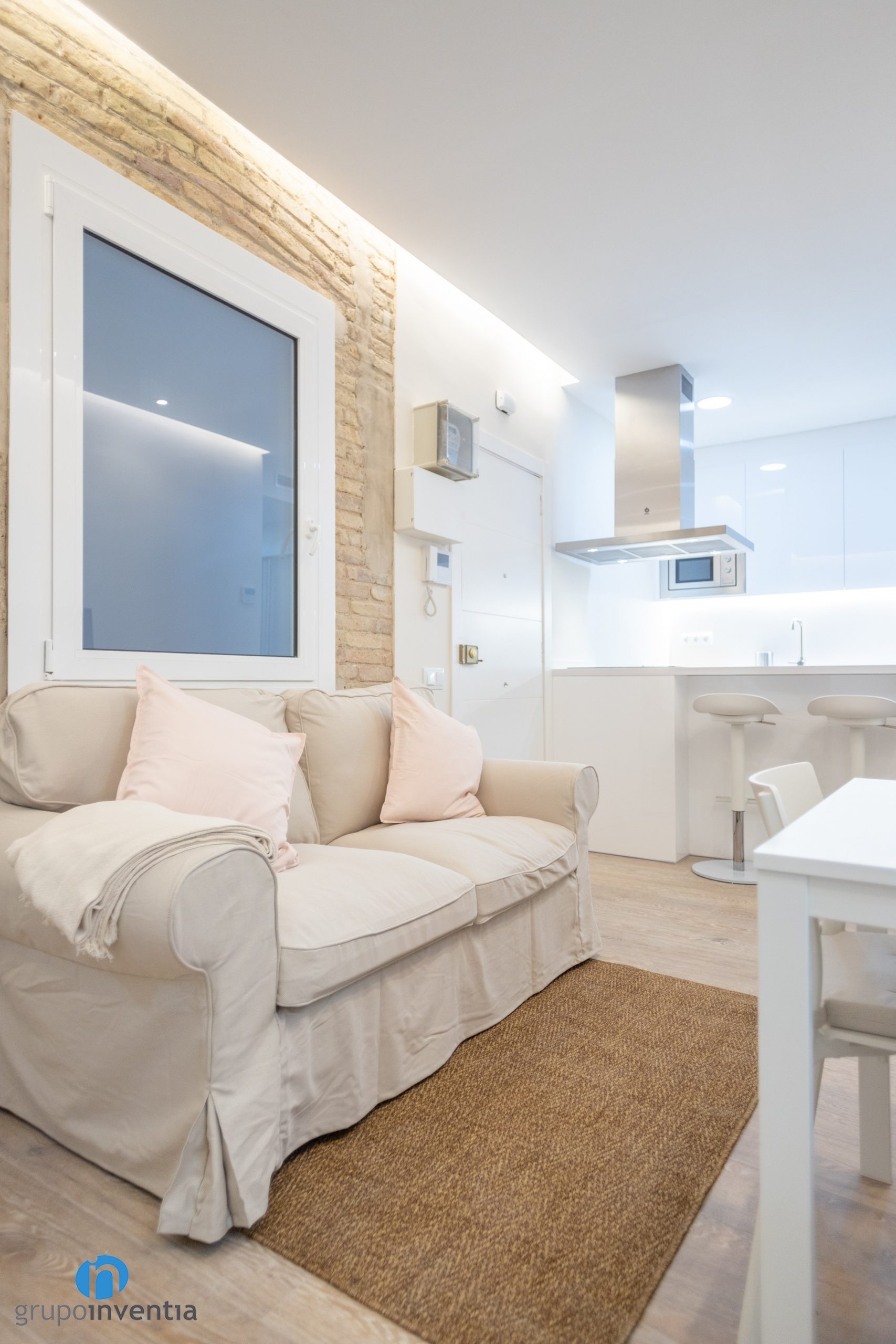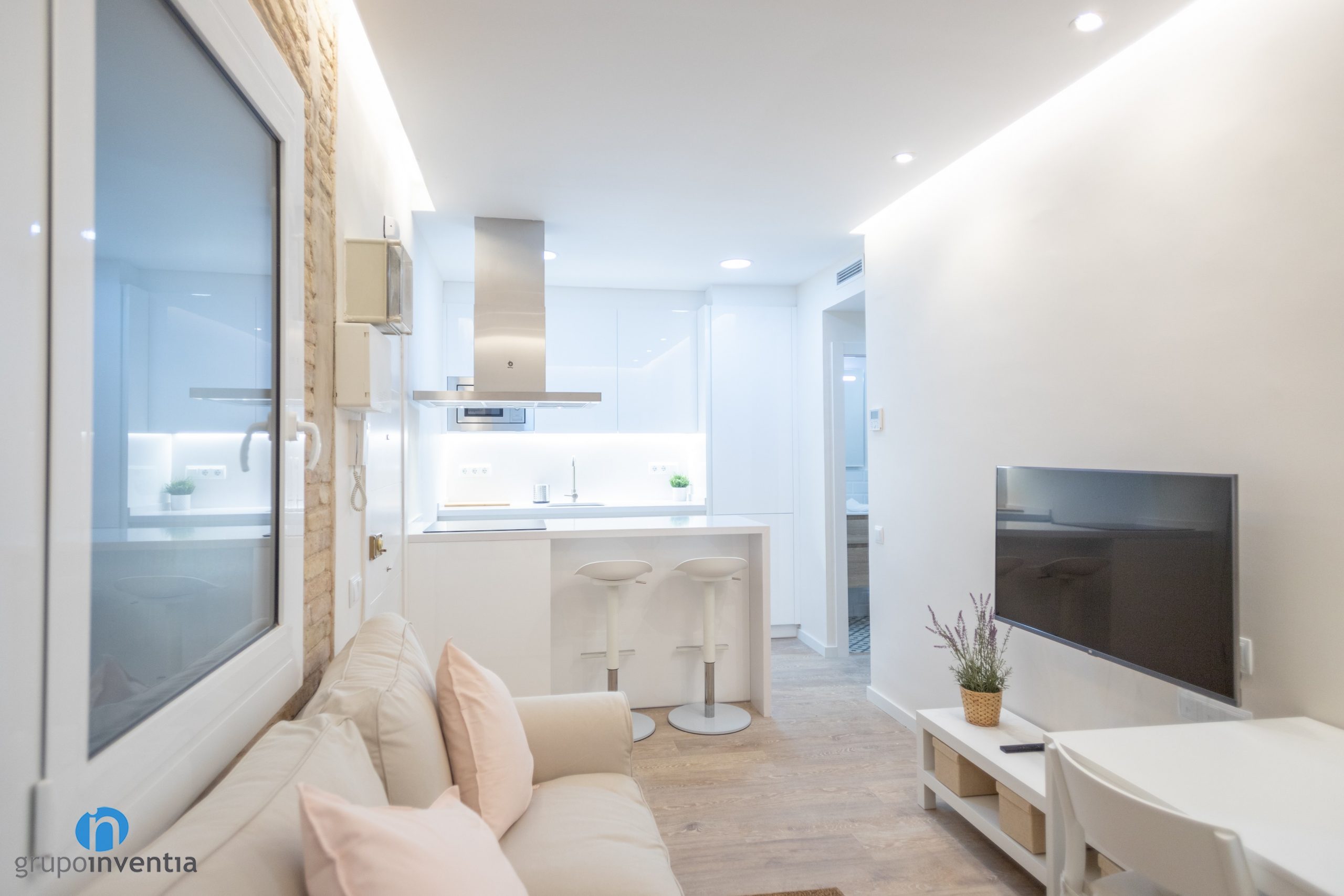En esta reforma integral se ha trabajado en una reforma de cocina de concepto abierto y que se ha distribuido a dos frentes. El lado izquierdo es el abierto y se ha colocado un tramo de encimera. Ofrece una amplia superficie de apoyo y está equipado con una placa vitrocerámica, más un horno integrado justo debajo. Además cuenta con capacidad de almacenaje en su parte inferior y puede usarse como barra de desayuno.