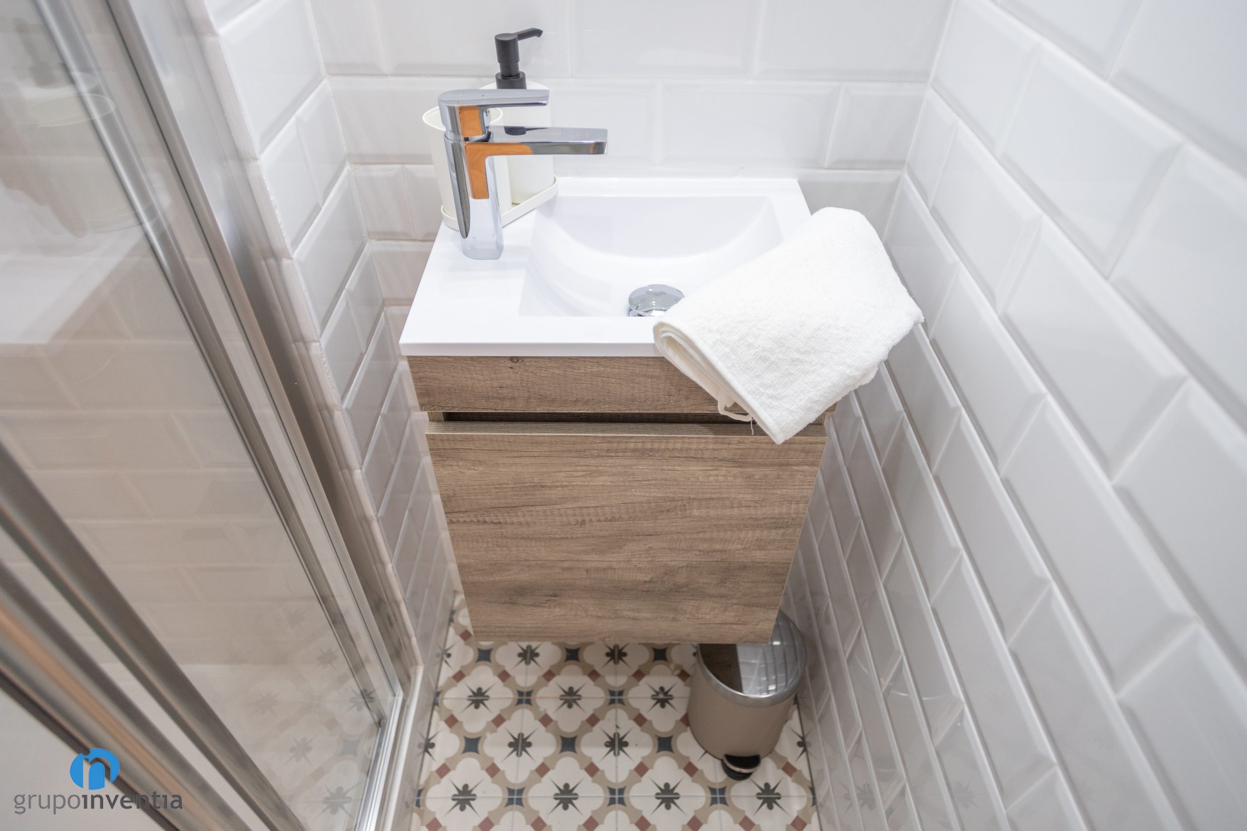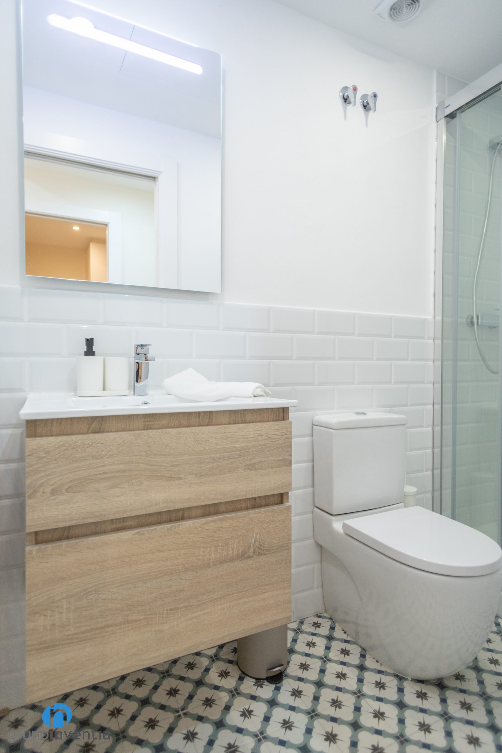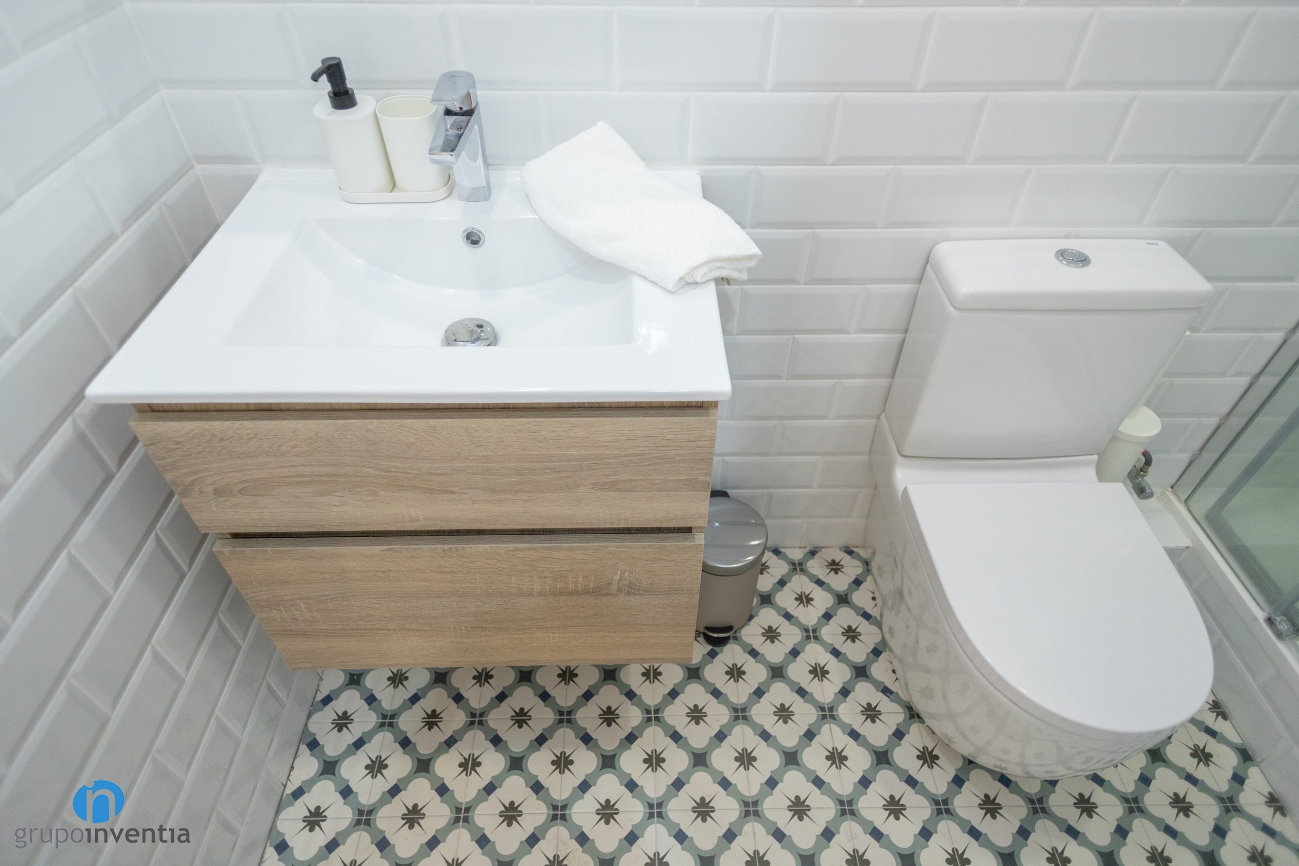 Para el nuevo pavimento se ha apostado por un nuevo suelo tipo hidráulico con un dibujo con mucha personalidad. En cuanto al equipamiento sanitario cada cuarto de baño cuenta con un lavabo con mueble de almacenaje en su parte inferior. A éste lo complementan un inodoro de líneas modernas y una práctica ducha protegida con mamparas de puertas correderas.