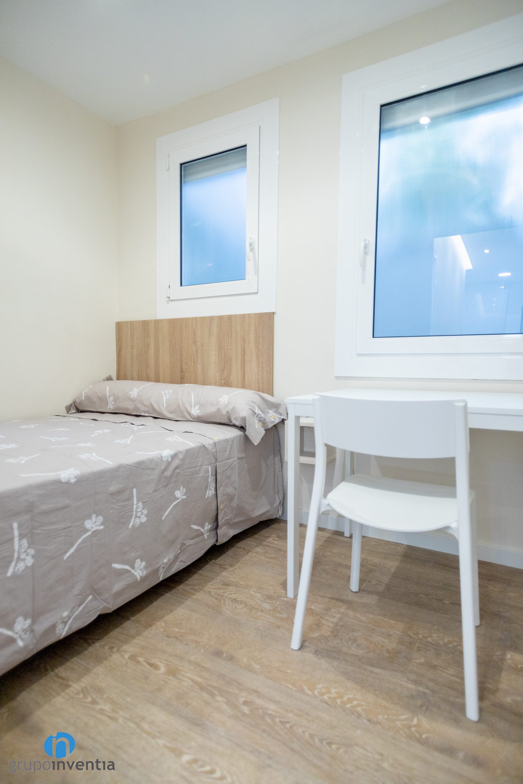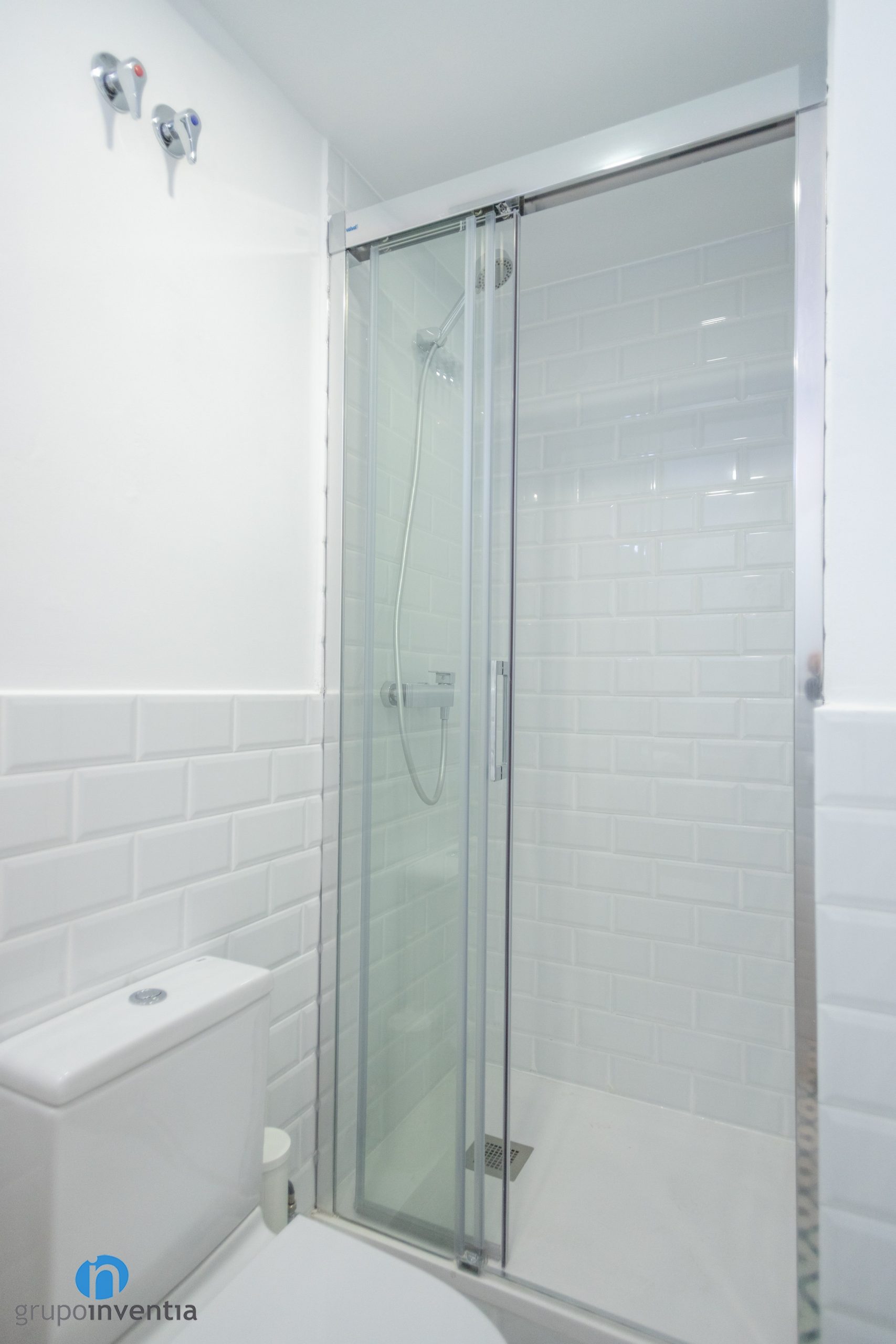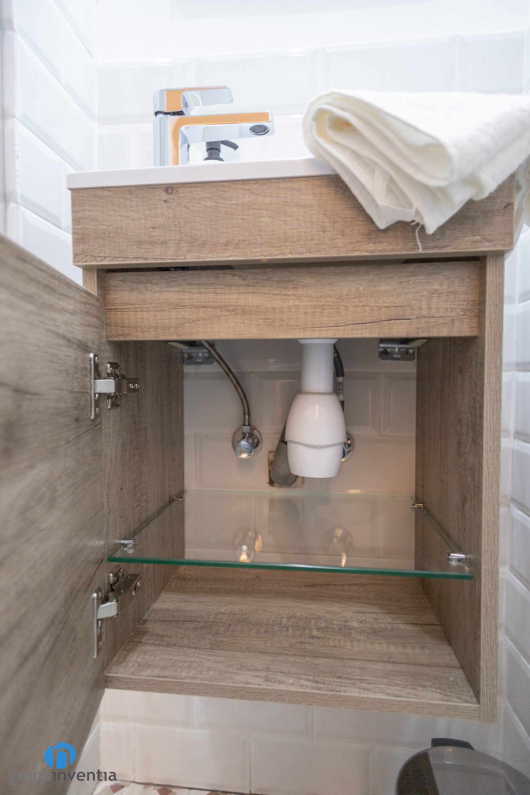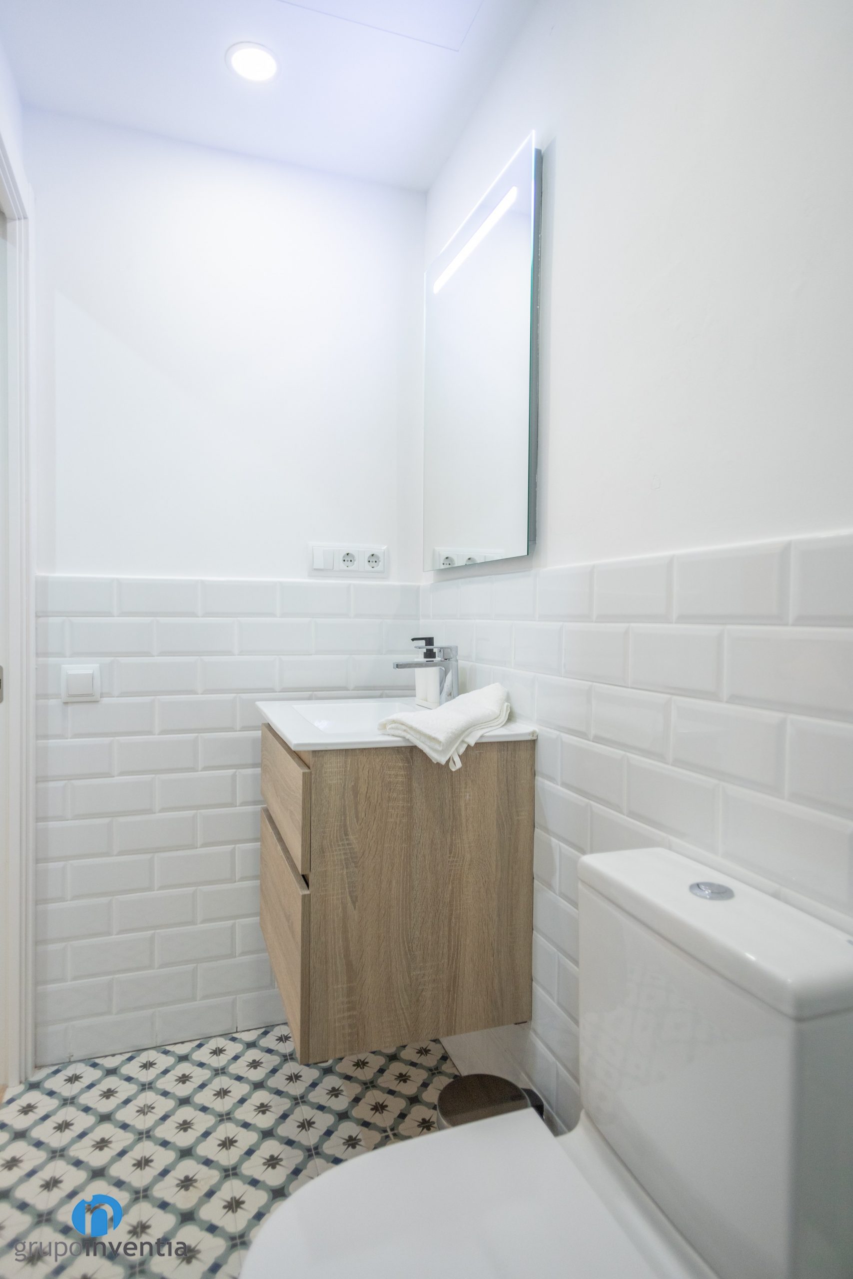 Para el nuevo pavimento se ha apostado por un nuevo suelo tipo hidráulico con un dibujo con mucha personalidad. En cuanto al equipamiento sanitario cada cuarto de baño cuenta con un lavabo con mueble de almacenaje en su parte inferior. A éste lo complementan un inodoro de líneas modernas y una práctica ducha protegida con mamparas de puertas correderas.