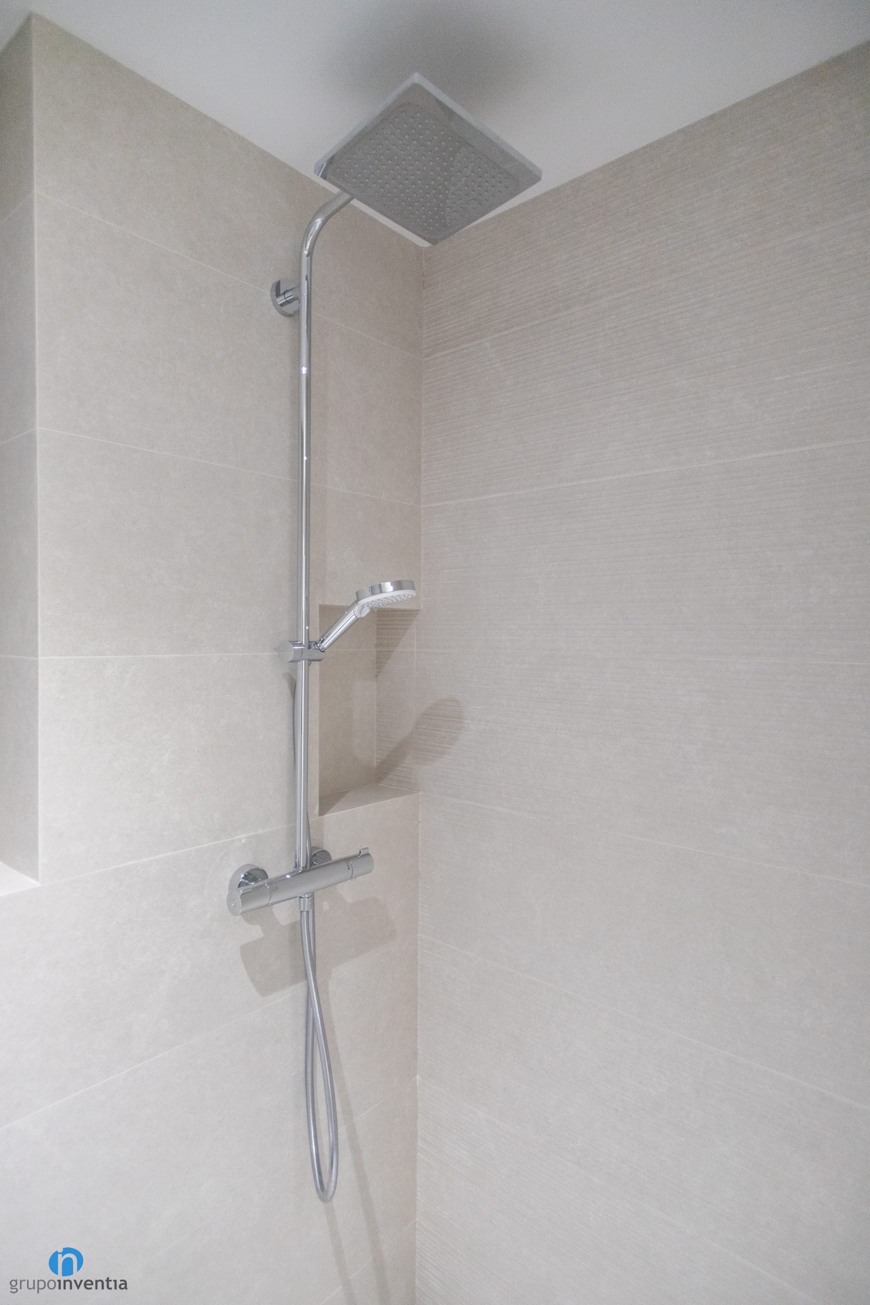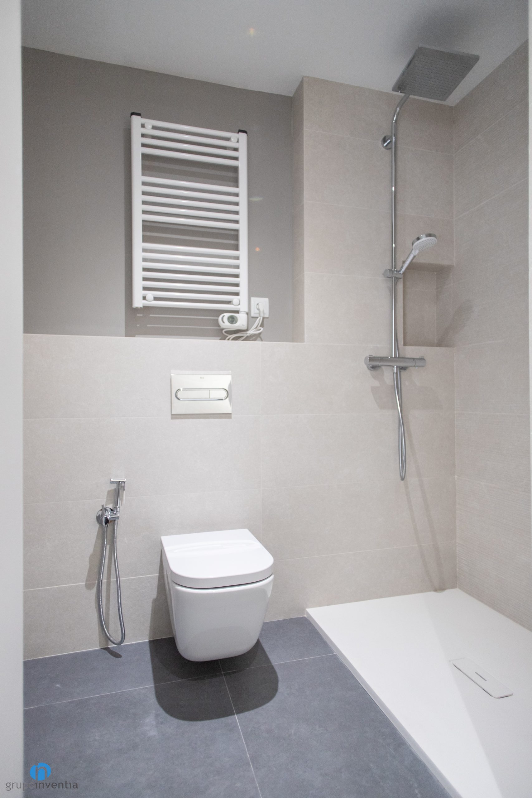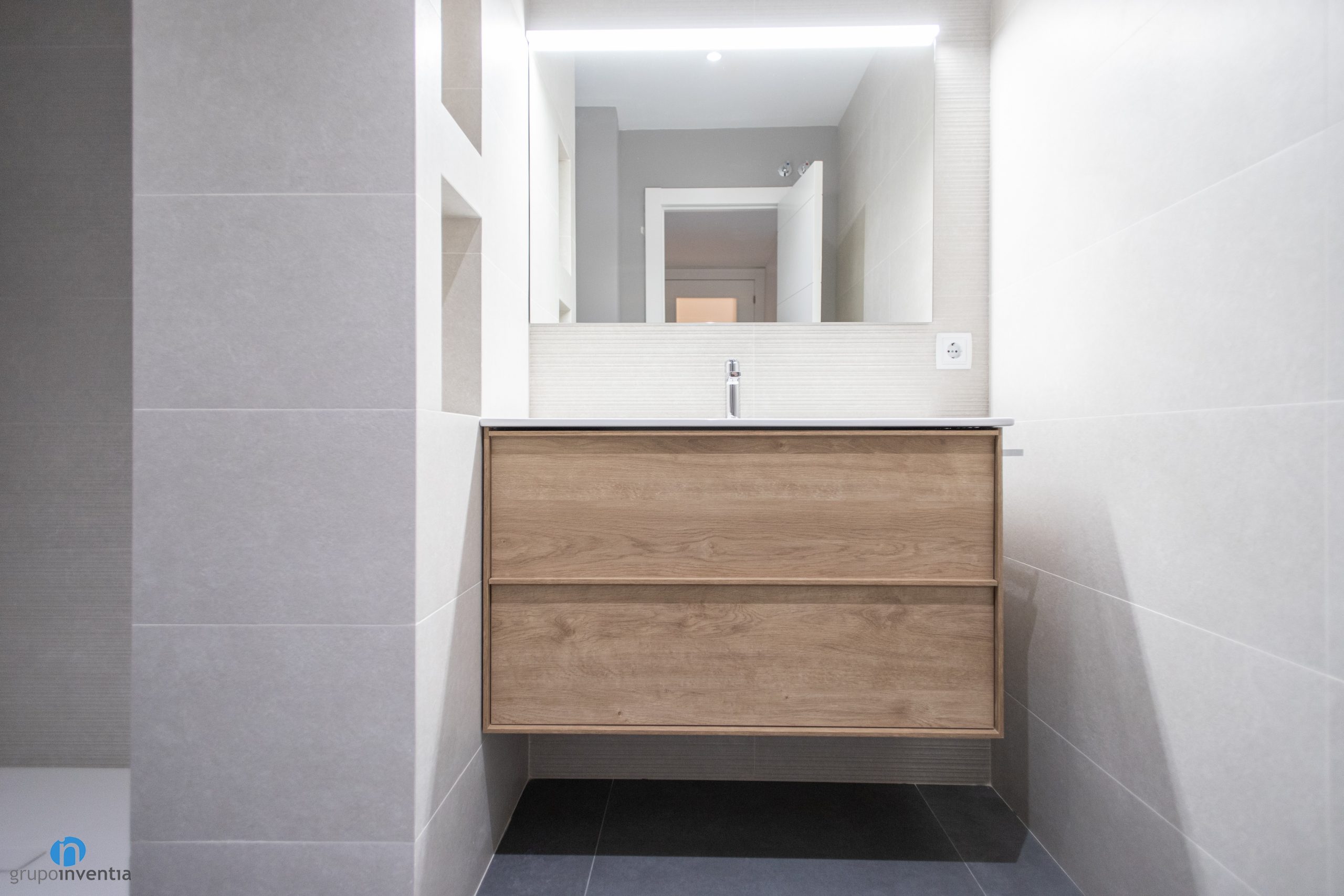 En este trabajo de reforma integral en Barcelona se han renovado por completo dos cuartos de baño. Ahora ambos lucen un aspecto moderno y a través de un alicatado con baldosas beige se han conseguido espacios frescos y agradables. Para el nuevo pavimento se ha optado por baldosas de color gris y también se han introducido acabados en madera con los muebles de baño.