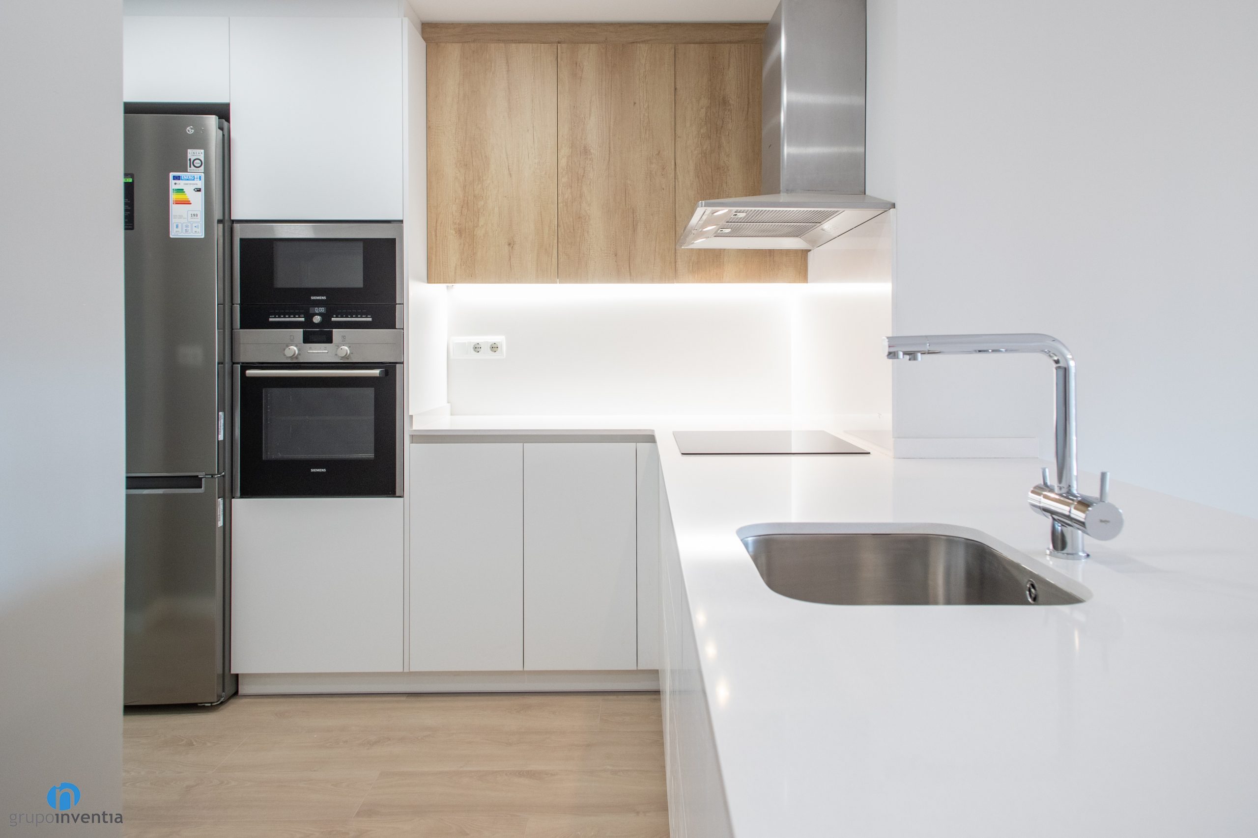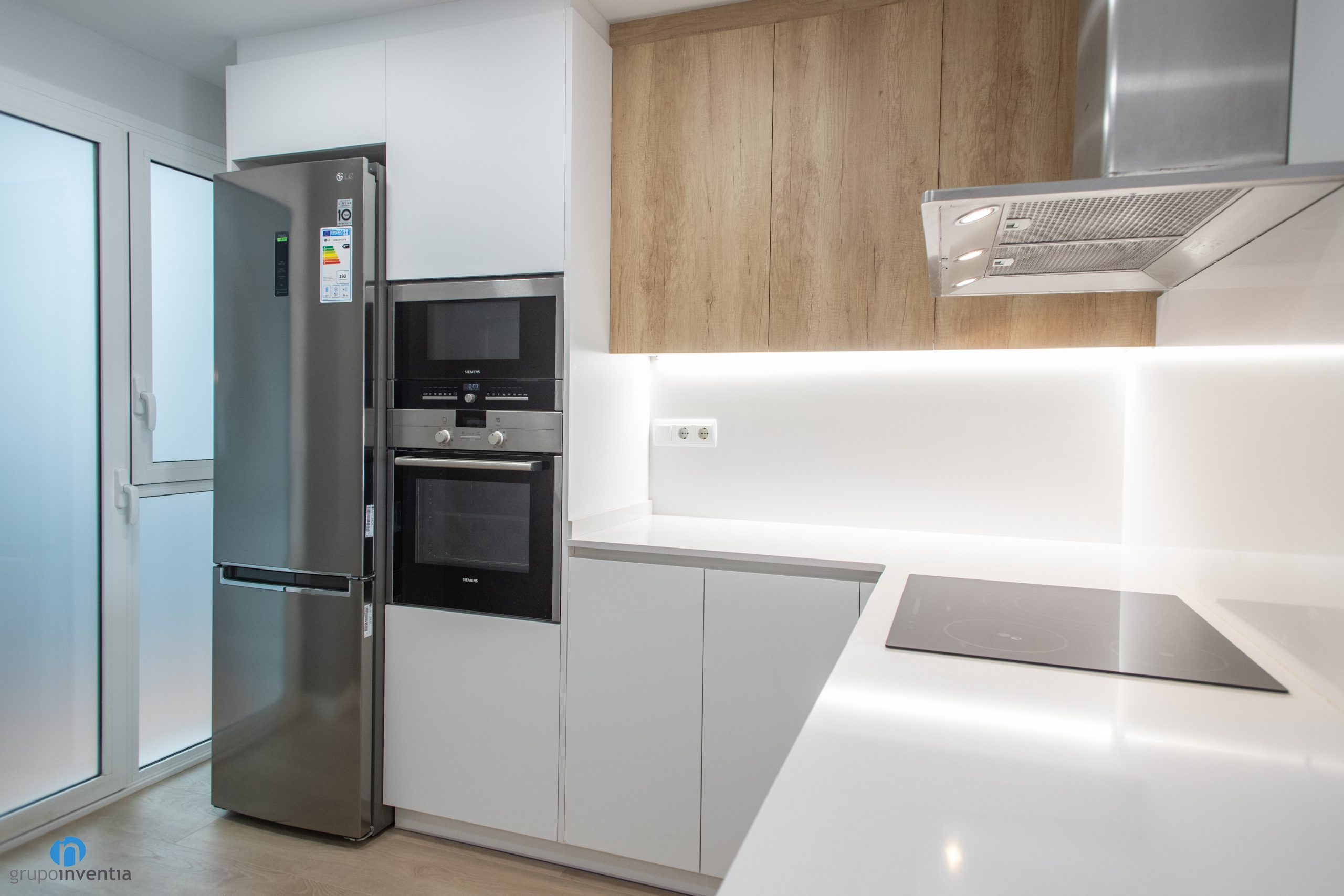 La nueva cocina es de concepto abierto y está distribuida en forma de L. Dadas las características de su espacio está disposición permite una correcta movilidad. Cada nuevo elemento de la cocina se ubica en el lugar indicado para garantizar la mejor funcionalidad. Con esta reforma de cocina se ha dotado al espacio de una amplia superficie de apoyo y de una gran capacidad de almacenaje.