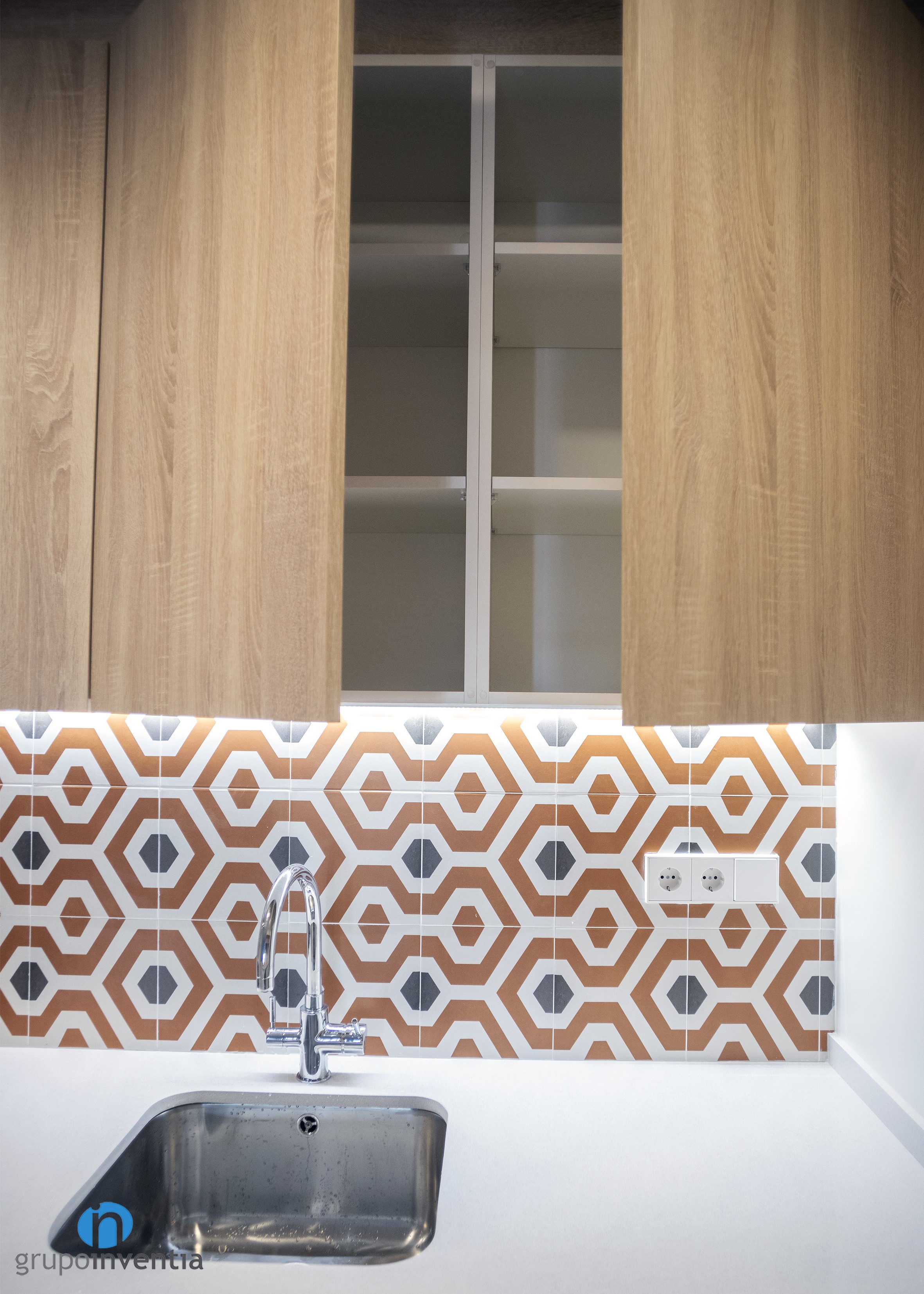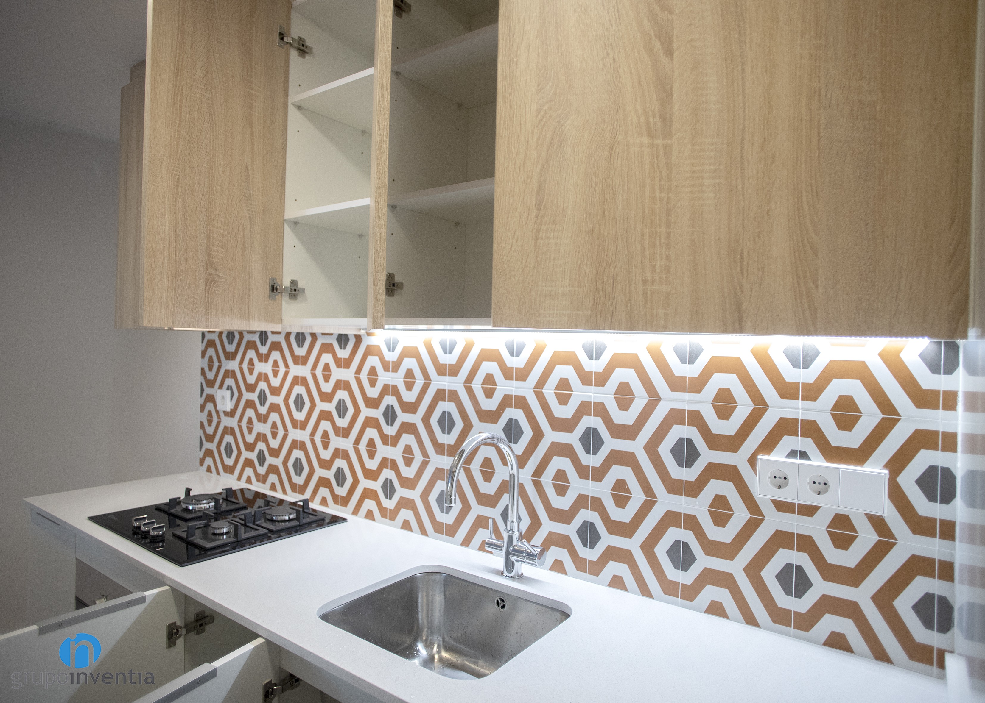 En cuanto al diseño de esta reforma de cocina, destaca el salpicadero, alicatado con azulejos tipo hidráulico que aportan mucho color a la estancia. A su vez, también se amplió la capacidad de almacenaje en la estancia, pues el mueble de cocina cuenta con varios cajones y armarios ubicados tanto en la parte inferior como superior de la encimera.