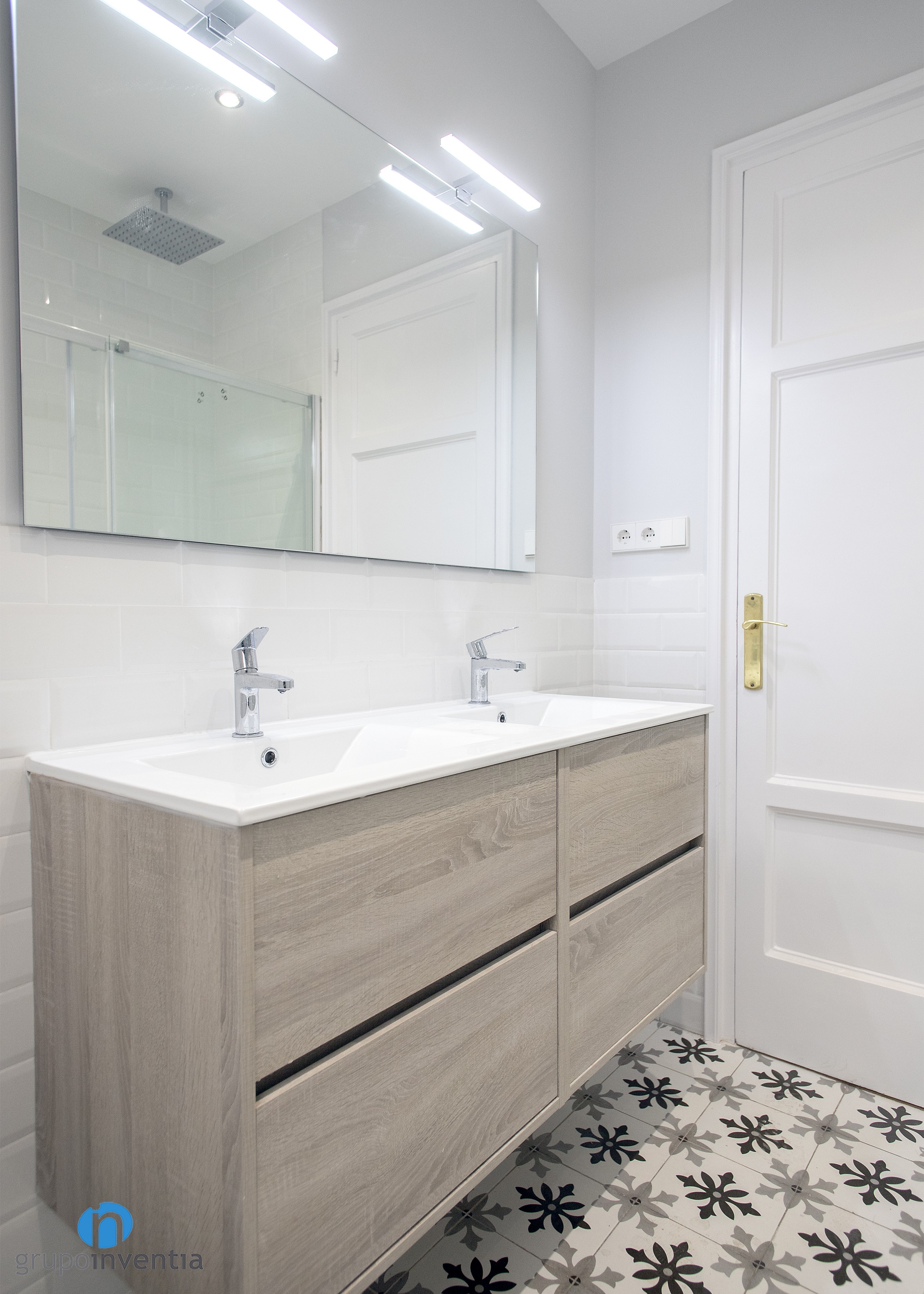 La reforma de baño implicó una gran mejora en el interiorismo de la estancia. Las paredes se alicataron a media altura con azulejos tipo metro de color blanco y se pintó de gris el resto hasta llegar al techo. Estos colores consiguen generar amplitud y luminosidad en la estancia, algo que culmina la personalidad del pavimento hidráulico que se colocó.