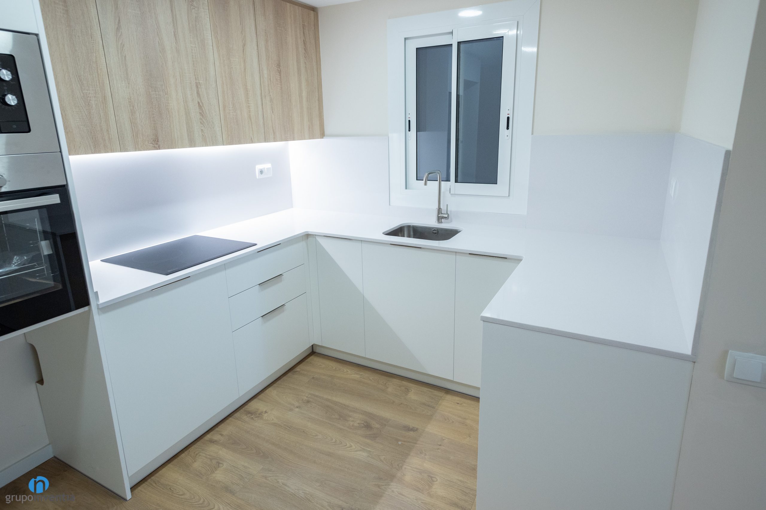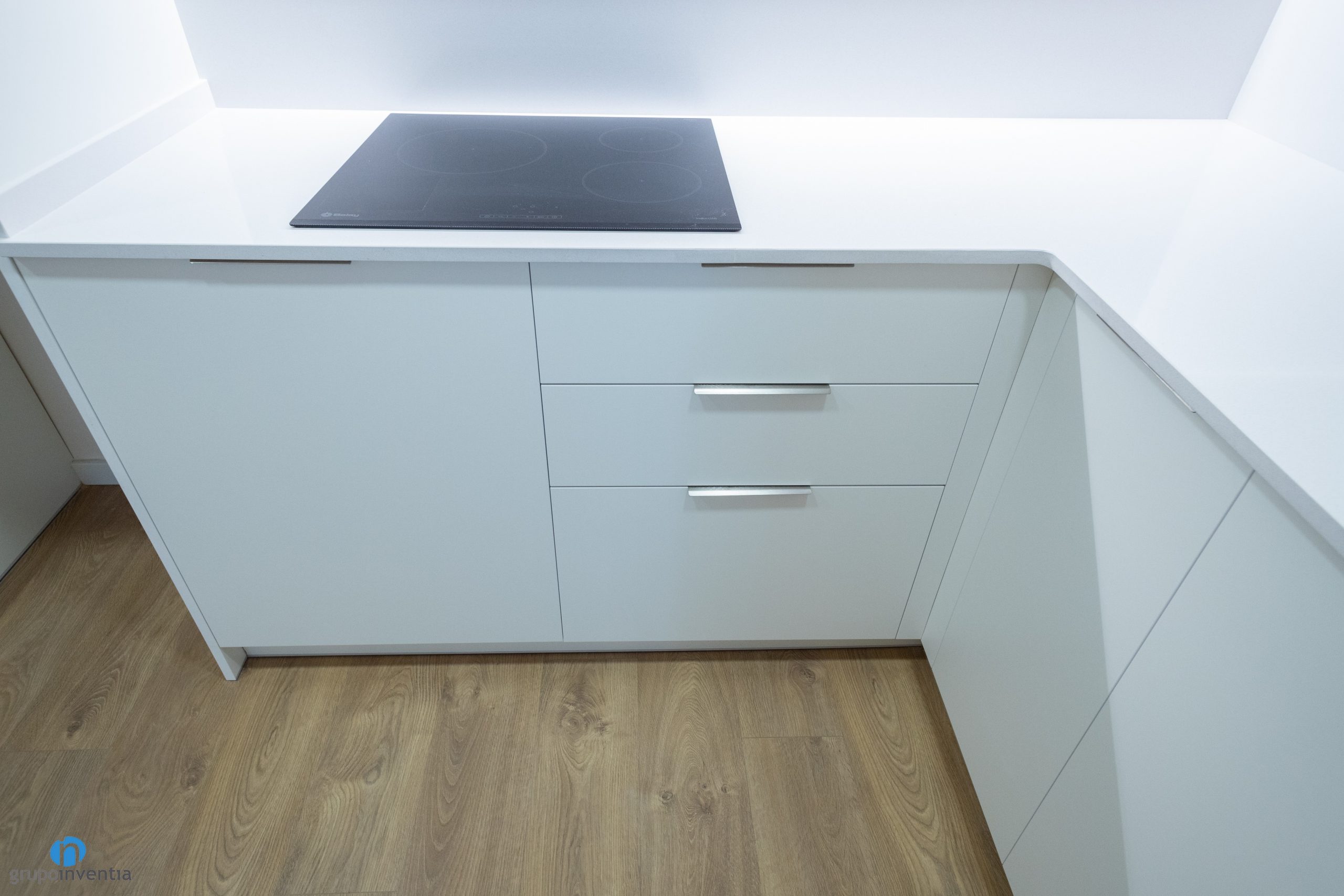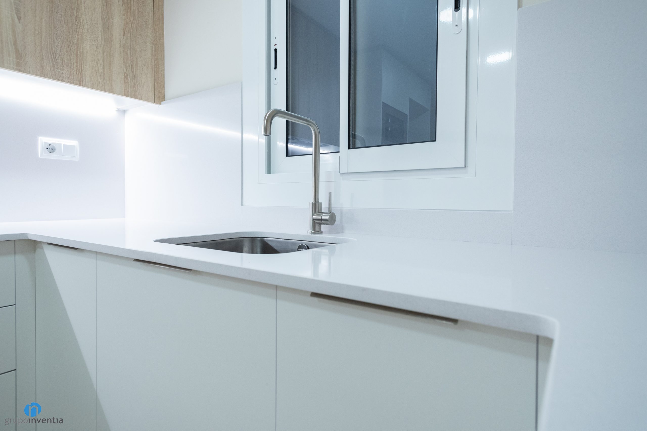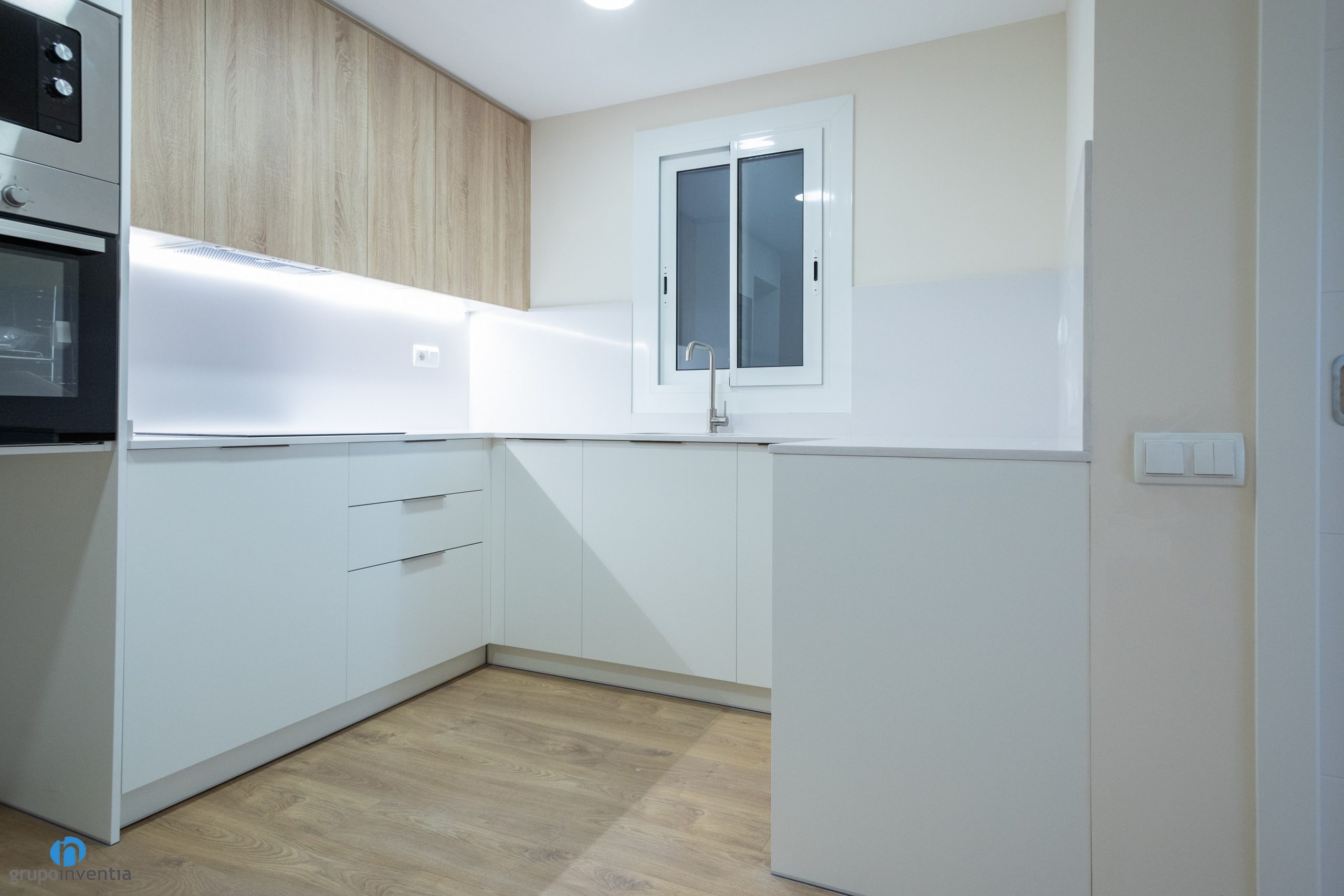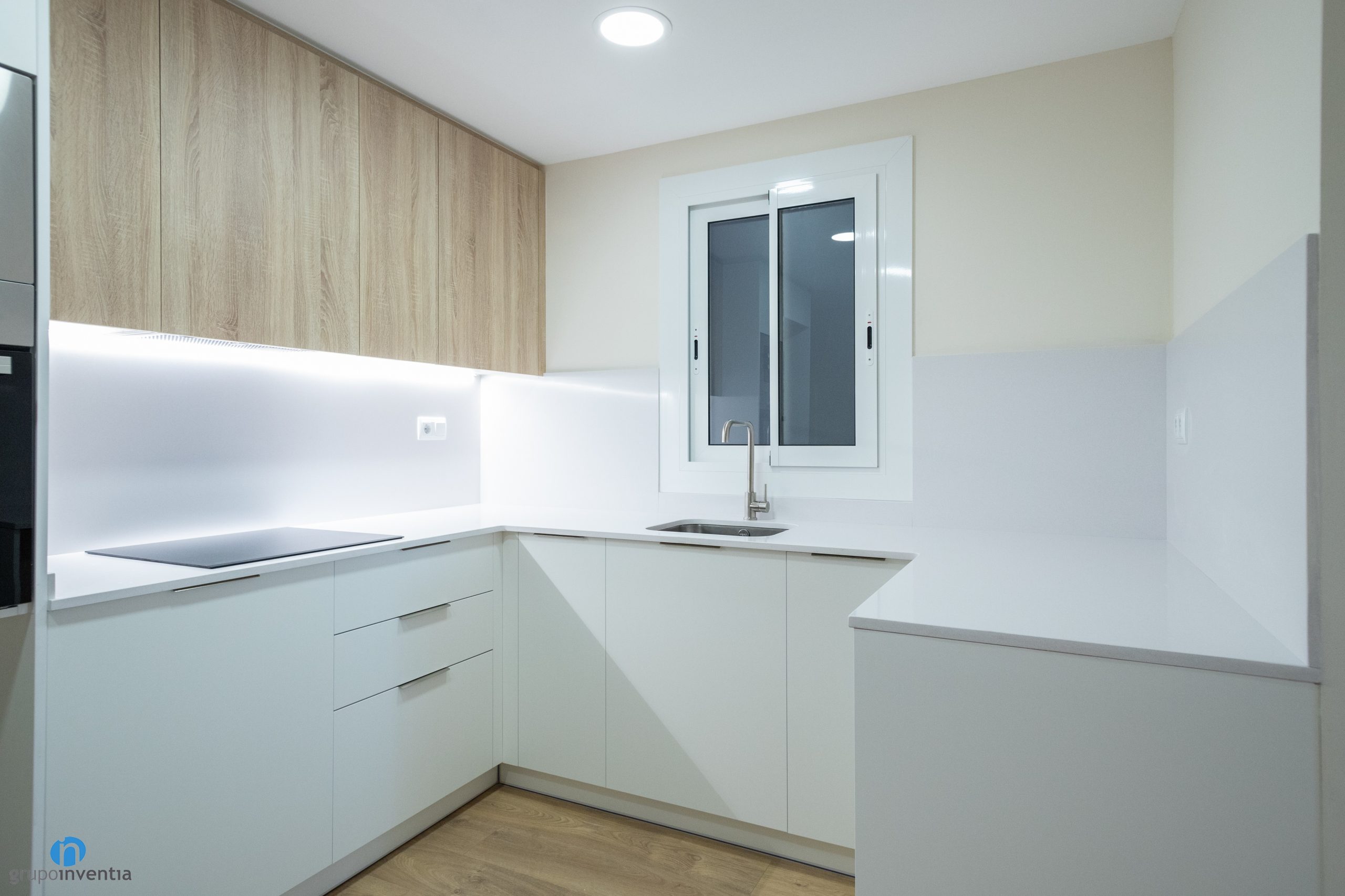 Un espacio que se ha reformado por completo en esta vivienda es la cocina. En Grupo Inventia somos especializas en este tipo de trabajos y podemos adaptarnos a cualquier demanda. De hecho en esta se ha derribado una pared para poder pasar de una cocina independiente a una cocina abierta. Se ha conseguido el objetivo de conectar la cocina al resto de la vivienda.