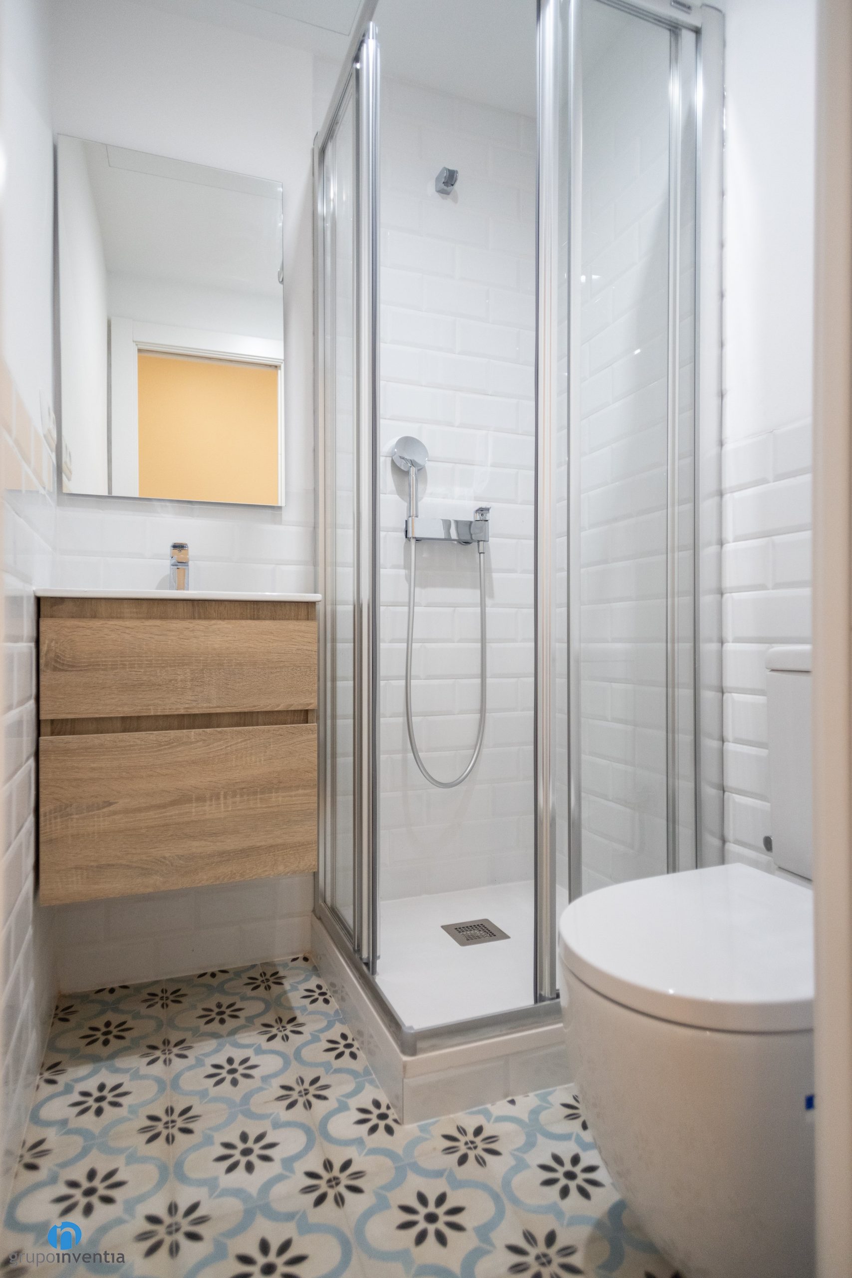 En ambos casos se ha instalado un equipamiento sanitario completo de tres piezas. Una de ellas es el nuevo lavabo con mueble de almacenaje incorporado en su zona inferior. A éste le acompaña un inodoro y una zona de aguas. Para este último elementos se ha optado en los dos casos por un plato de ducha que queda protegido por unas mamparas de puertas correderas.