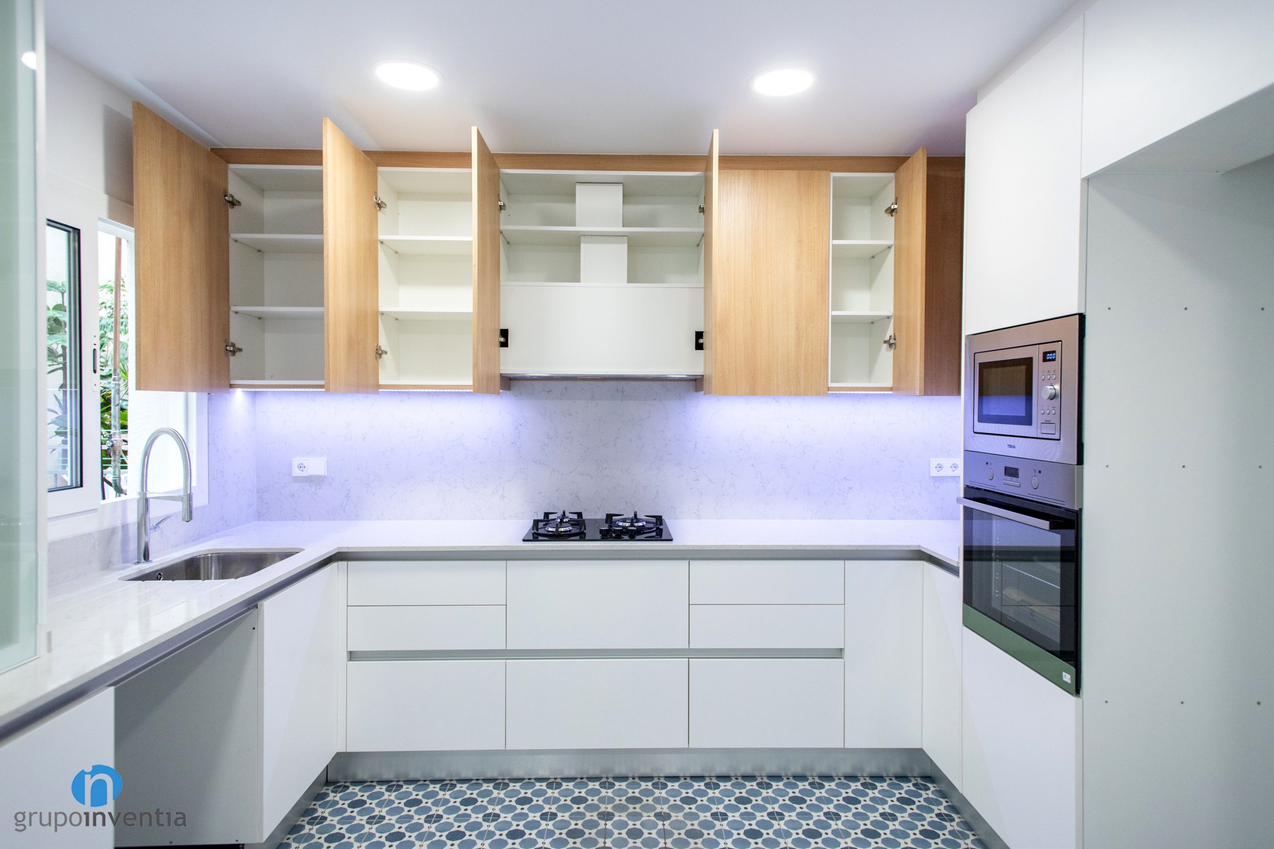 En el extremo de la derecha se ha dispuesto huecos a medida para encastrar la nevera, el horno y el microondas. La parte central la ocupa una alargada encimera que aporta superficie de apoyo y que está equipada con una placa de cocción. En el lado izquierdo también hay una encimera amplia y equipada con el fregadero.