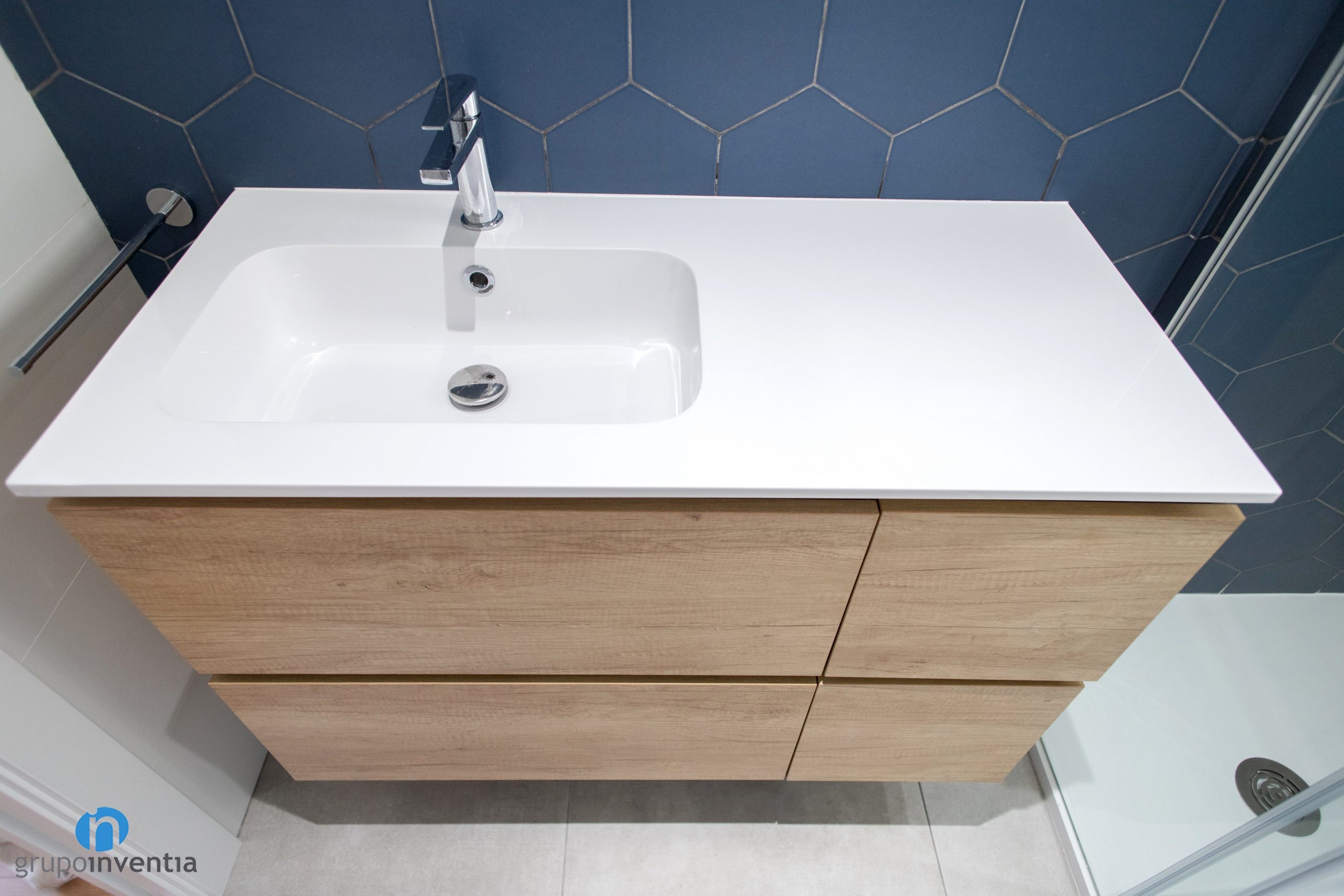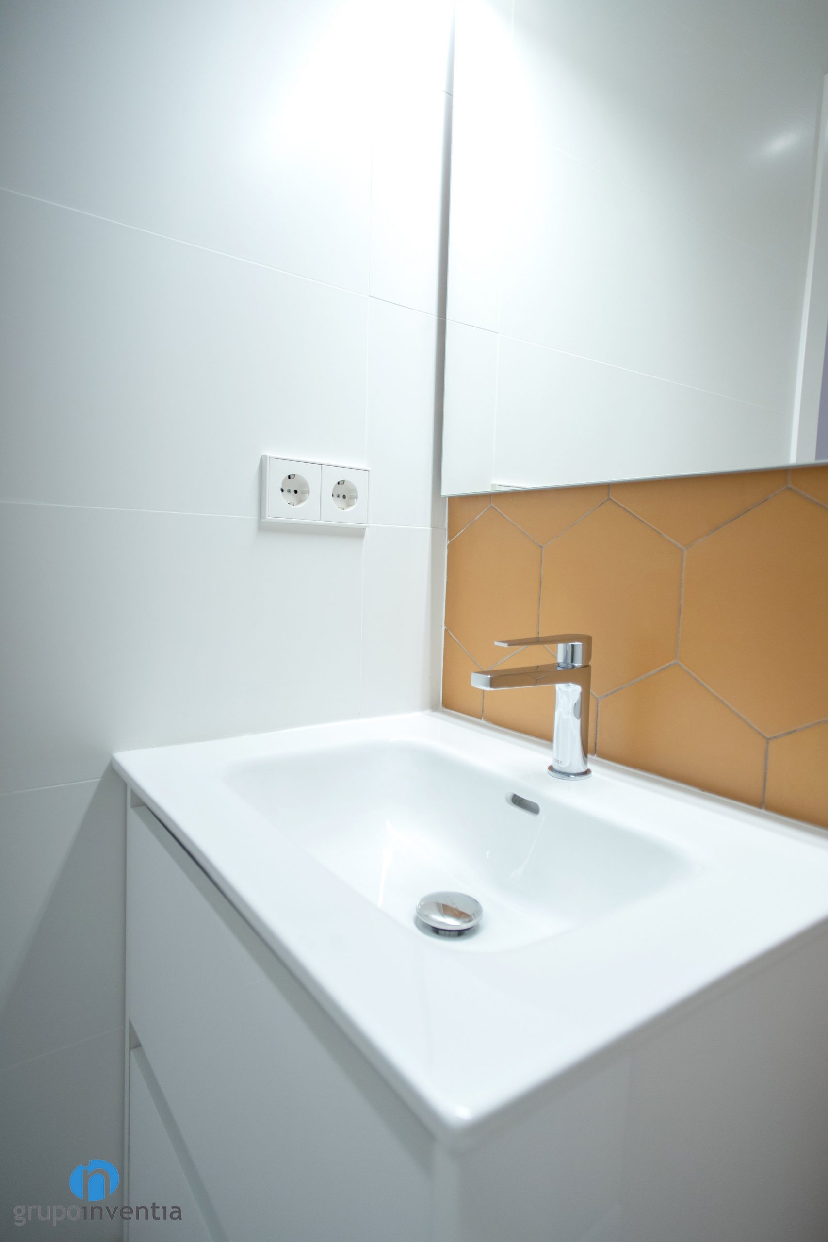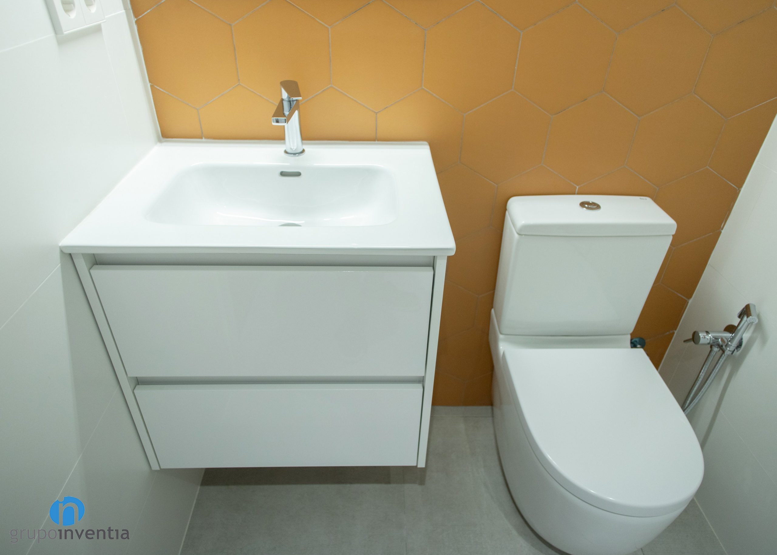 Las paredes se han alicatado por completo. Una diferencia entre ambos es que se ha utilizado un color diferente para alicatar la pared del lavabo. En el baño principal se ha apostado por azulejos hexagonales de color azul. En el baño de cortesía son de la misma forma, aunque de color naranja. Para el nuevo pavimento se ha escogido un suelo de gres gris. Una combinación perfecta entre imagen y practicidad.