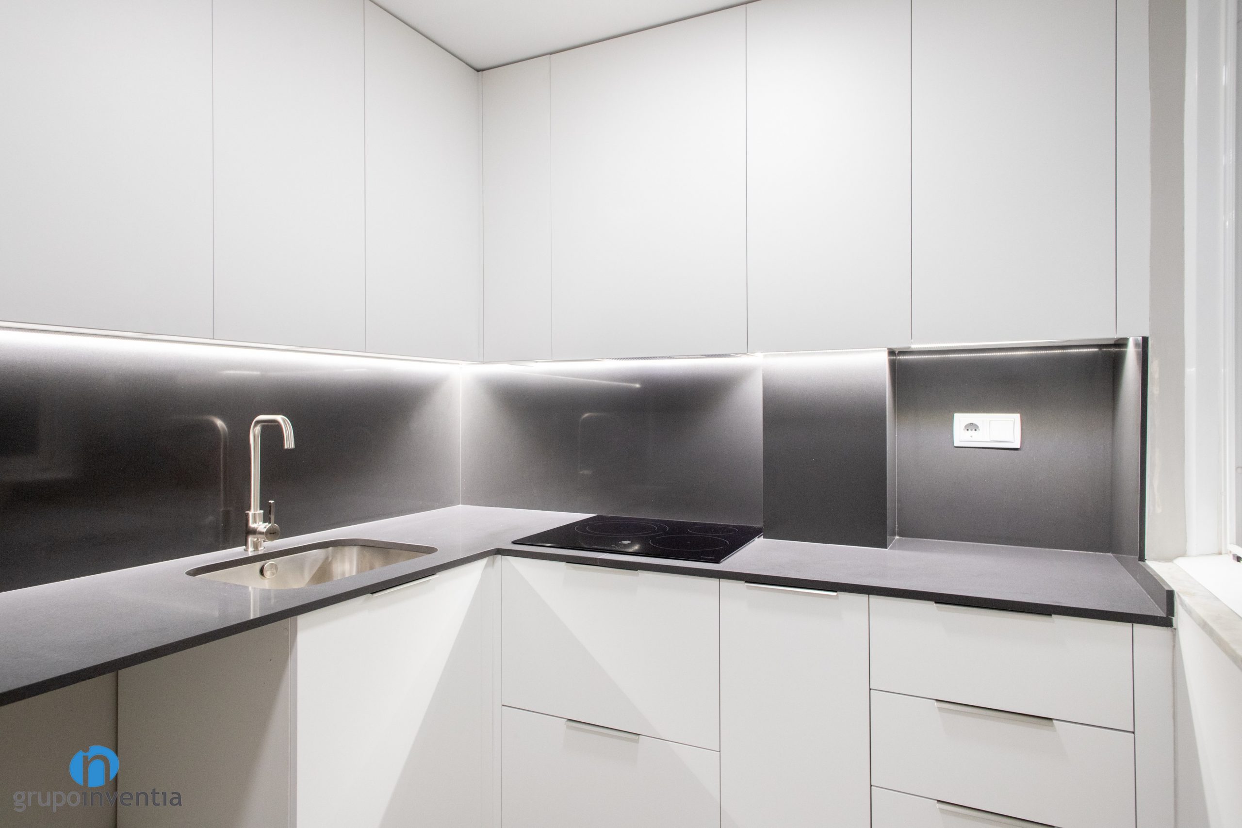 Otra gran mejora de la reforma integral en esta cocina es la ampliación de la capacidad de almacenaje. El mueble de cocina es de color blanco y está presente tanto en la zona inferior como superior de las encimeras. Las superficies de apoyo son de color gris. Se trata de una combinación de colores muy acertadas y que imprime una imagen muy actual en esta reforma de cocina.