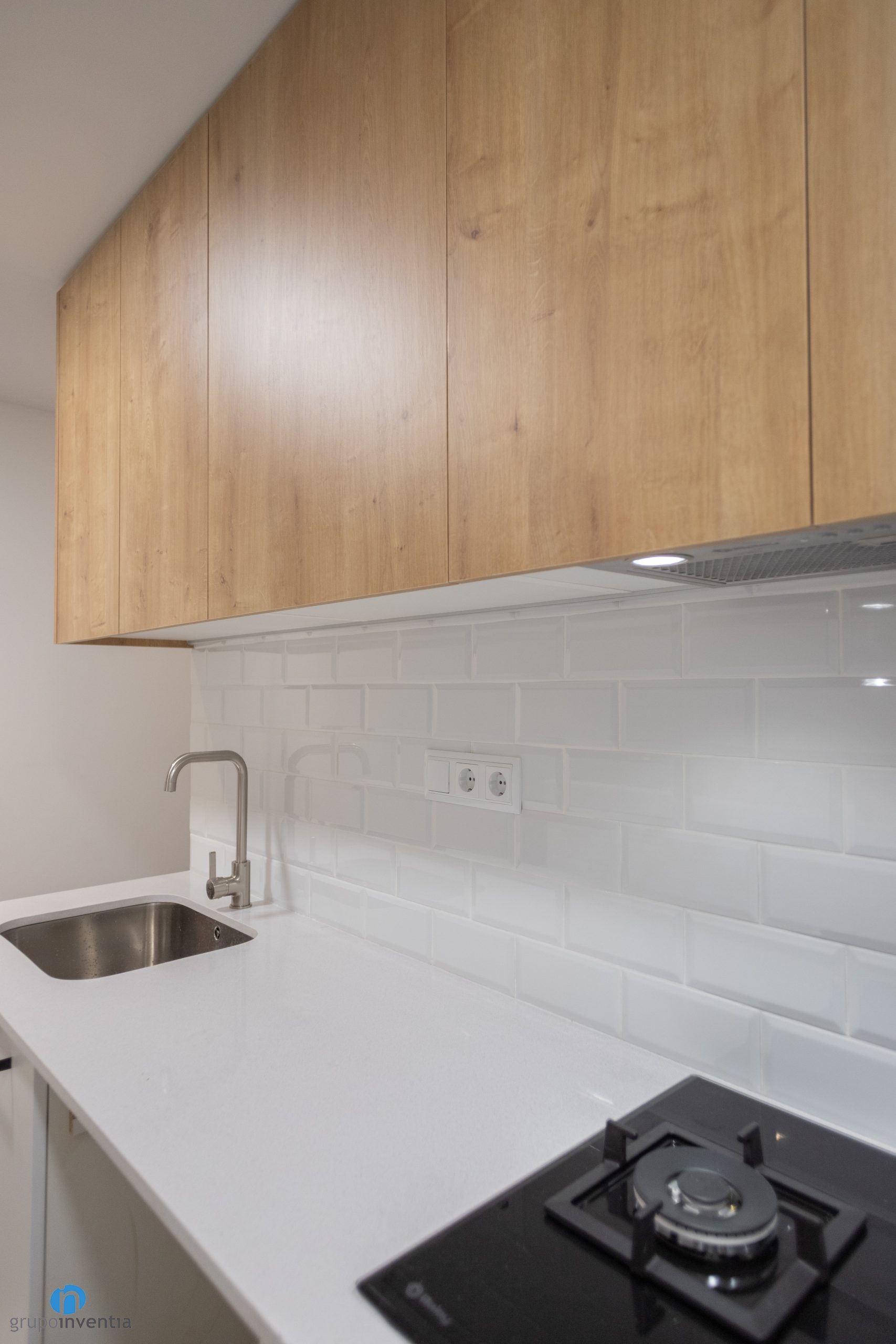 Cuenta con una amplia encimera que aporta un amplio espacio de apoyo y de trabajo. A su vez sobre ella se han instalado un fregadero de un seno y una placa vitrocerámica. En el extremo derecho se han dispuesto huecos a medida para integrar los nuevos electrodomésticos. Concretamente una nevera, un horno y un microondas.