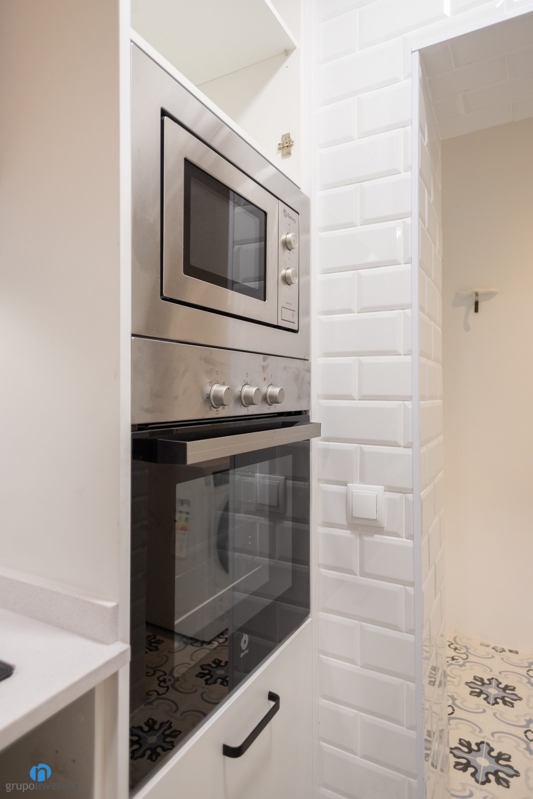 Además de la distribución y el equipamiento en esta reforma de cocina en Barcelona también se ha mejorado la imagen del espacio. La cocina cuenta con compartimentos para el almacenaje tanto en la parte baja como alta. El mueble de la zona inferior se presenta con un acabado en blanco mate al igual que la encimera. Cuenta con un hueco a medida para integral un lavavajillas y los tiradores de los cajones y armarios son de color negro.