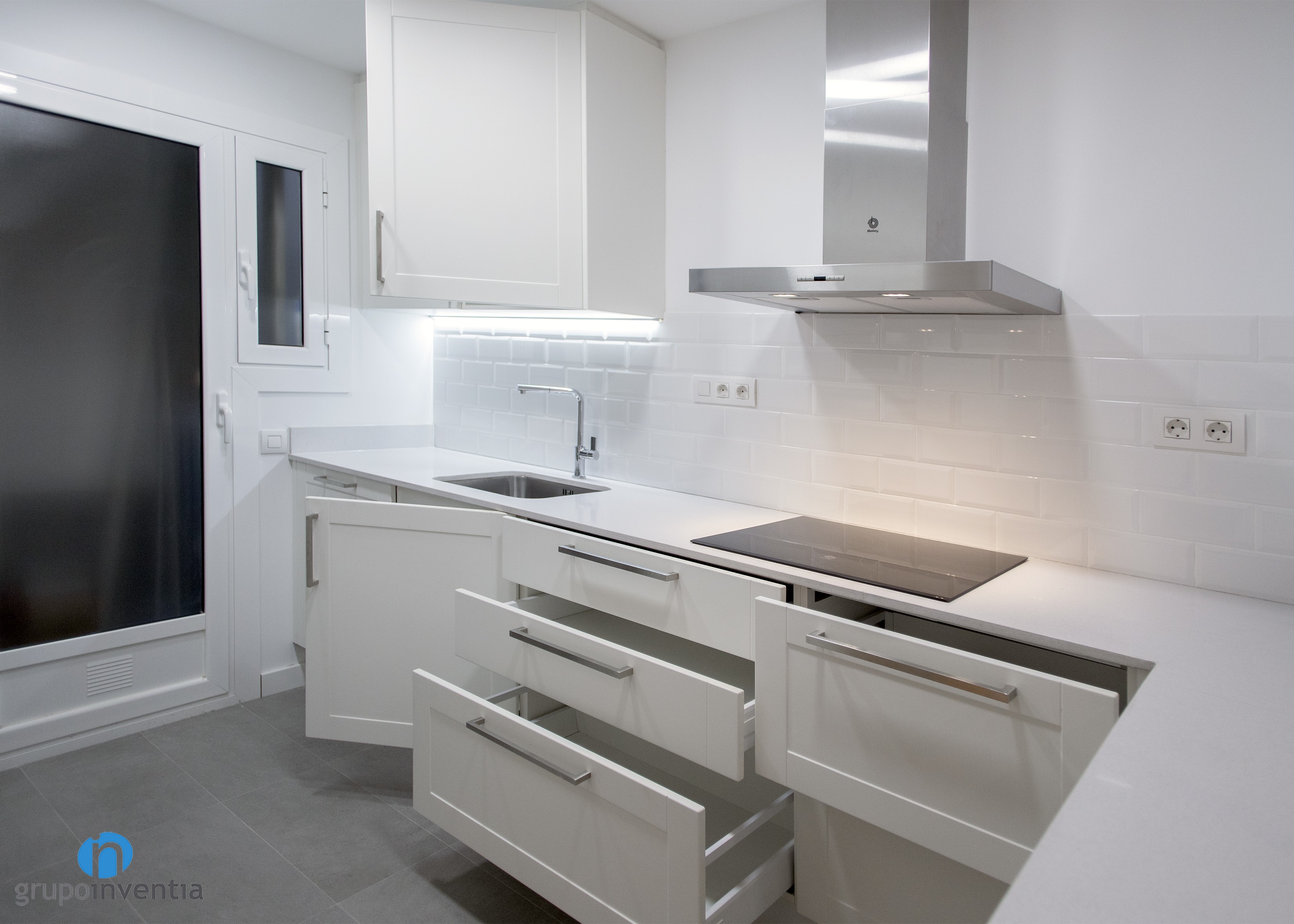 Tras la reforma, la cocina presenta una imagen muy contemporánea en la que el blanco es el protagonista principal. Éste color se utiliza en el mueble de cocina, las encimeras y las paredes. Con ello se consigue una estancia luminosa y amplia visualmente en la que también tienen cabida otras tonalidades como el gris del suelo o el acabado en acero inoxidable de los electrodomésticos.