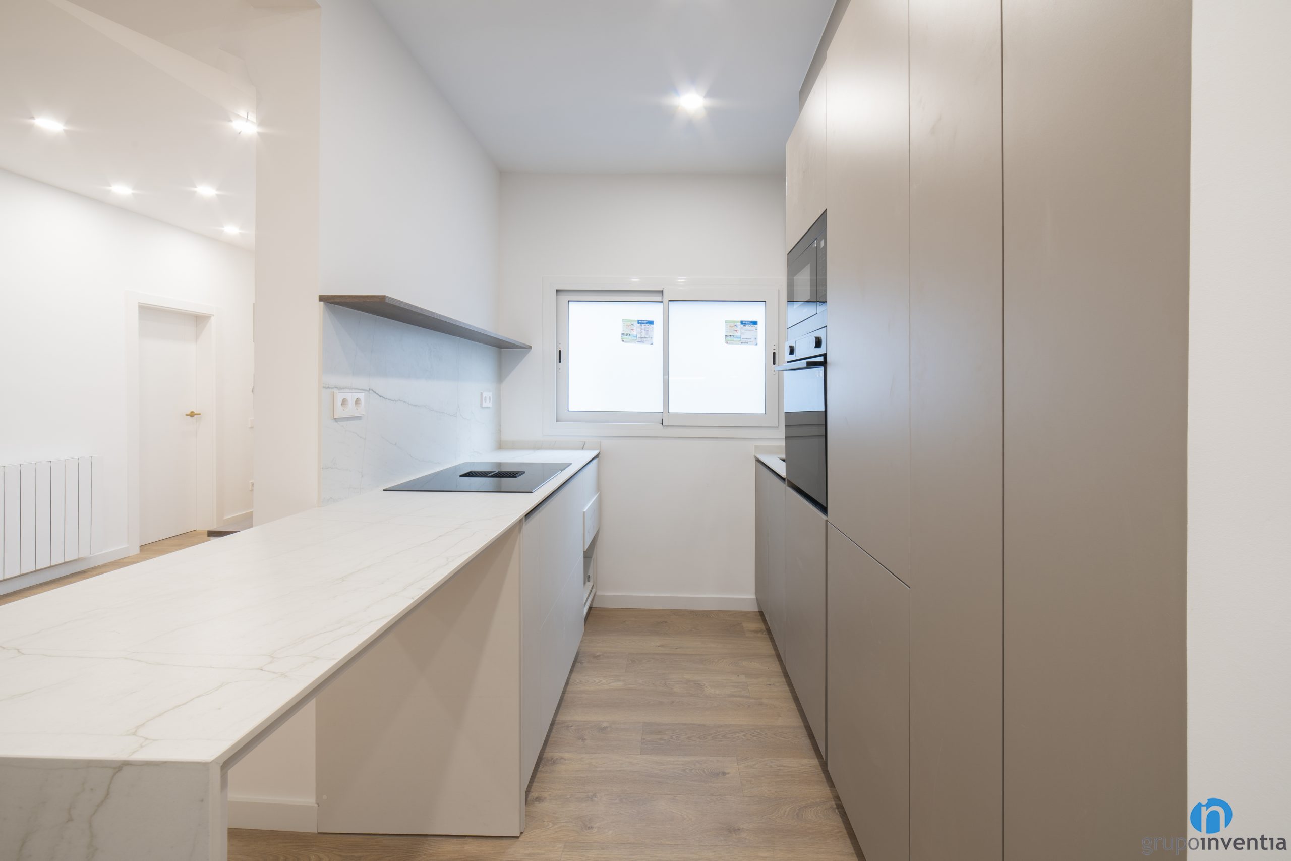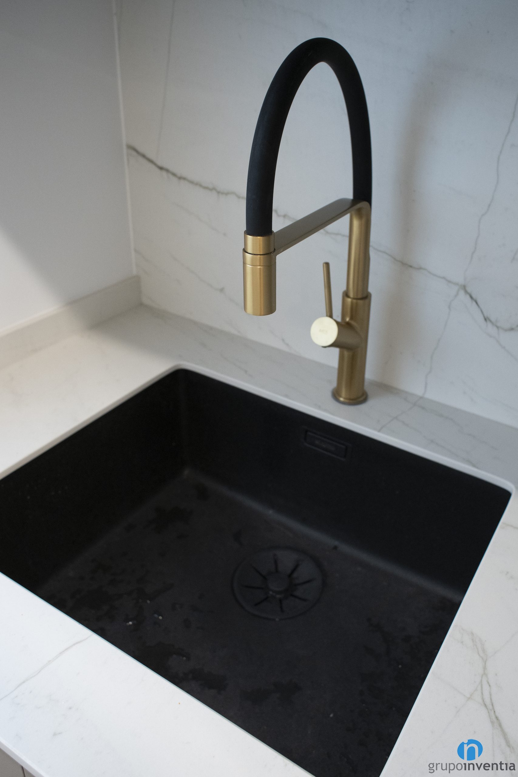 En el lado derecho de esta reforma de cocina hemos integrado los electrodomésticos. Hay espacio para un horno, un microondas, una nevera y un lavavajillas. Los dos últimos quedan camuflados por las puertas del armario de cocina generando mayor continuidad en el diseño de cocina. También cuenta con una encimera equipada con un fregadero de un seno.