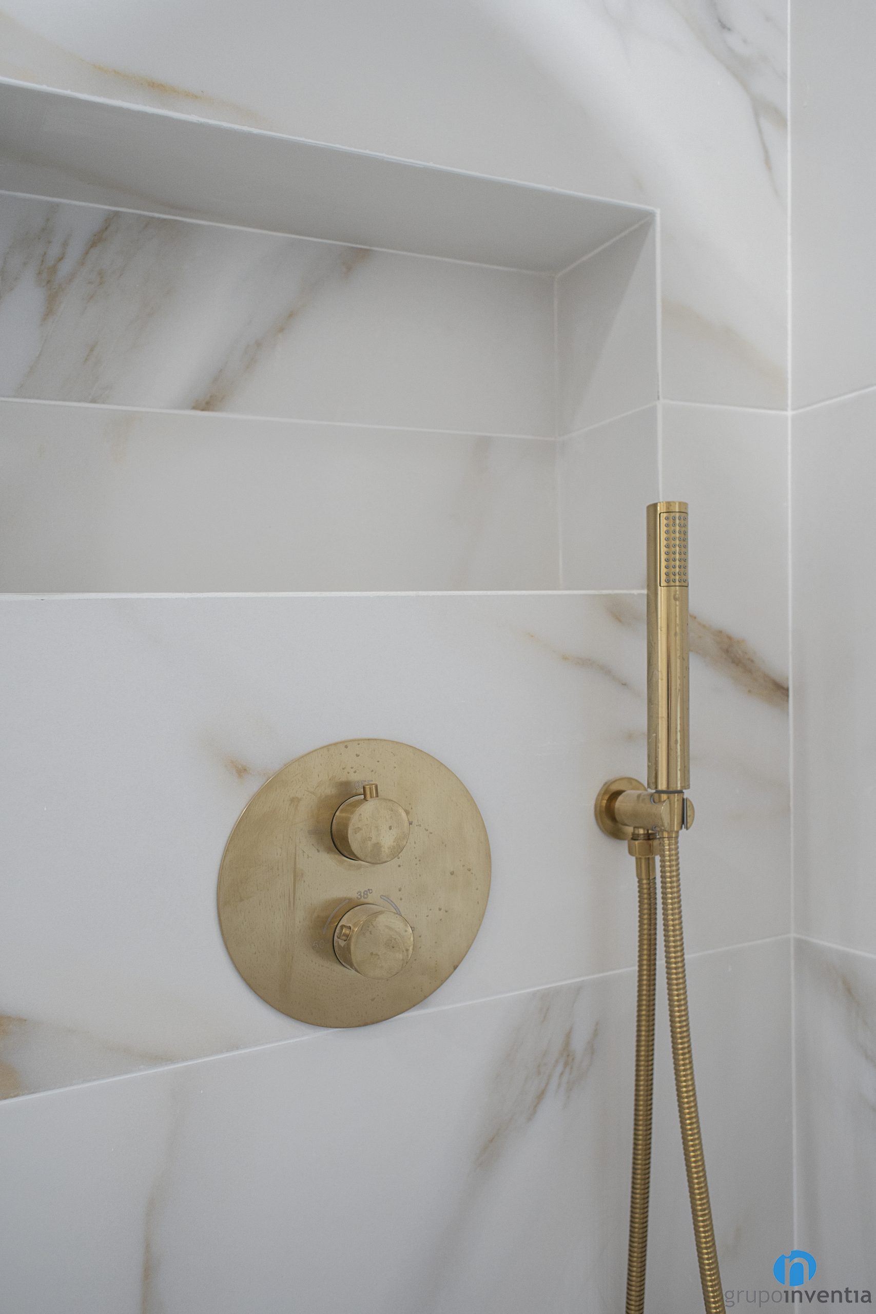 En cuanto al aseo, dispone de un lavabo y un inodoro flotantes. Para la nueva imagen de esta reforma de baños también hemos optado por un diseño interior contemporáneo acorde a la imagen global. Las paredes del baño principal las hemos alicatado con azulejos de acabado en mármol y el aseo con baldosas beige. En los dos casos hemos reservado una pared para alicatarla con azulejos de color marrón y de diseño lineal.