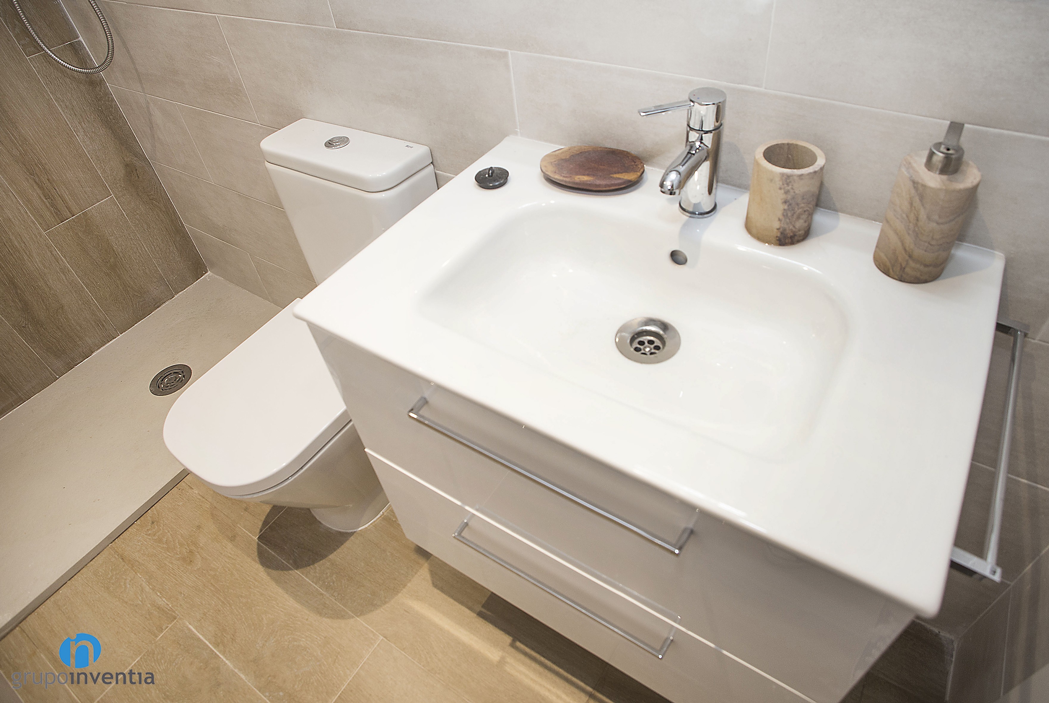 Este se trata de un cuarto de baño de tres piezas compuesto por un lavabo con cajonera incorporada, un inodoro y, en el fondo de la estancia, una amplia ducha.