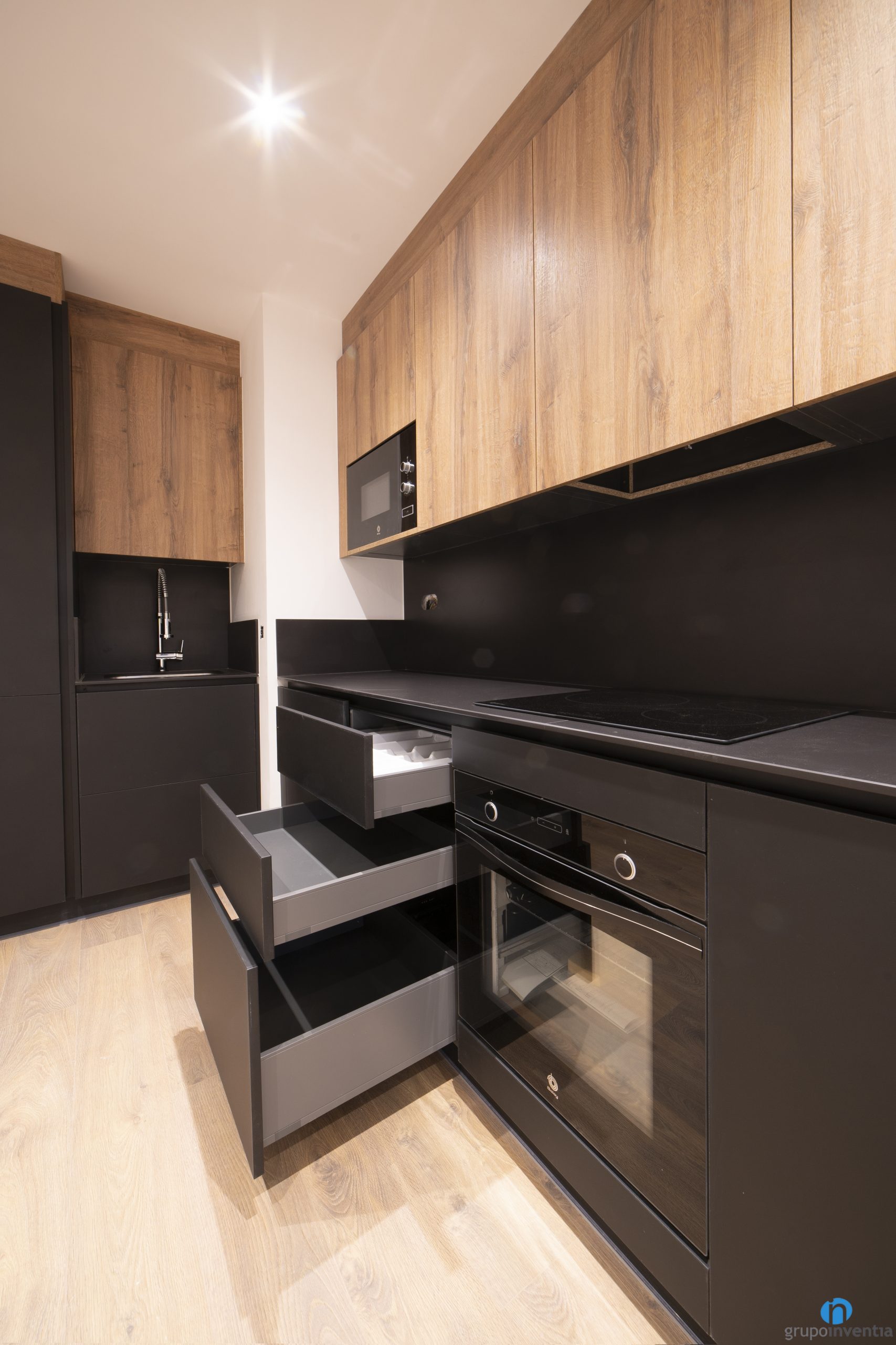 Hemos aprovechado estas partes del mueble de cocina de color negro para integrar el horno, en la parte baja, y el microondas, en los armarios superiores. Se trata de una cocina funcional y que se integra perfectamente en el resto de la vivienda. Además, también queda conectada de manera fluida con otras zonas como el comedor y la sala de estar.