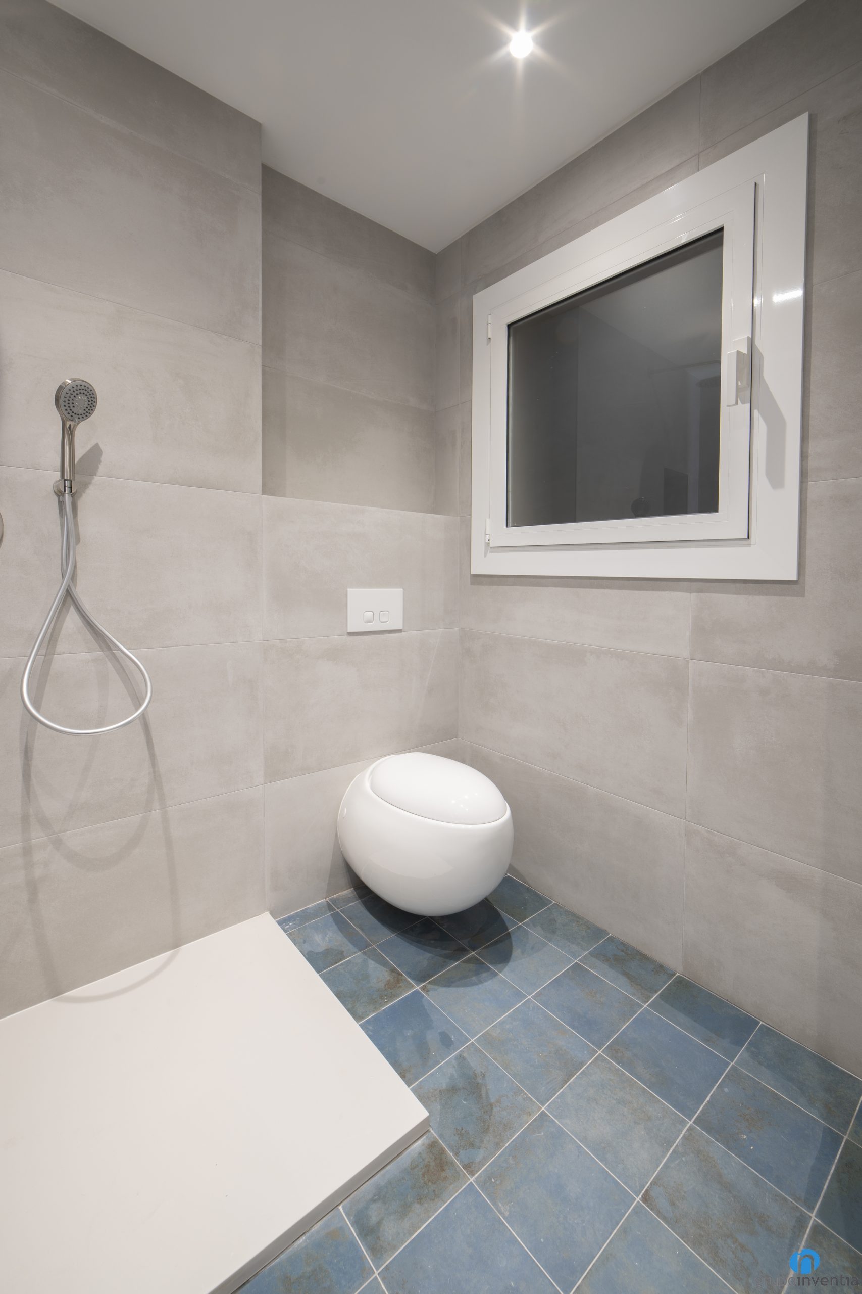 También hemos hecho la reforma de baño, instalando un equipamiento sanitario personalizado. El lavabo es de sobre encimera y tiene forma de piedra. Es grande y se integra perfectamente en el diseño de baño. También destaca el nuevo inodoro con forma de cápsula y con la cisterna oculta en la pared. Les acompaña un plato de ducha a ras de suelo de forma cuadrada.