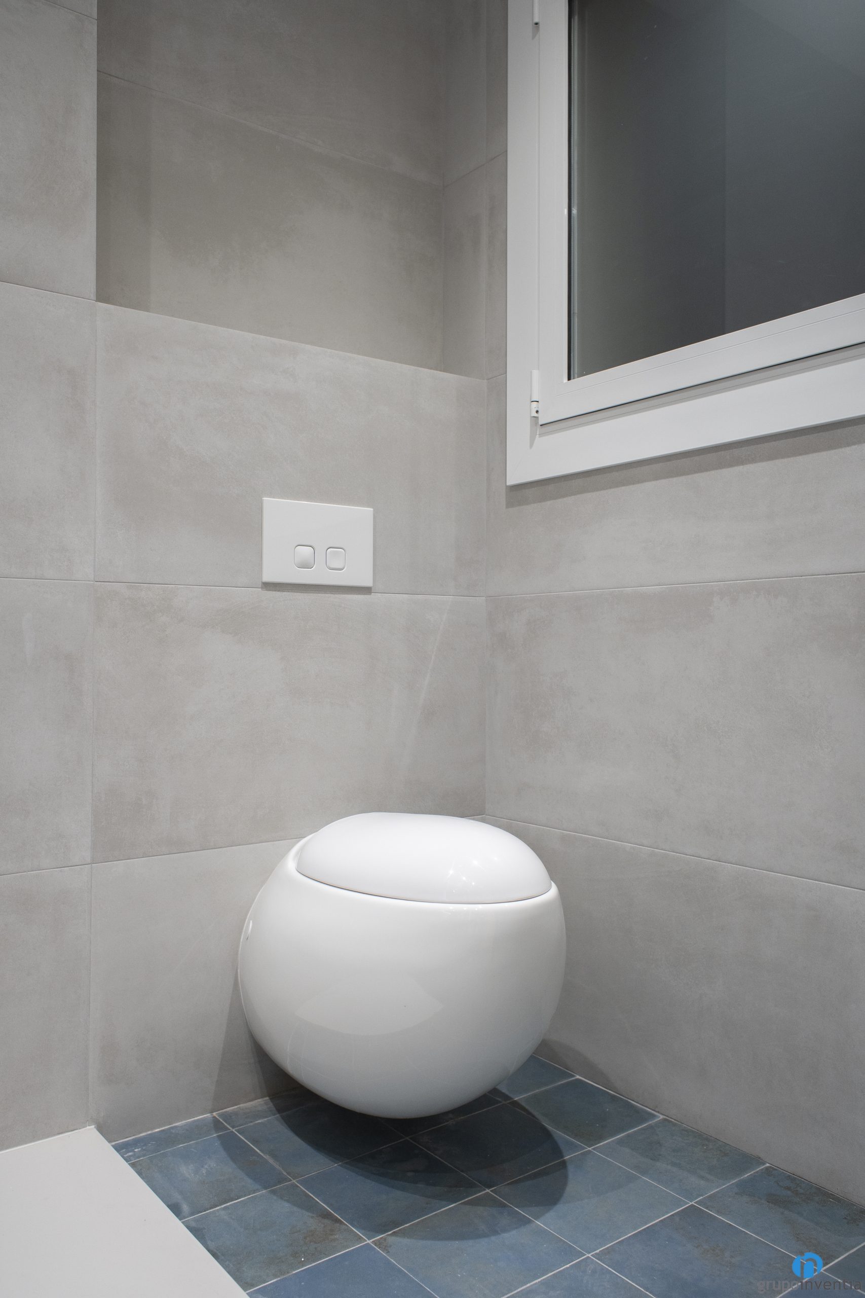 Se trata de un baño muy bien equipado y con un diseño contemporáneo y agradable. Hemos alicatado las paredes por completo con azulejos de acabado gris. De este modo hemos potenciado la sensación de luminosidad y amplitud visual. Para el pavimento hemos utilizado baldosas de color azul con efecto desgaste que aportan mucha personalidad.