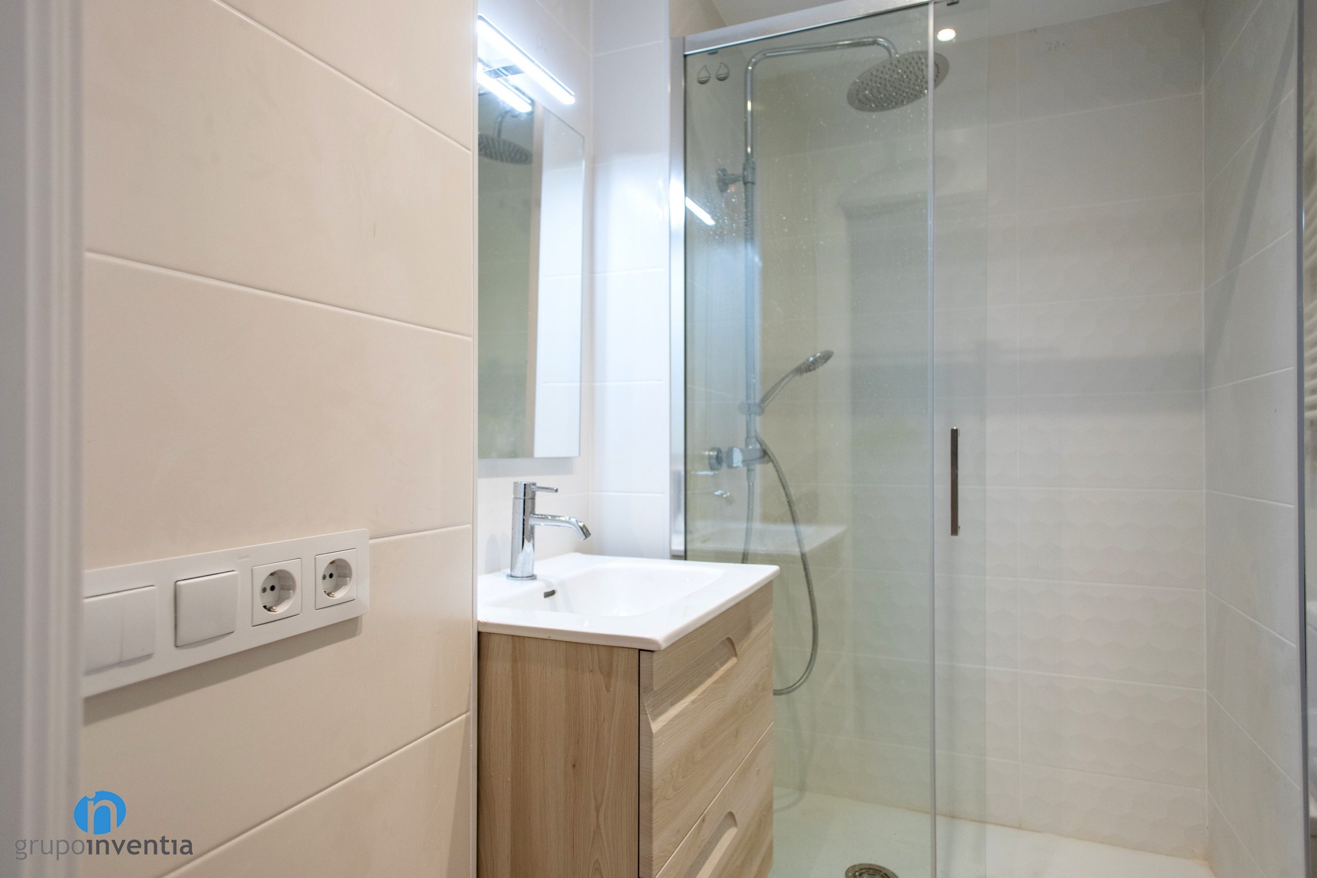 Esta reforma integral en Barcelona también a conllevado la renovación completa del cuarto de baño. Se ha cambiado todo el equipamiento sanitario y ahora el baño cuenta con piezas modernas y listas para ofrecer las mejores prestaciones. Se compone de un lavabo con mueble de almacenaje incorporado, una pareja de inodoro y bidet y un plato de ducha. Este último se protege con una mampara de puertas correderas transparentes.