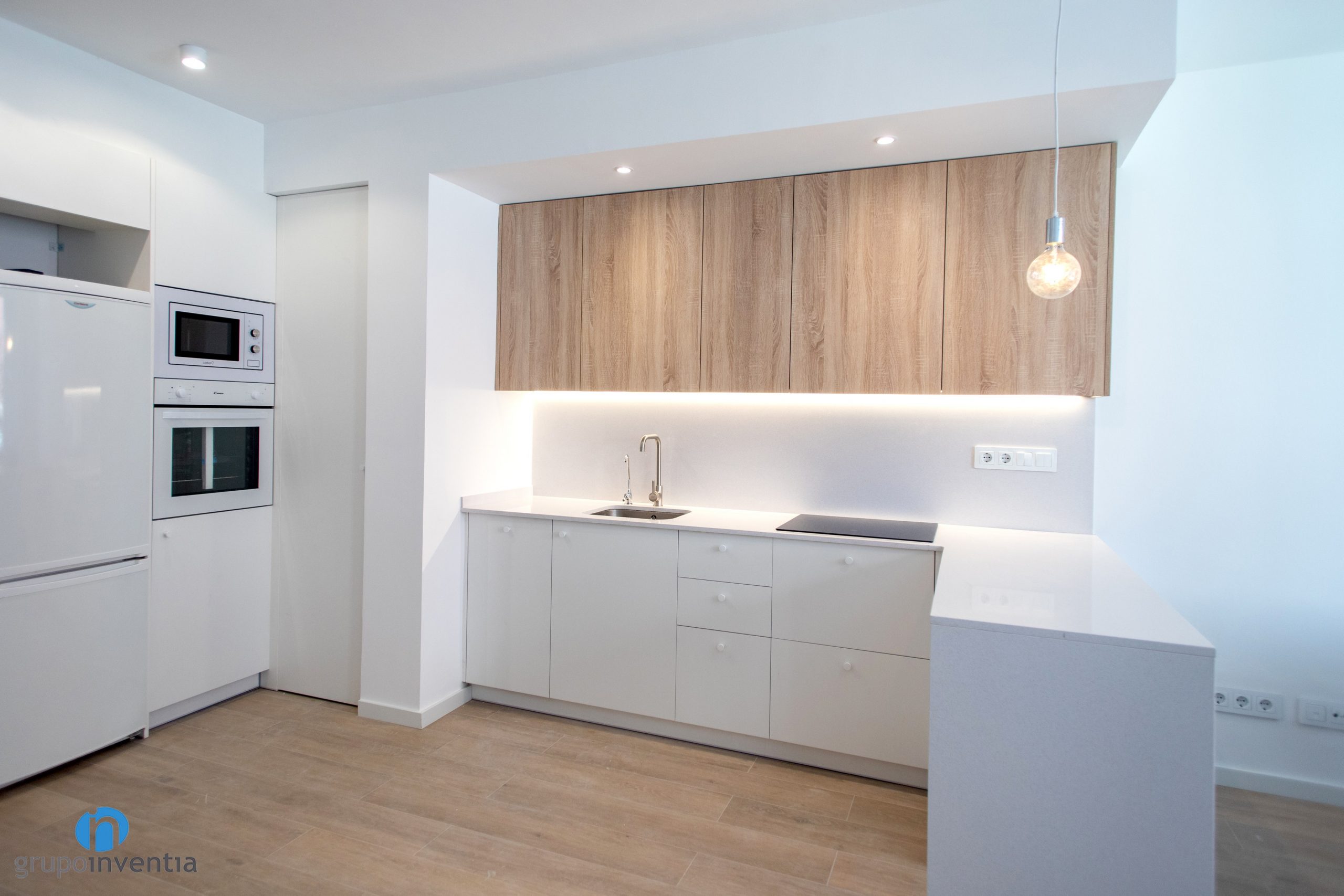 Nos encontramos con una cocina de concepto abierto y que está distribuida en forma de U. Se ha reformado con la idea de conseguir una movilidad correcta y un uso funcional. De este modo en el lado derecho se han encastrado la nevera, el horno y el microondas. Todos estos electrodomésticos tienen acabado en color blanco.