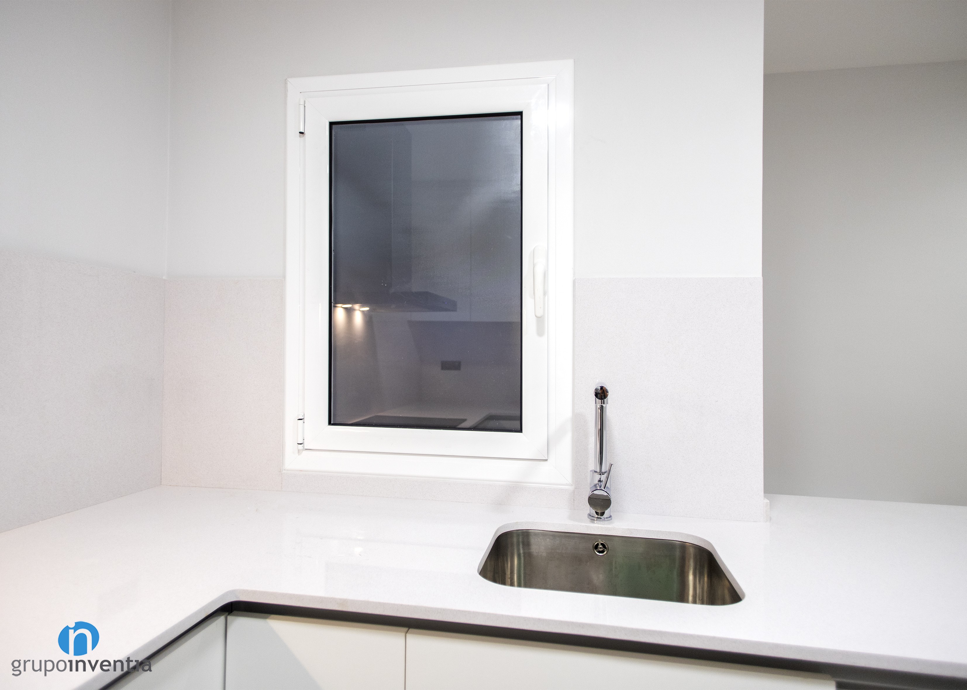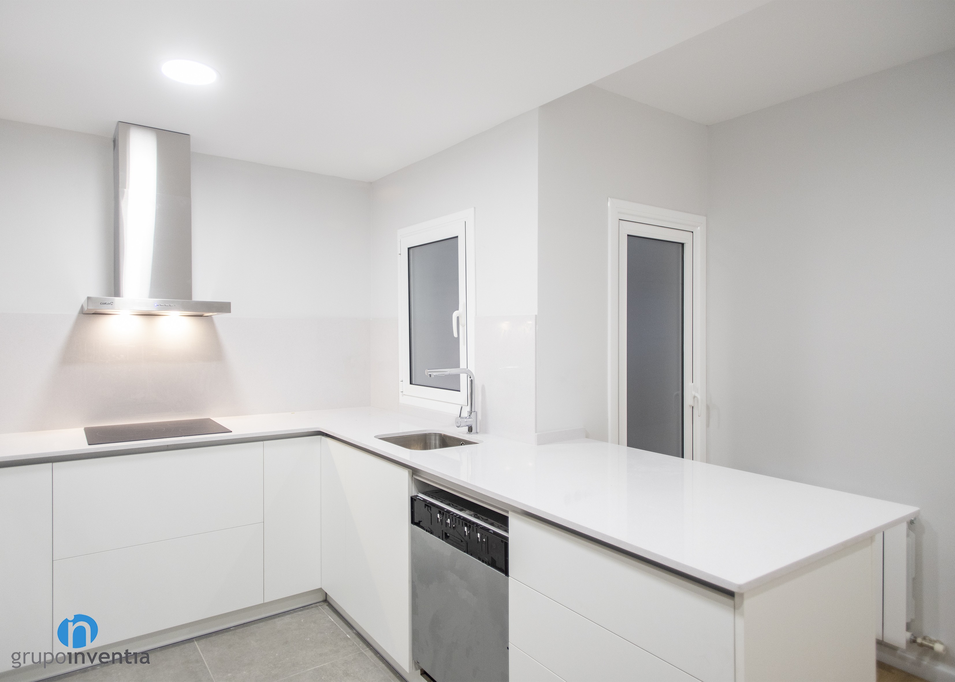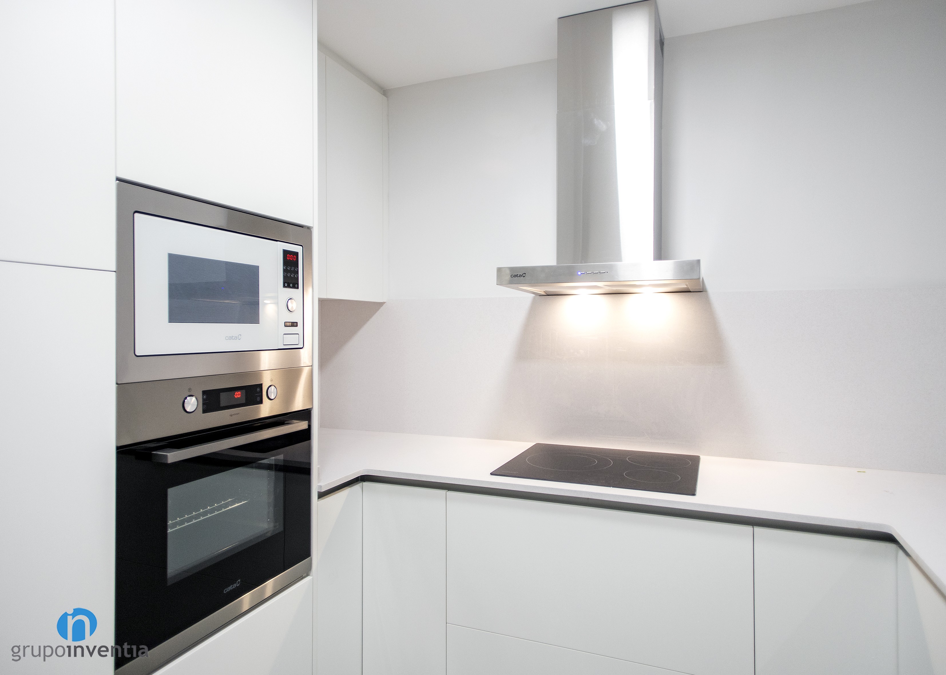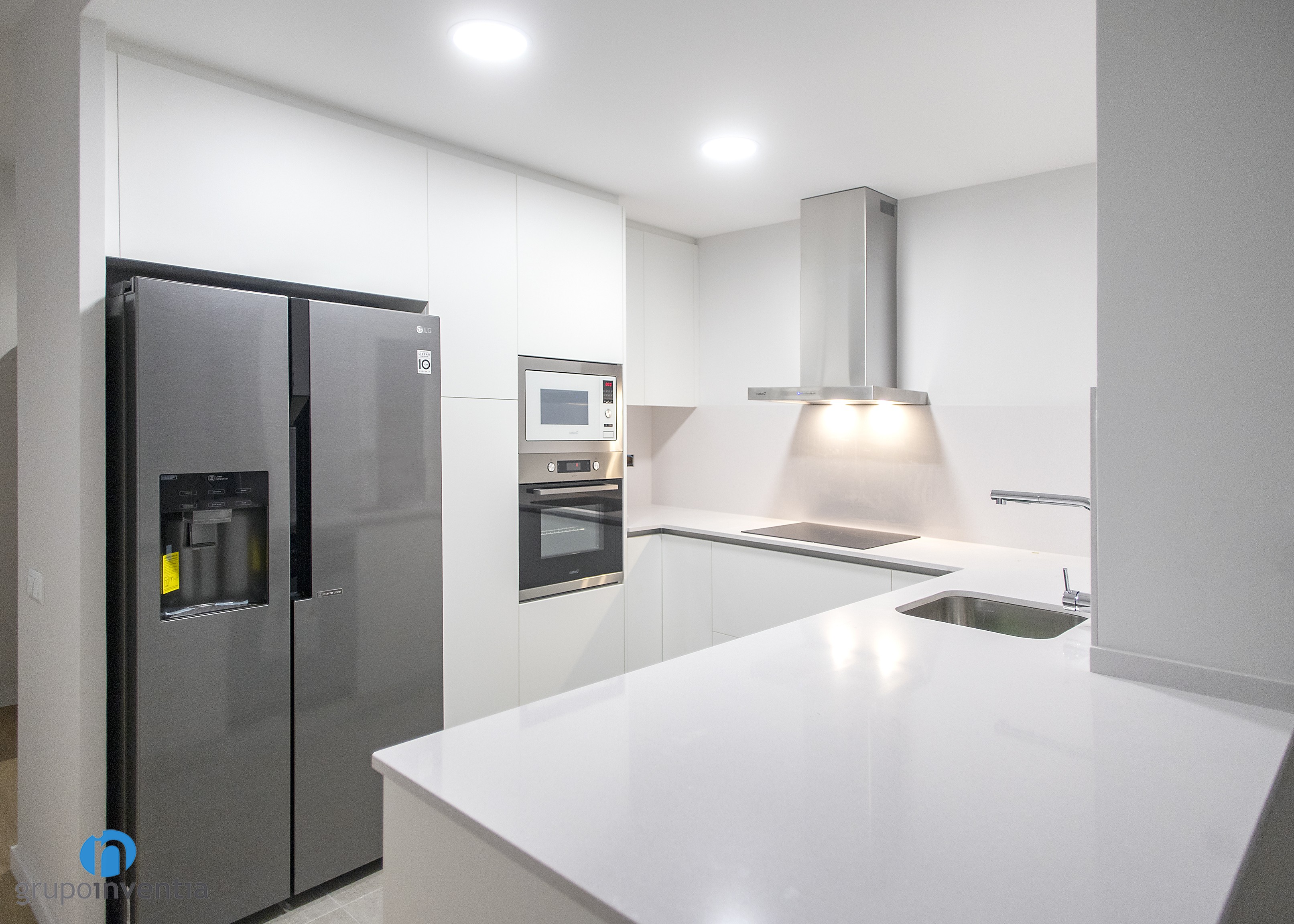 Se trata de una reforma de cocina abierta y distribuida en forma de U. En el extremo del lado izquierdo se encastraron los electrodomésticos, compuestos por una nevera de doble puerta, un horno y un microondas. Seguidamente nace una pequeña encimera que tuerce hacia la derecha para dar paso a un segundo tramo. Éste está equipado con una placa vitrocerámica.