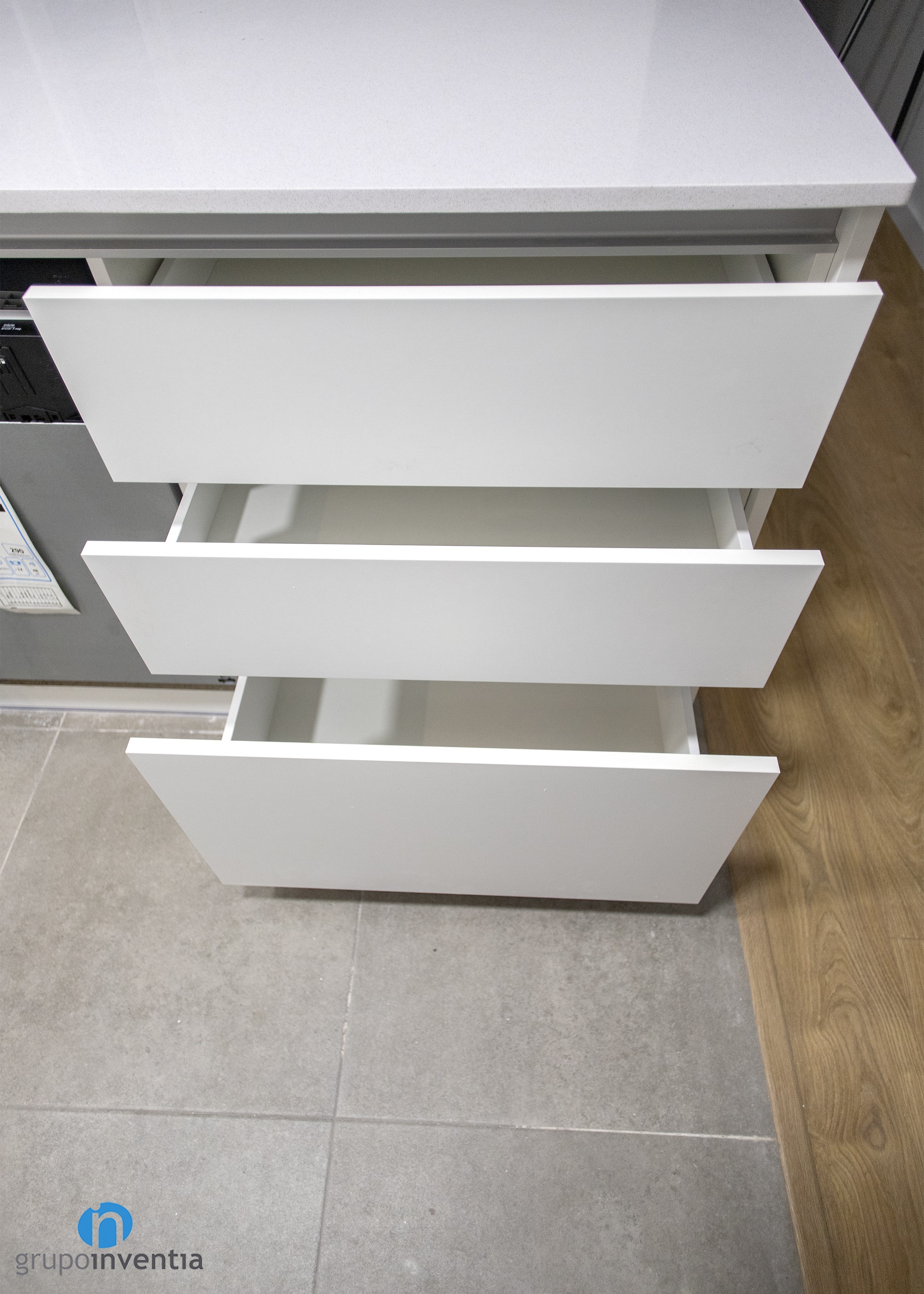 En el lado derecho se colocó una tercera encimera que ofrece superficie de apoyo y que cuenta con el fregadero. Otra de las mejoras introducidas en esta reforma de cocina es la ampliación de la capacidad de almacenaje. A lo largo de toda la parte inferior de las encimeras se colocaron varios cajones y armarios destinados a la organización de la estancia.