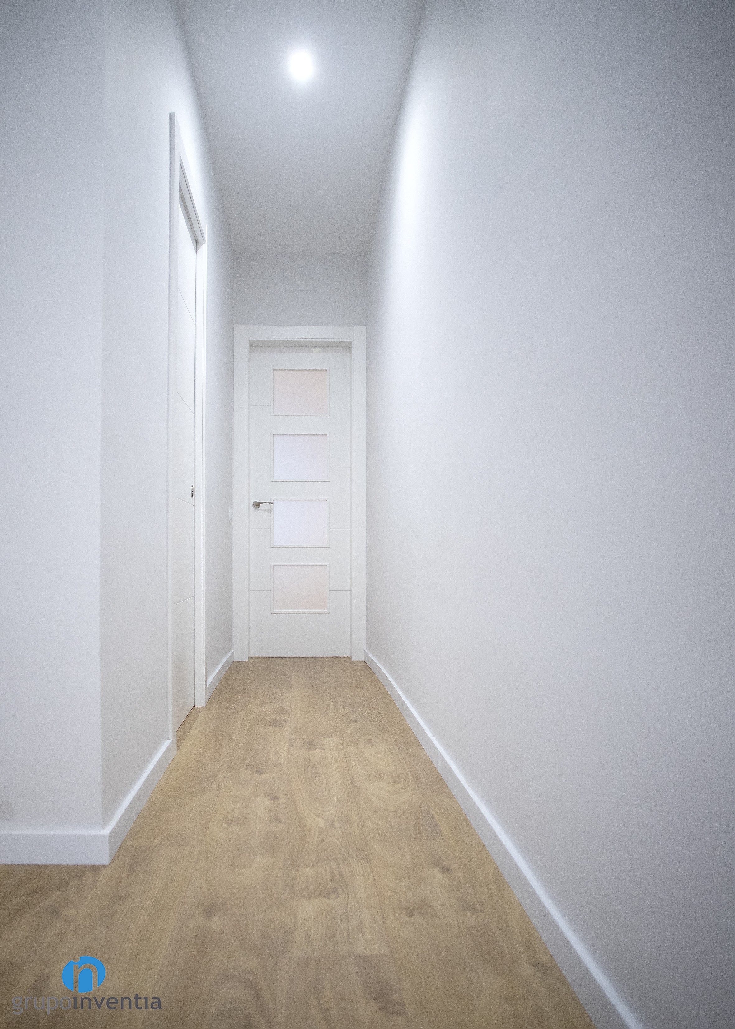 Las paredes se pintaron con un suave tono de gris y se colocó un zócalo blanco, también el color escogido para las puertas. El contraste entre ambas tonalidades es perfecto. El nuevo interiorismo se culminó con la colocación de un suelo de parquet en tonos medios de madera. Además de aportar modernidad, este pavimento también genera una calidez muy agradable.