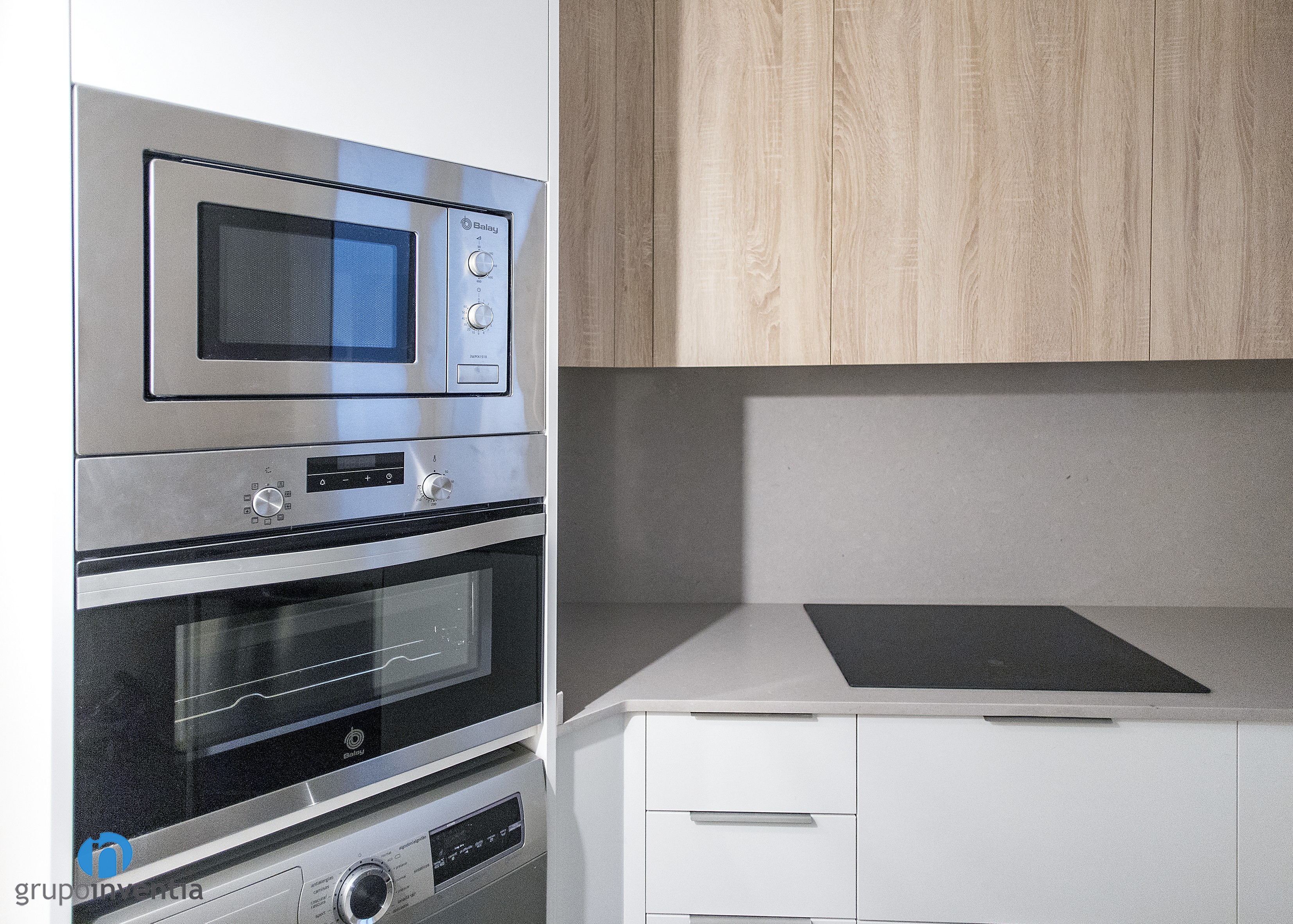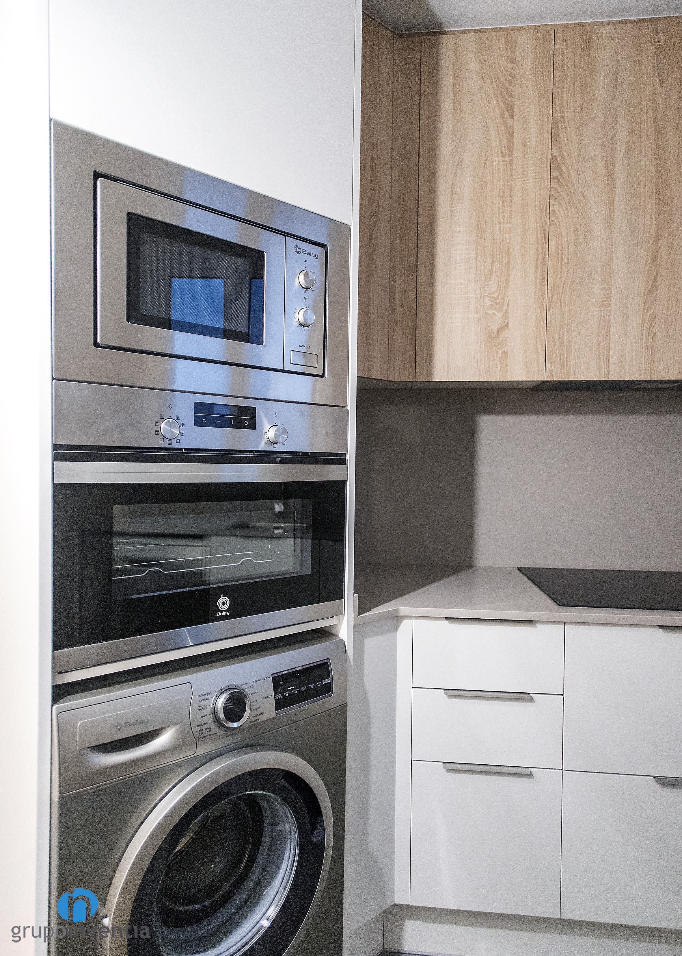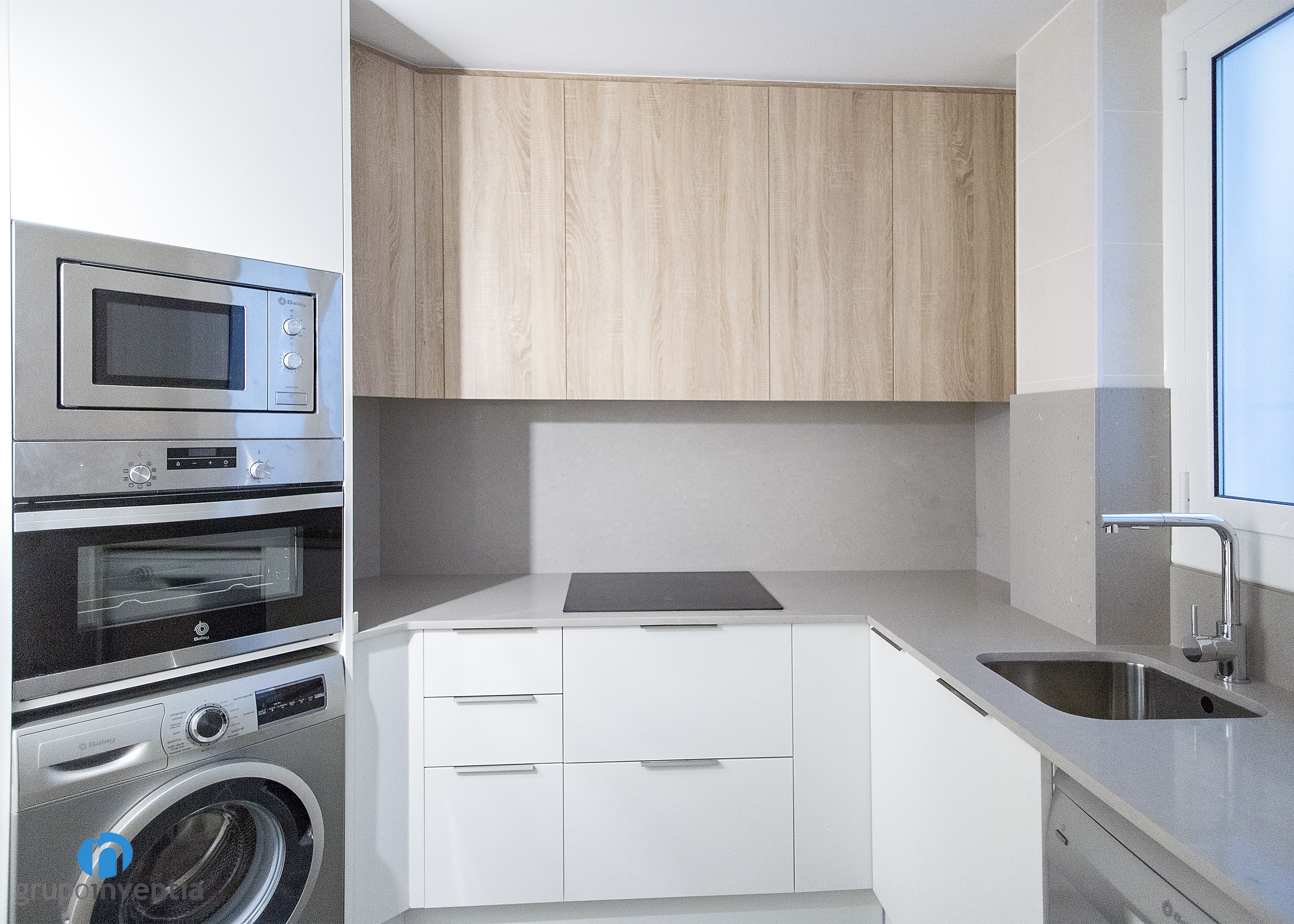 En el lado izquierdo de esta reforma de cocina se colocaron los electrodomésticos, compuestos por nevera, microondas, horno y lavadora. En la parte central se ubica un primer tramo de encimera que ofrece superficie de apoyo y que está equipado con una placa vitrocerámica. El lado derecho también cuenta con otra encimera equipada con el fregadero y con un lavavajillas encastrado en su zona inferior.