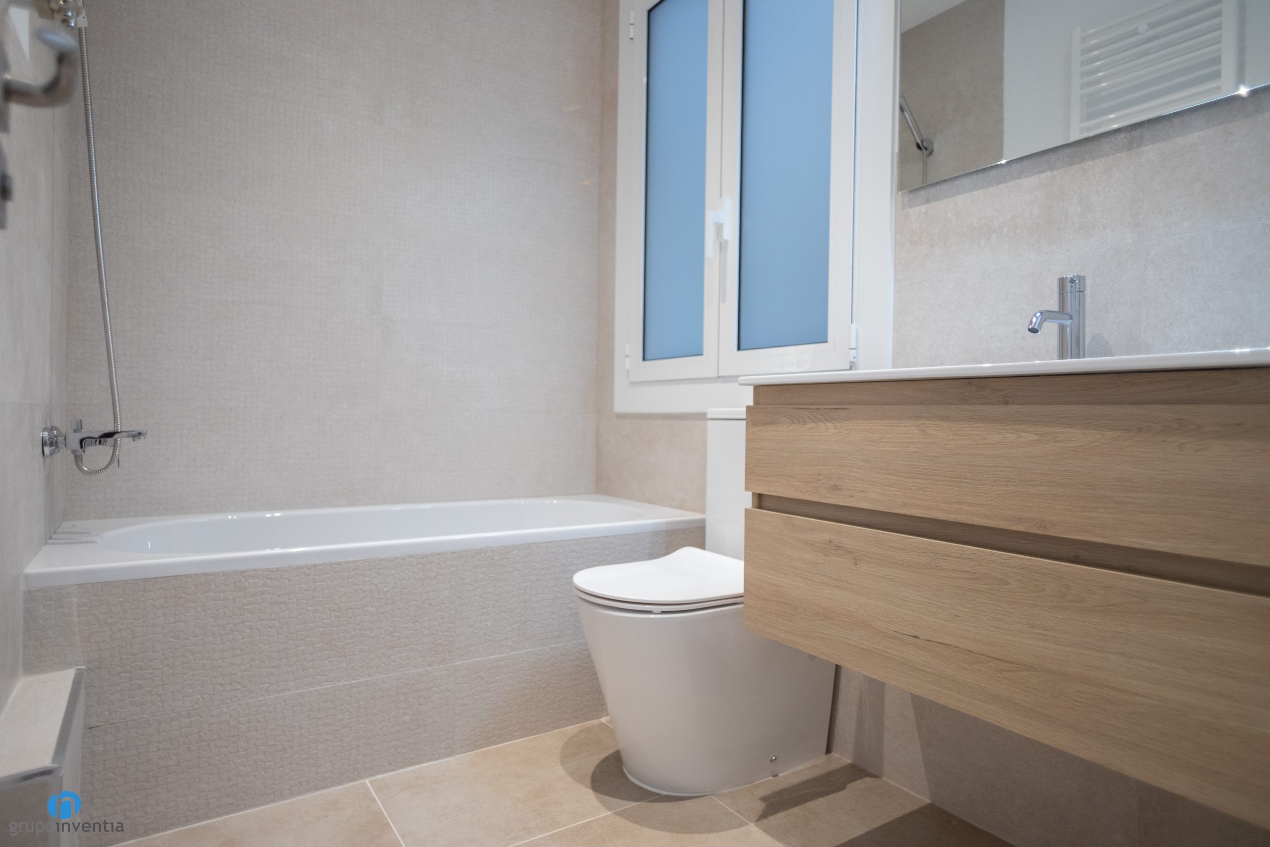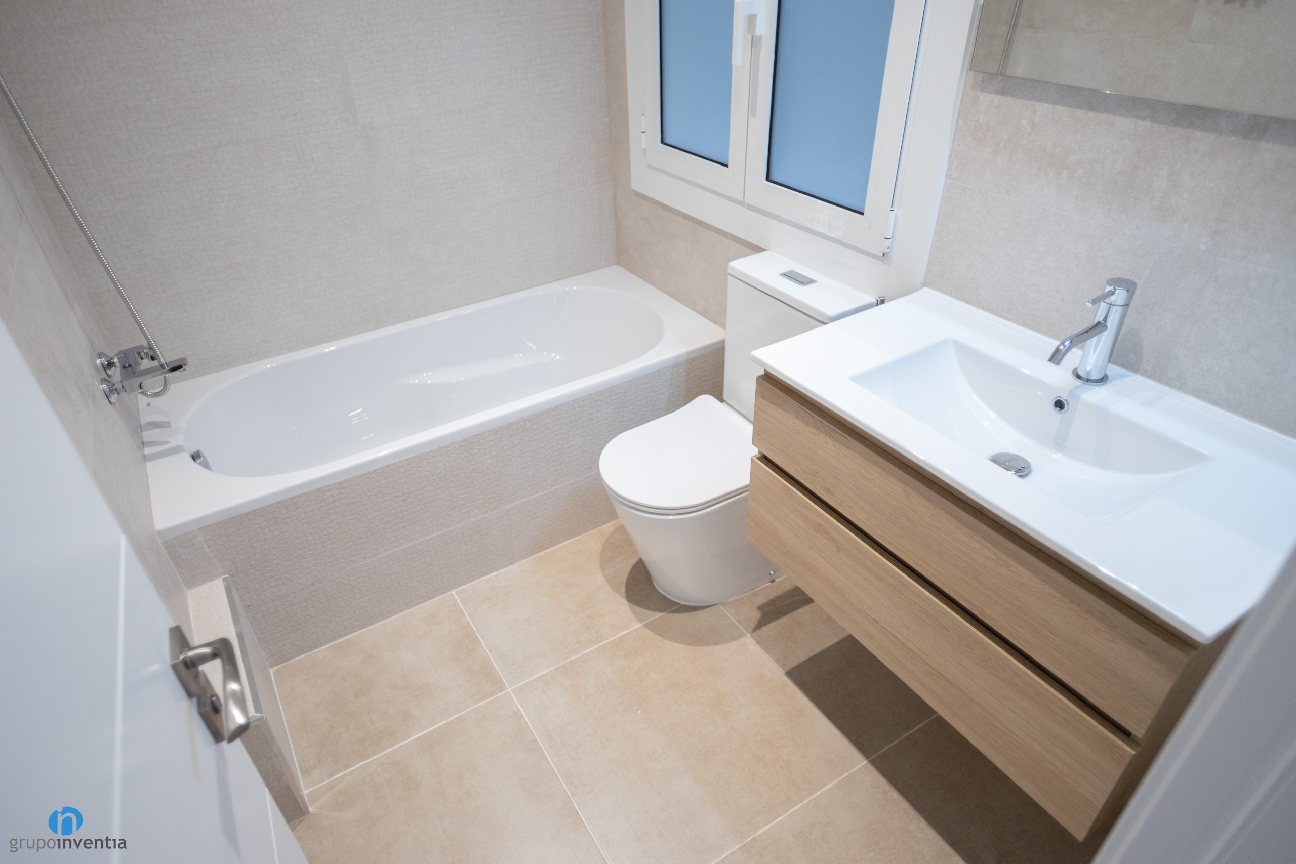 La vivienda cuenta con dos cuartos de baño que se han renovado por completo. En el apartado del equipamiento sanitario se ha apostado por baños de tres piezas. Funcionales y aptos para todos los días. Cada baño cuenta con un lavabo con mueble de almacenaje incorporado, un inodoro y una zona de aguas. En este último elementos se da la mayor diferencia entre ambos. En uno se ha mantenido el espacio de la bañera y en el otro se ha instalado un plato de ducha.