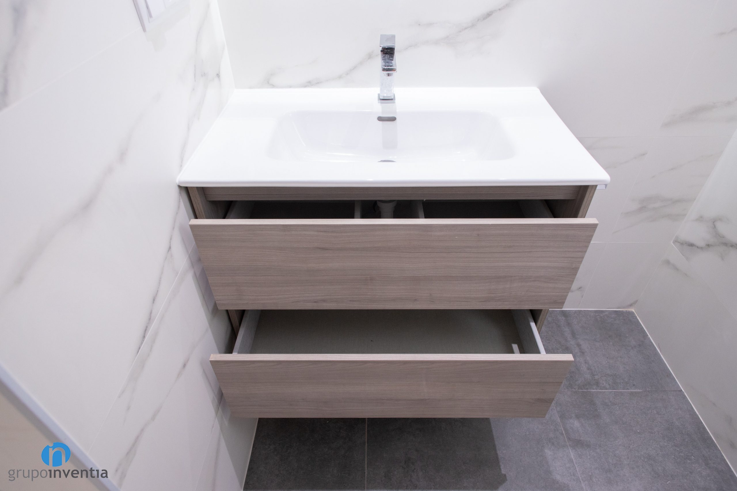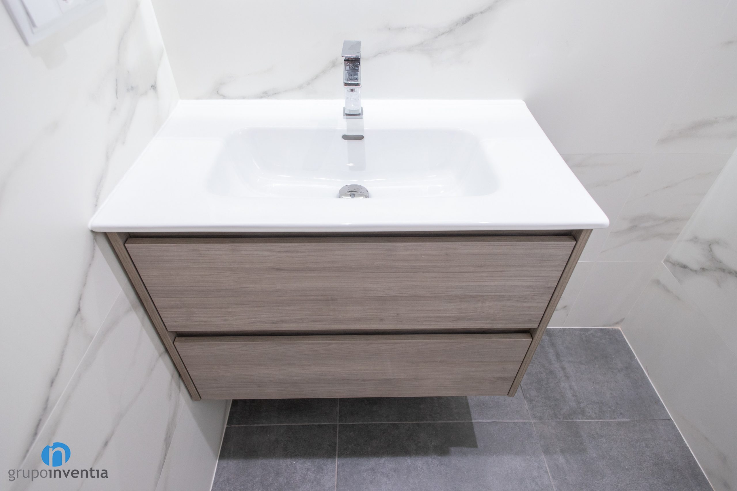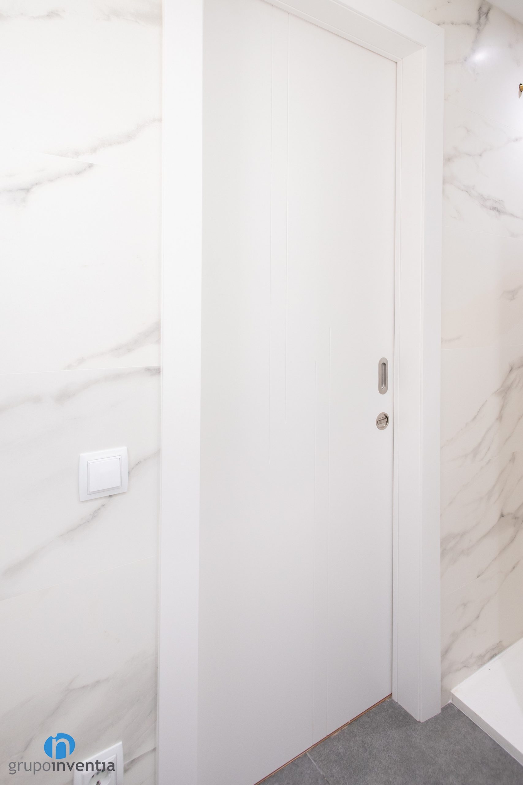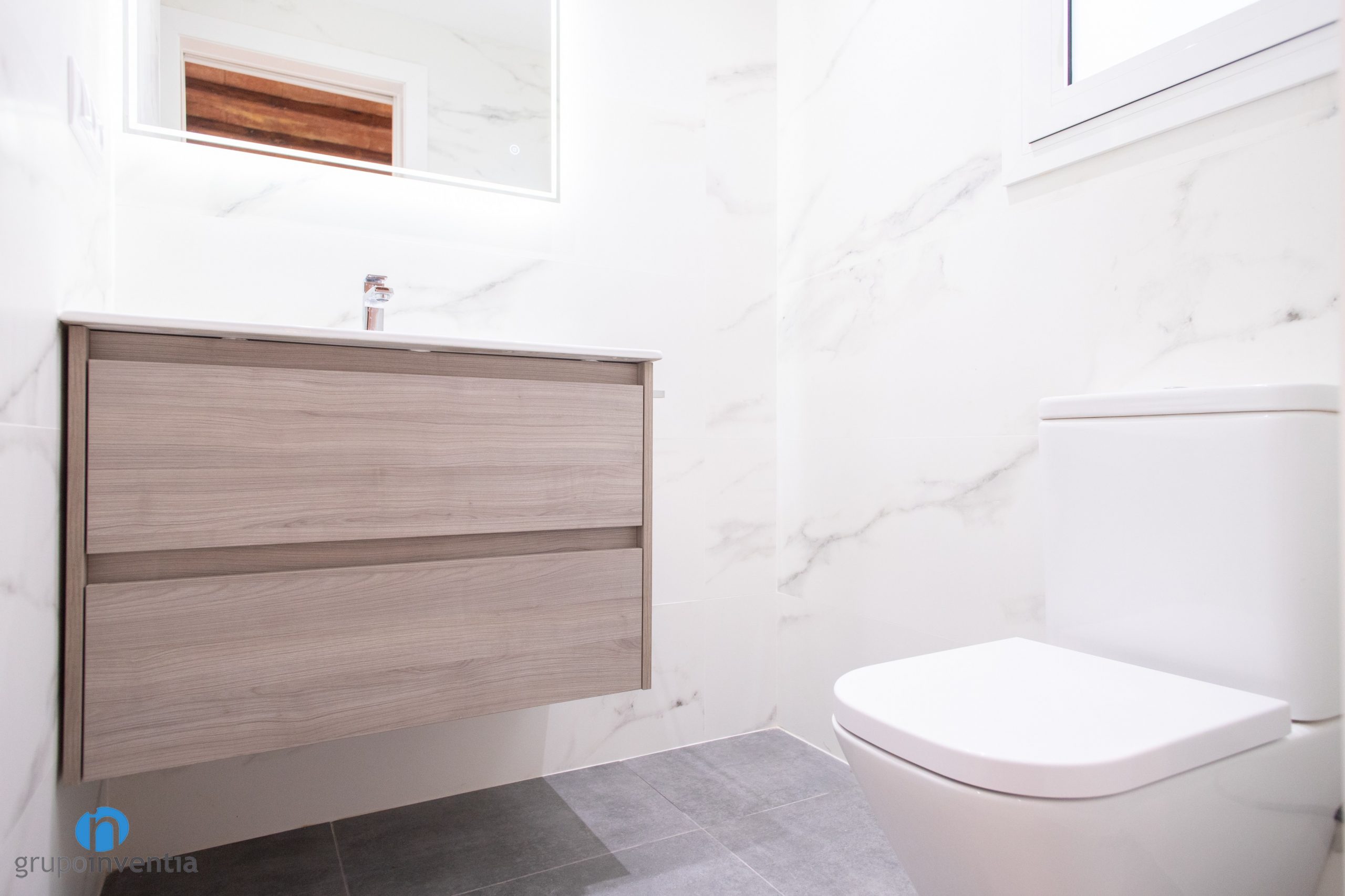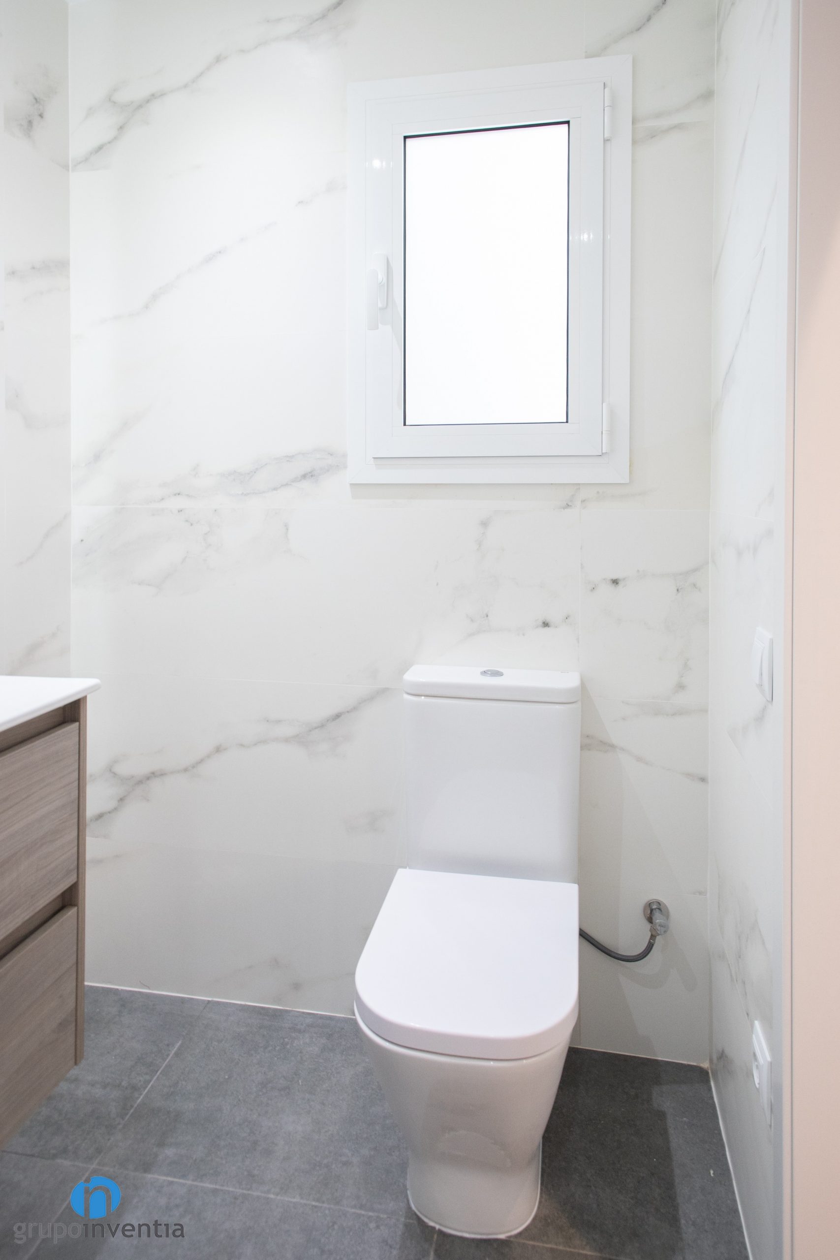 La imagen del cuarto de baño también se ha mejorado. Las paredes se han alicatado por completo con azulejos de color blanco imitación mármol. Un toque muy sutil y que permite integrar el nuevo pavimento de manera fluida. Para este se ha escogido un suelo de gres en color gris. Visualmente queda perfecto, además de tratarse de un material resistente y muy indicado para un cuarto de baño.