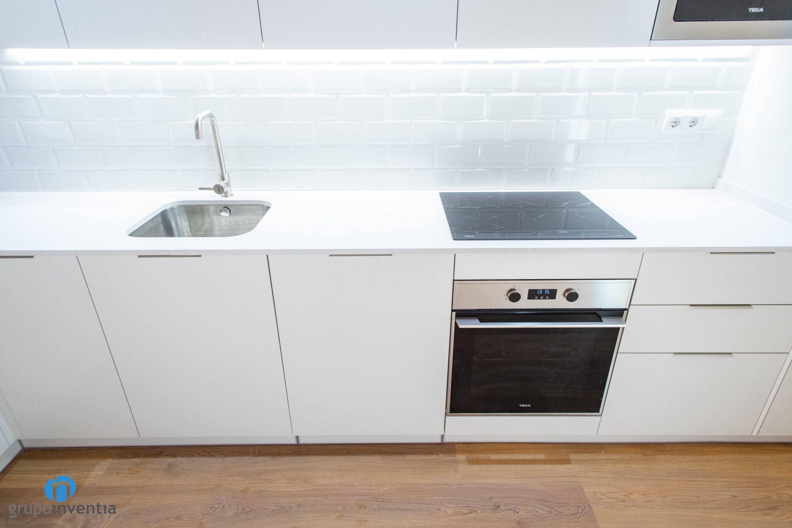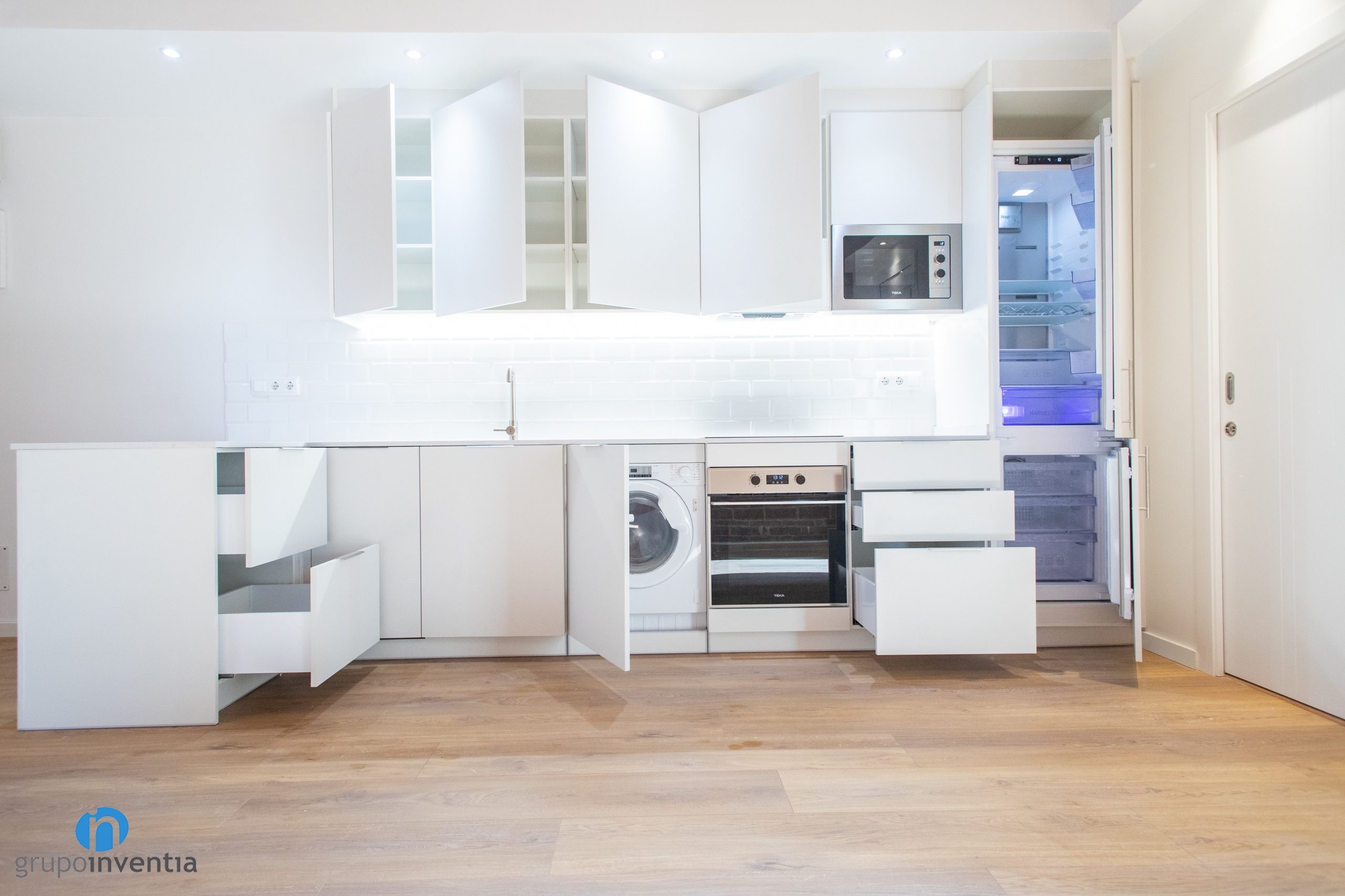 Tanto el mueble de cocina como las encimeras son de color blanco. Sobre la encimera se ha instalado un fregadero y una placa vitrocerámica. Tanto en su zona inferior como superior cuenta con armarios y cajones para el almacenaje. De hecho ahí se han integrado el horno y el microondas respectivamente. En el extremo derecho se ha colocado la nevera. Está integrada en el mueble de cocina y las puertas son las del mismo armario.