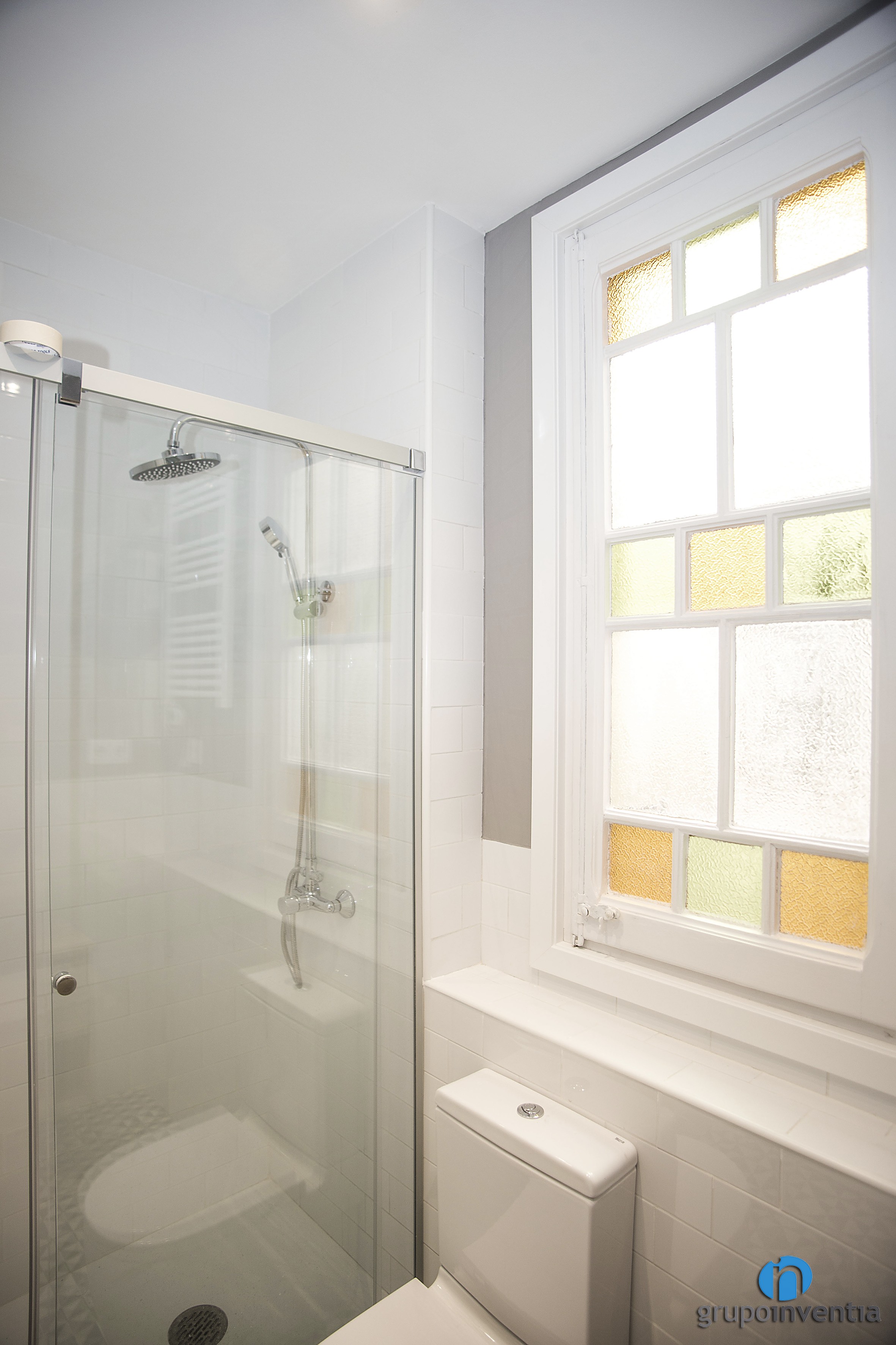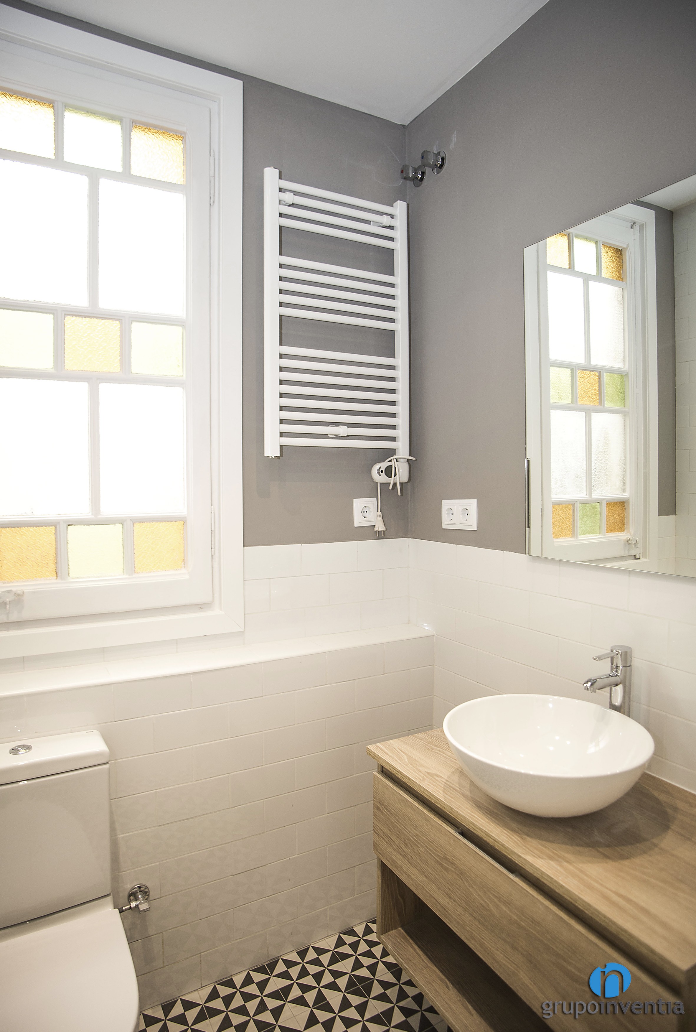 Para el diseño interior del cuarto de baño se apostó por un alicatado a media altura con azulejos de color blanco y se pintó de gris el resto de pared. Además, se utilizaron cristales de colores en la ventana. Con ello se consiguió un ambiente fresco a la parte que acogedor.