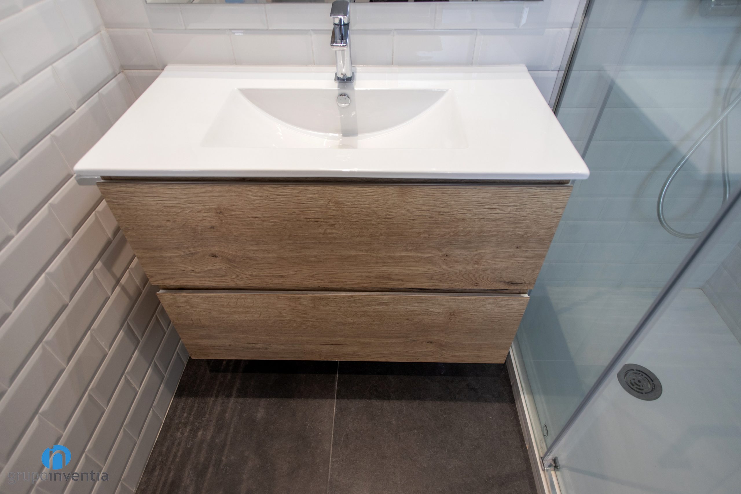 Otros espacios renovados por completo en esta reforma integral han sido los cuartos de baño. Se trata de dos cuartos de baño cuyo nuevo equipamiento sanitario esta listo para ofrecer las mejores prestaciones. En ambos casos se ha instalado un lavabo con mueble incorporado, un inodoro y un plato de ducha con mamparas transparentes.