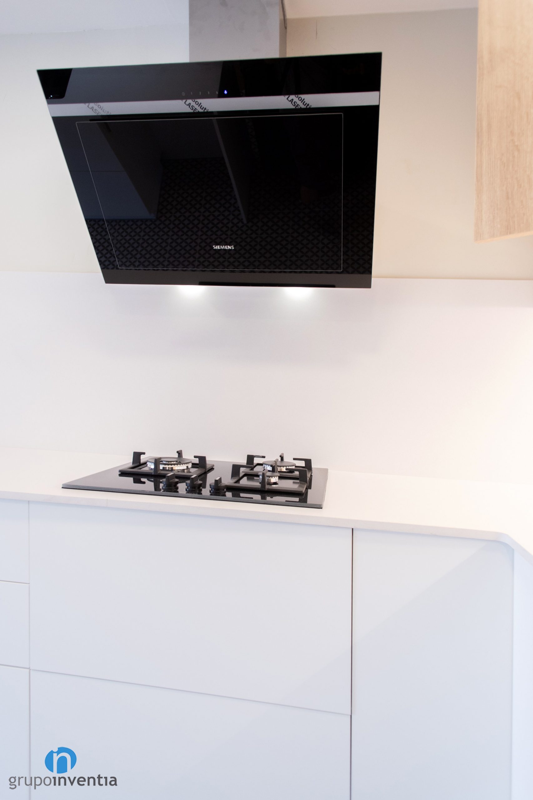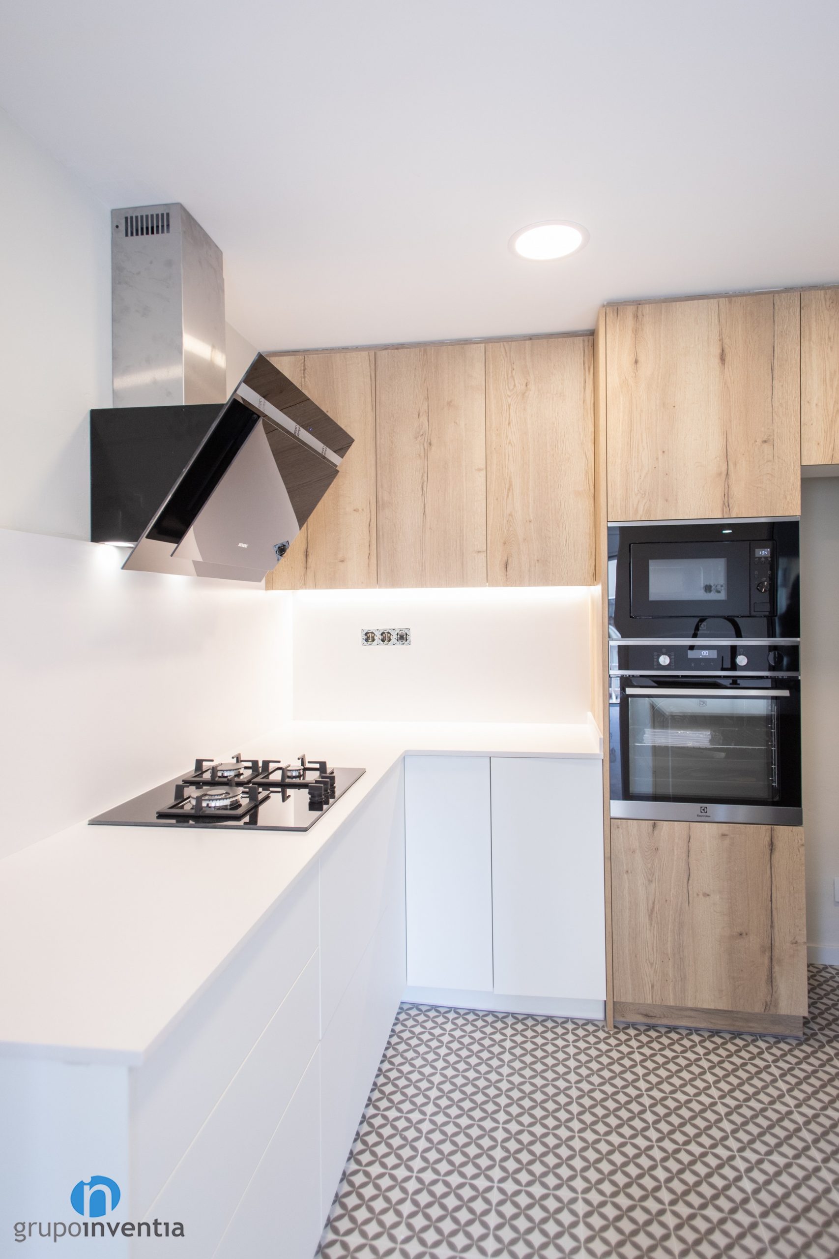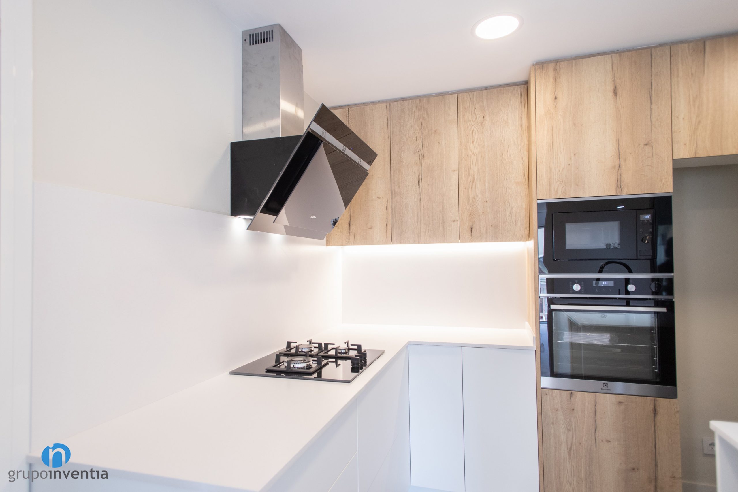 La otra parte de esta cocina se estructura en forma de L. Por un lado tenemos una encimera equipada con una placa de cocción y su correspondiente campa extractora. Por el otro tenemos un mueble de cocina de acabados en madera que aporta mayor capacidad de almacenaje. En este mueble también se han encastrado el resto de electrodomésticos. Hablamos de una nevera, un horno y un microondas.