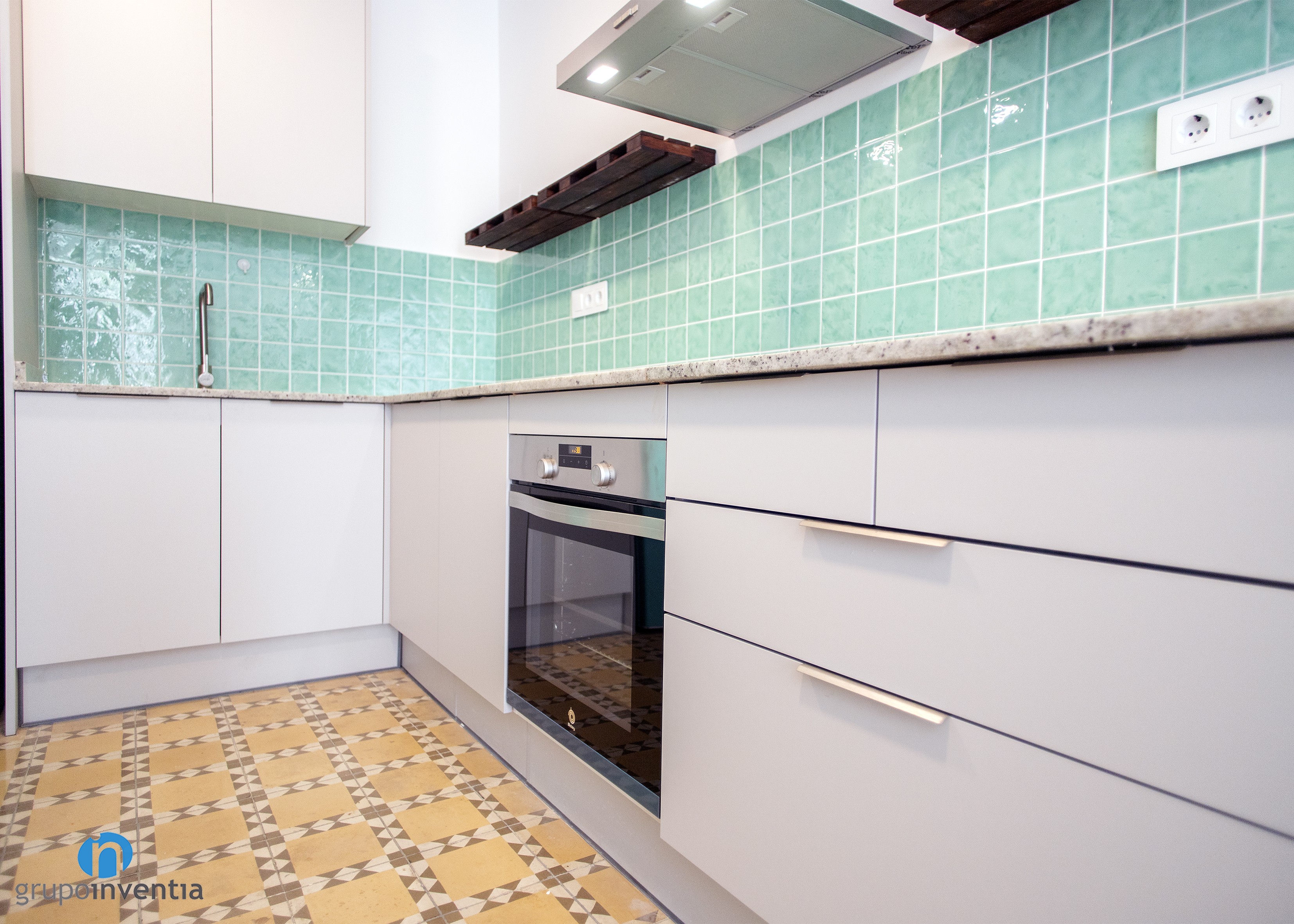 El diseño interior aplicado en esta reforma de cocina tiene un agradable toque vintage. En ella destaca el suelo hidráulico original que se restauró y que aporta una enorme personalidad. A la zona se le añaden toques turquesa, encontrados en la nevera y en los azulejos del salpicadero. A su vez, también se colocaron unas estantería de madera, que amplían la capacidad de almacenaje.