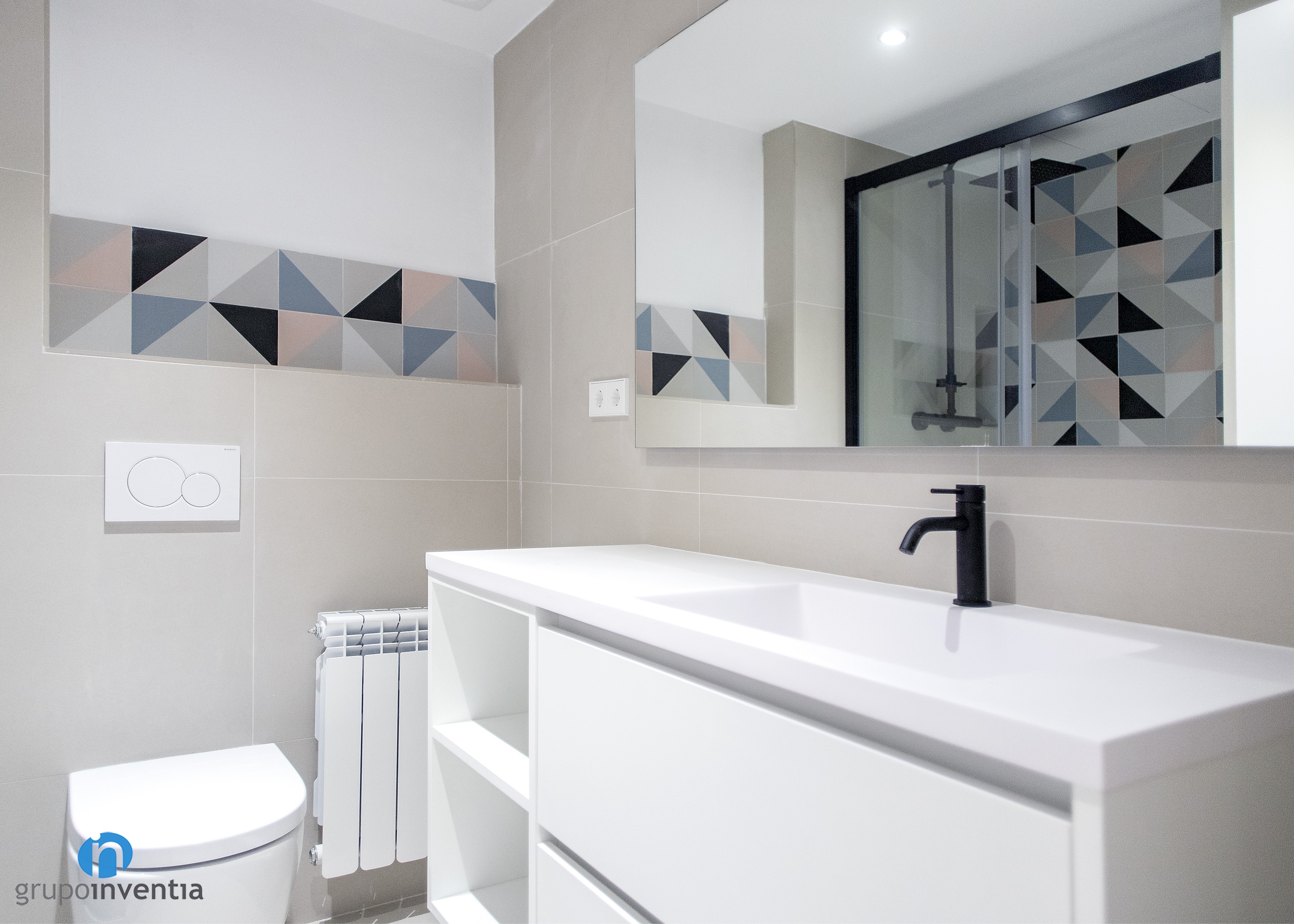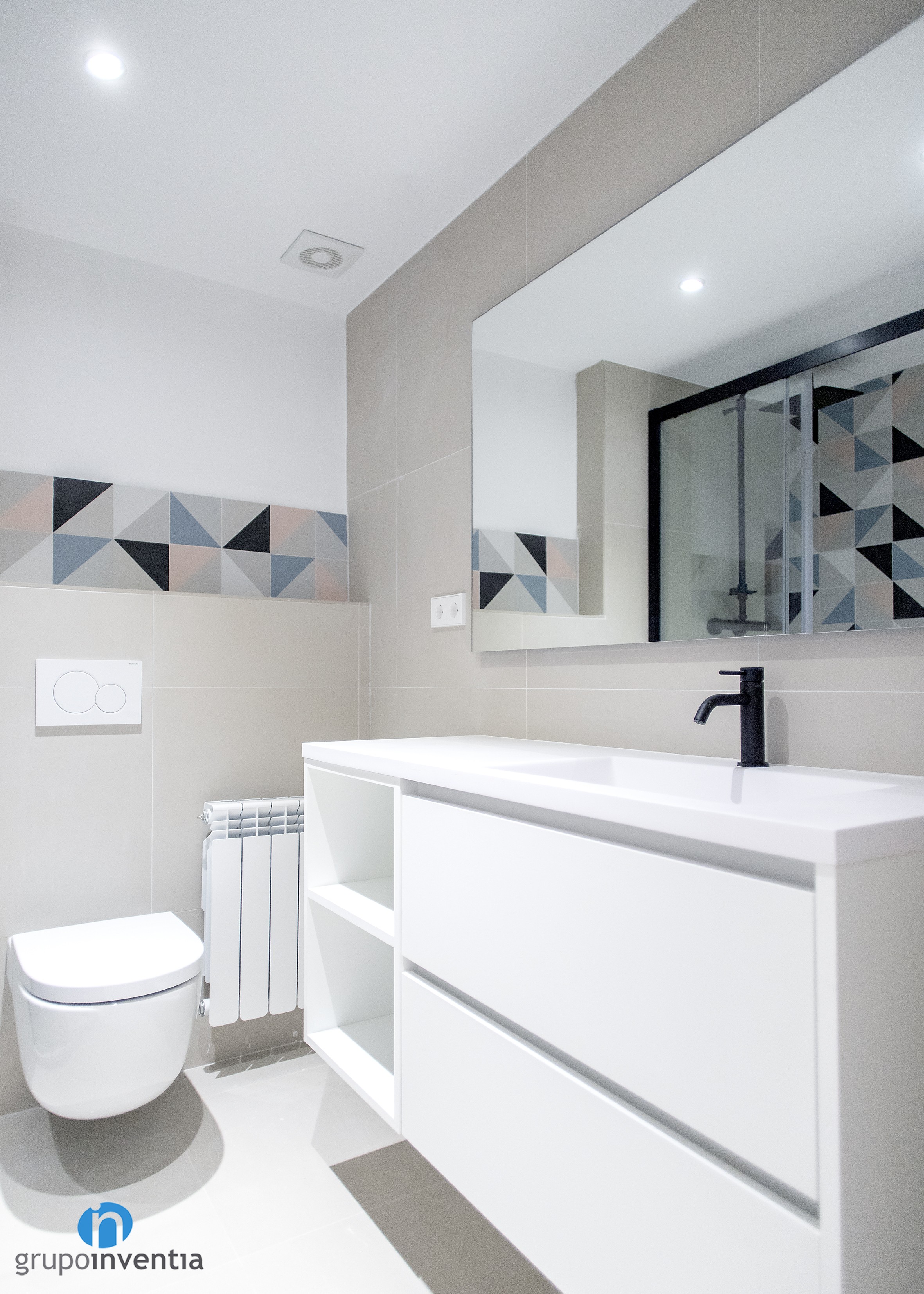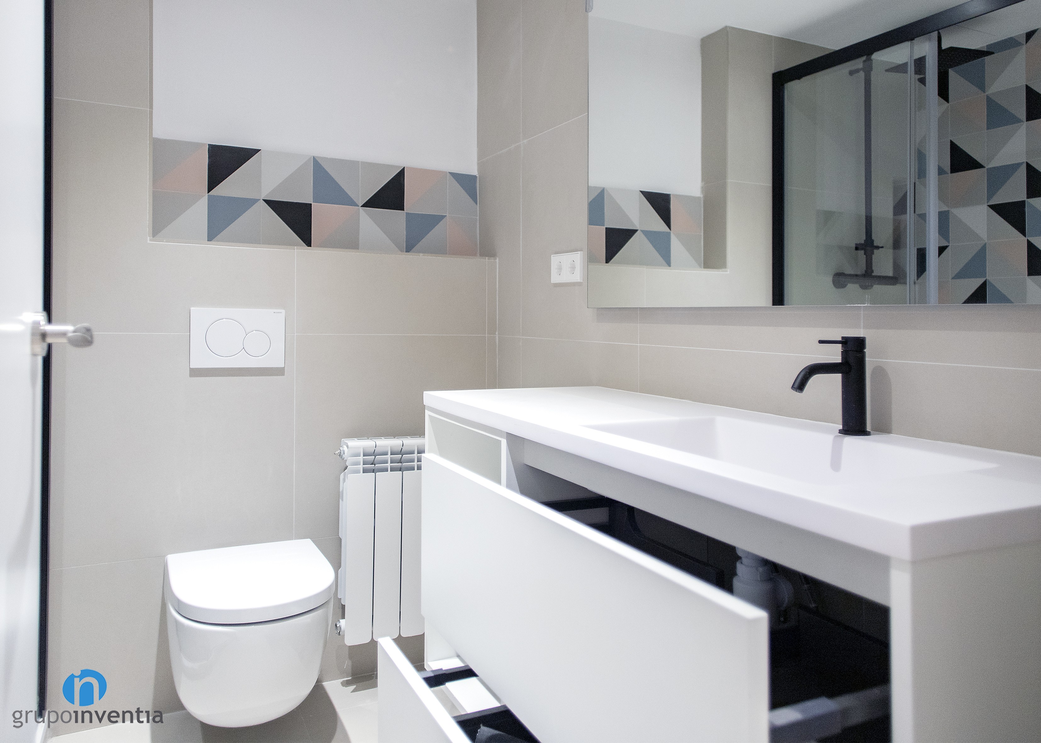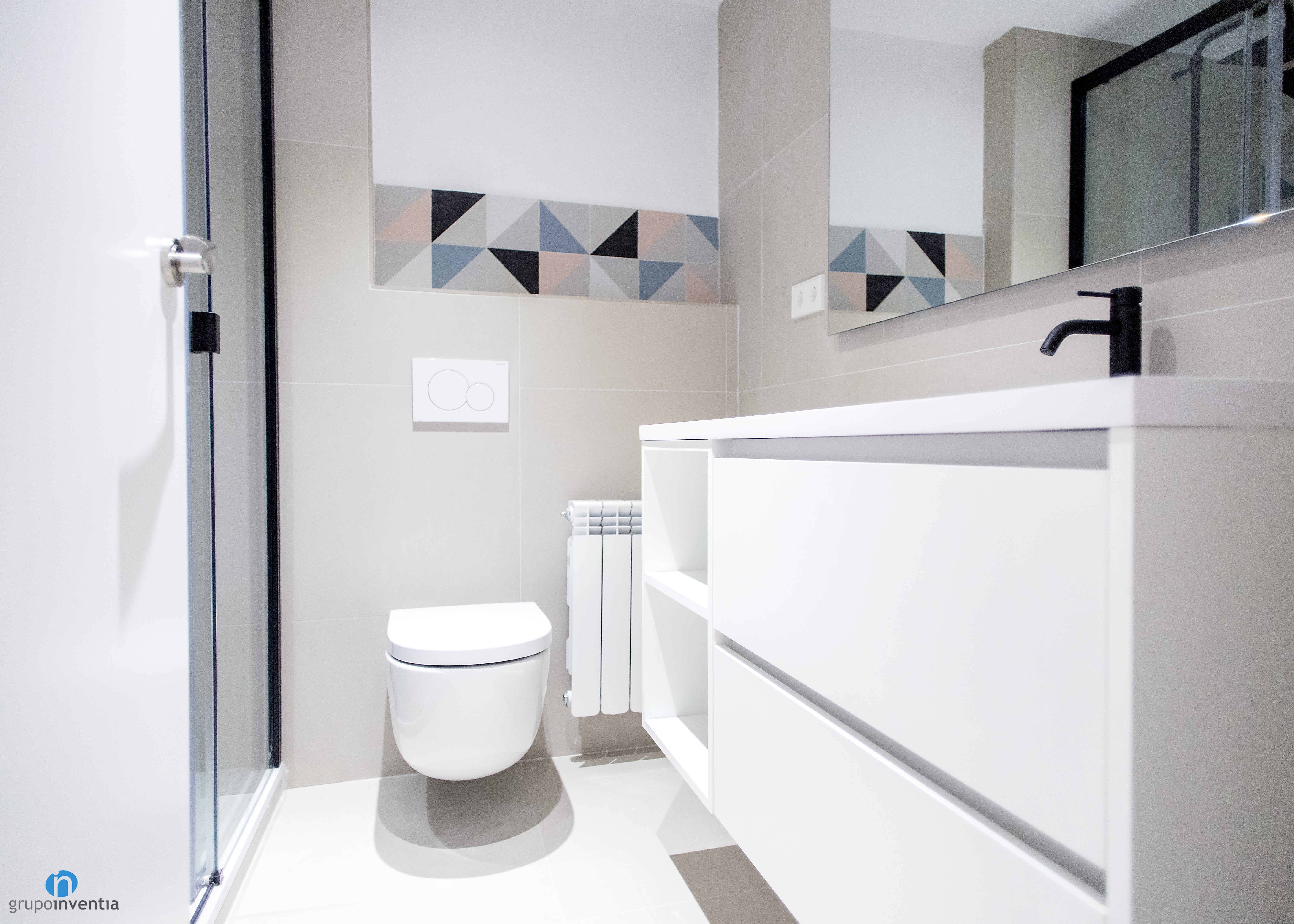 El cuarto de baño también se modernizó tanto en su imagen como en su equipamiento sanitario. Tras los trabajos de reforma la estancia está lista para ofrecer las mejores prestaciones y funcionalidad en su uso. Para ello cuenta con un lavabo con mueble de almacenaje incorporado, un inodoro suspendido y una ducha protegida con mamparas de puertas correderas.
