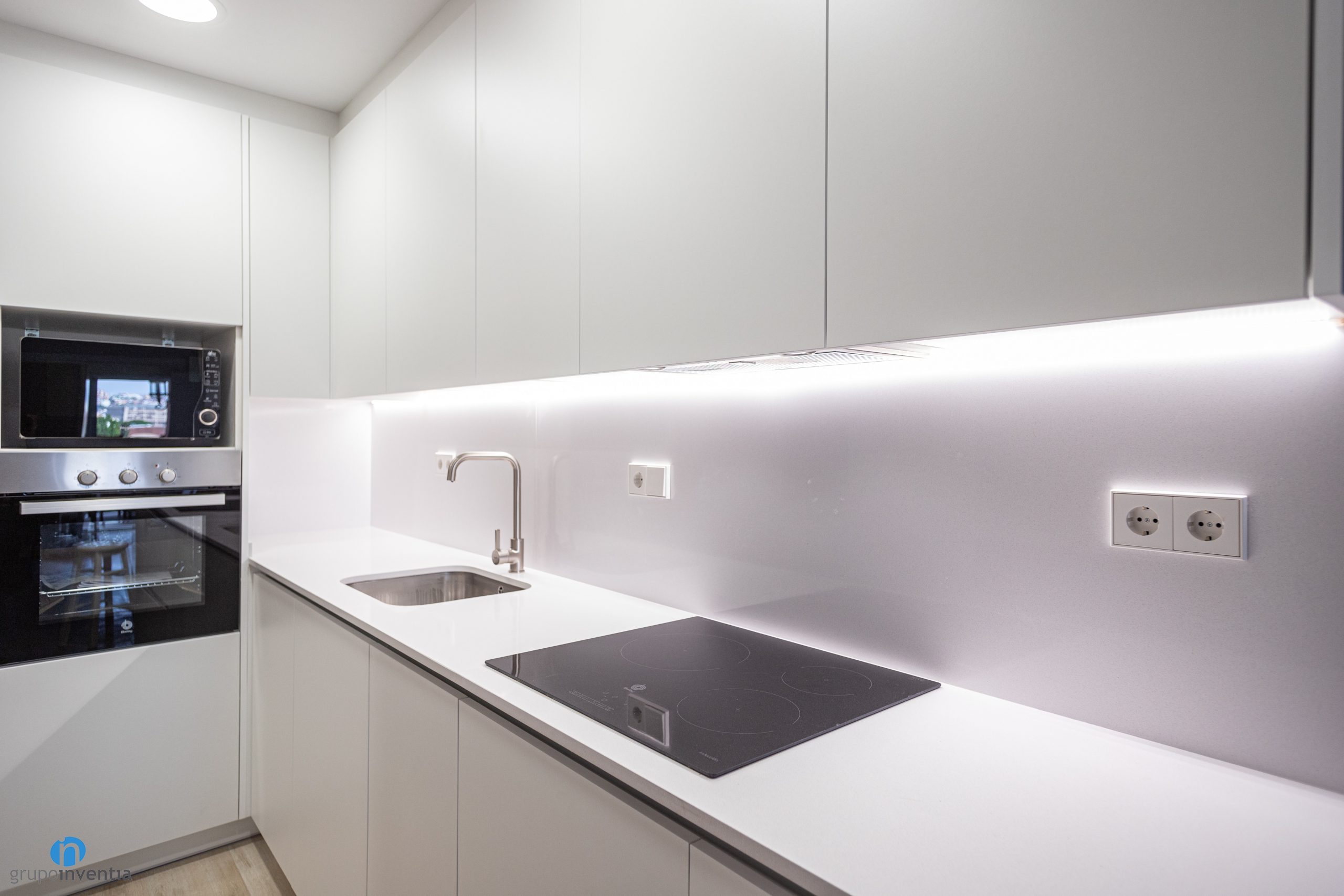 El lado izquierdo lo ocupa una amplia encimera que se ha equipado con un fregadero de un seno y una moderna placa vitrocerámica. Se trata de una reforma de cocina funcional y efectiva. Otra mejora es la ampliación de la capacidad de almacenaje. Ahora la cocina dispone de varios cajones y armarios tanto en la parte inferior como superior de la encimera.