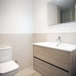 La vivienda contaba con dos cuartos de baño en los que se utilizó un diseño interior que aporta sensación de amplitud y luminosidad, a la vez que crea un ambiente acogedor. Para el alicatado de las paredes se utilizaron azulejos beige, un tono muy parecido al del pavimento colocado y en el que se introducen acabados en madera como los que encontramos en el mueble de baño.