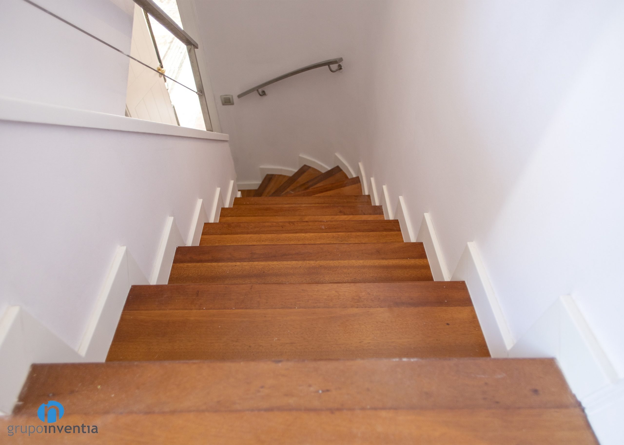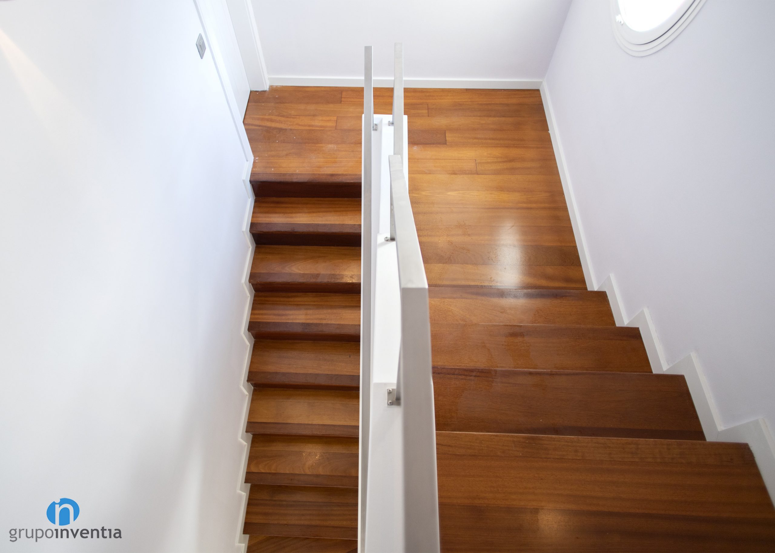 Otro apartado a destacar en esta reforma integral de casa es la mejora del espacio exterior. Justo a la salida del patio se ha habilitado un espacio perfecto tanto para el descanso como para recibir a las visitar. Se han pintado las paredes de ladrillo visto y se ha colocado un pavimento de baldosas muy resistente. También se han mejorado las escaleras que conectan las dos plantas de la casa. Siguiendo la imagen del pavimento de parquet colocado, los peldaños se han recubierto de madera.