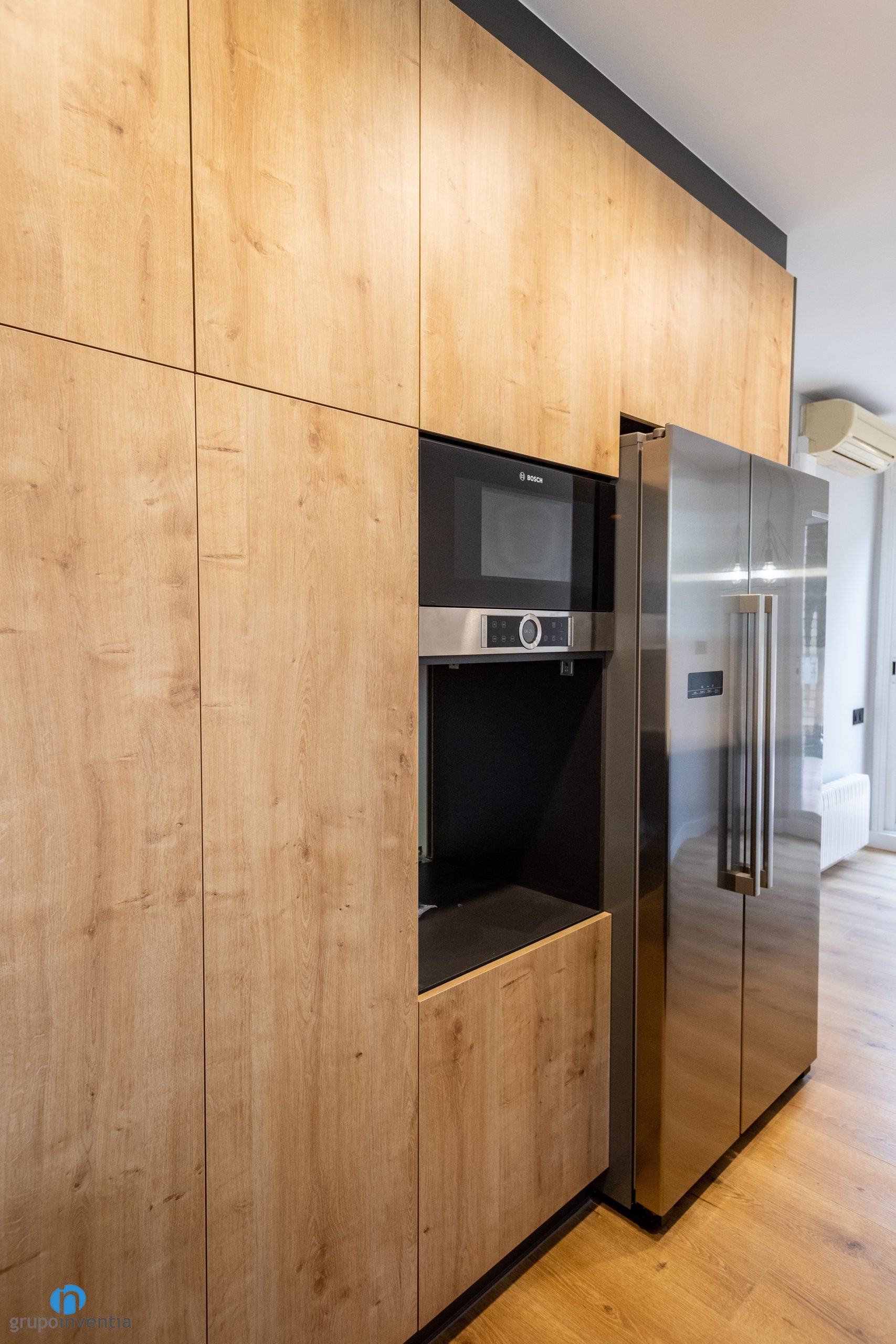 En el lado izquierdo de esta reforma de cocina se ha habilitado un mueble de cocina alto con huecos a medida para integral los nuevos electrodomésticos. Concretamente hay espacio para un horno, un microondas y una nevera. Todos ellos se presentan en un acabado de acero inoxidable que contrasta muy bien con el color negro del mueble de cocina y las encimeras blancas.