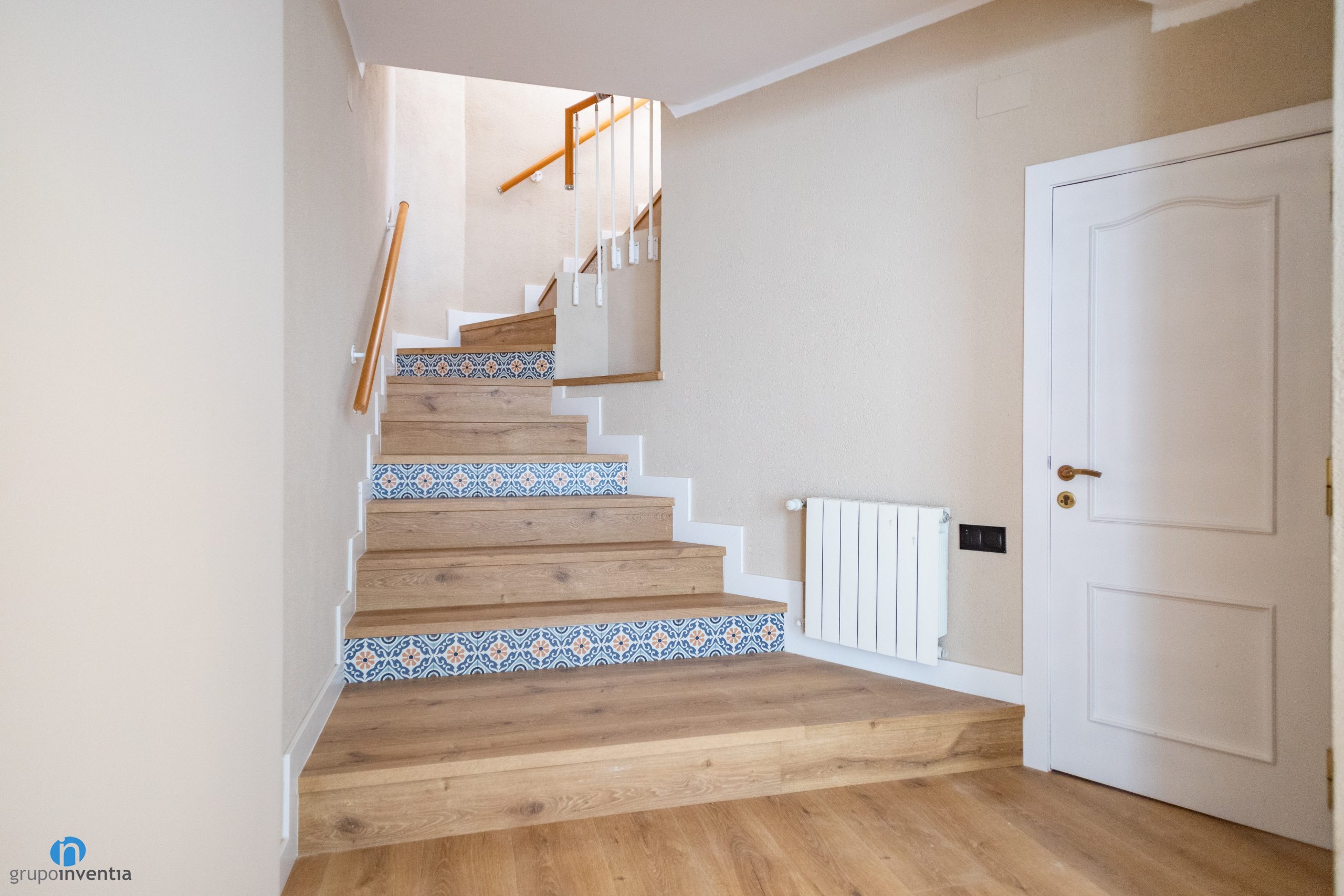 Uno de los elementos que se mantiene en todos los espacios es el nuevo pavimento. Se ha colocado un suelo de parquet en tonos claros de madera. Incluso en los peldaños de las escaleras que conectan las plantas de la casa. En este apartado destaca la contrahuella que se ha usado, ya que es de un azulejo muy vistoso y colorido.