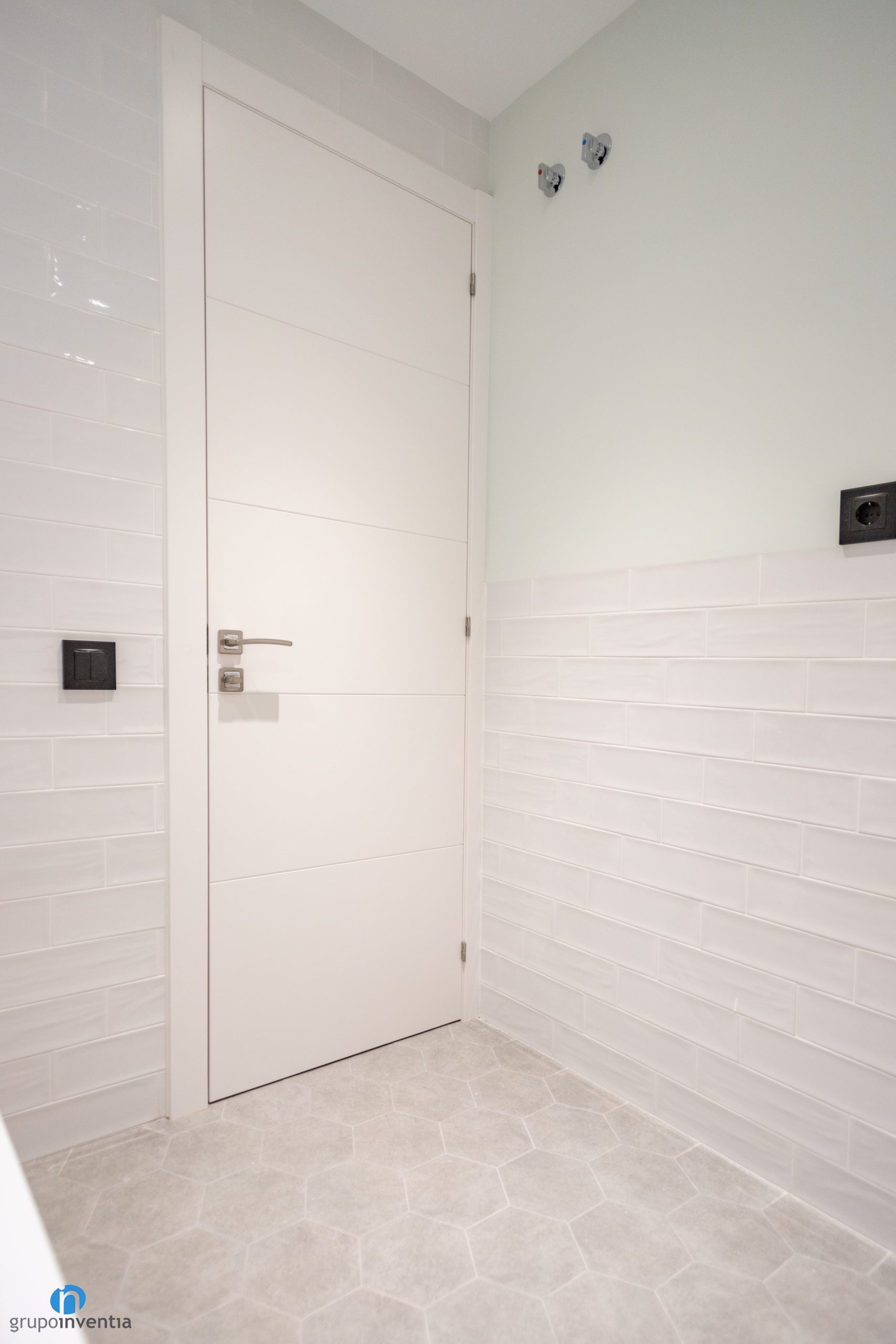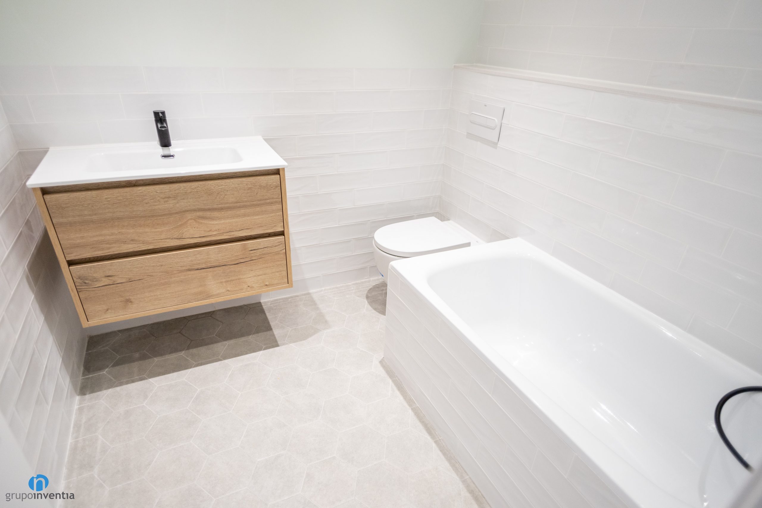 El nuevo diseño de los cuartos de baño se presenta como el resto de la casa: muy luminoso y visualmente amplio. Las paredes se han alicatado con azulejos de color blanco en diferentes acabados. Mientras que en un baño son azulejos tipo metro en el otro se presentan con diseño que simula el mármol. El nuevo pavimente es de baldosas de forma hexagonal de color gris.