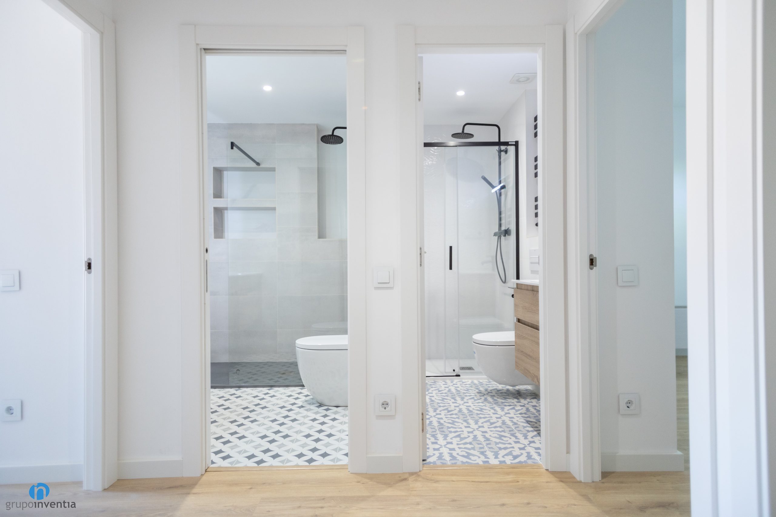 Las paredes se han alicatado con azulejos de color blanco. De entrada permites que la luz se extienda a cada rincón del baño y acepta muy bien otro tipo de acabados. Por ejemplo los muebles del lavabo se presentan en un bonito acabado en madera. También se ha renovado el pavimento, donde se ha escogido un suelo tipo hidráulico. A nivel visual es perfecto y en lo práctico también, ya que es una superficie idónea para un espacio como el cuarto de baño.