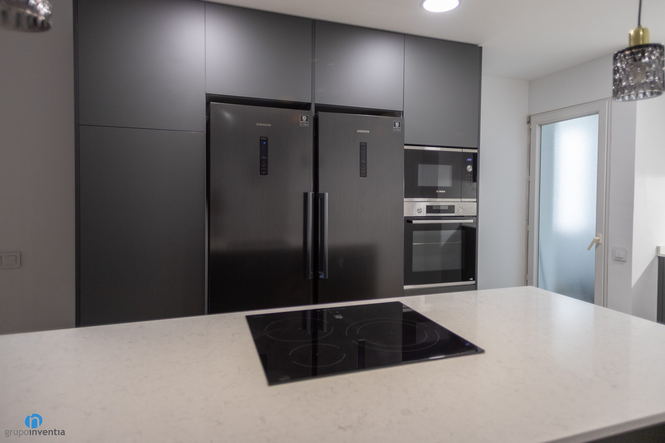 En el lado izquierdo se ha colocado un mueble de cocina en color negro de grandes dimensiones. En él se han integrado varios de los nuevos electrodomésticos de esta reforma de cocina. Concretamente el horno, el microondas y la nevera, que es de dos puertas. Del mismo modo también cuenta con varios armarios que generan una gran capacidad de almacenaje.