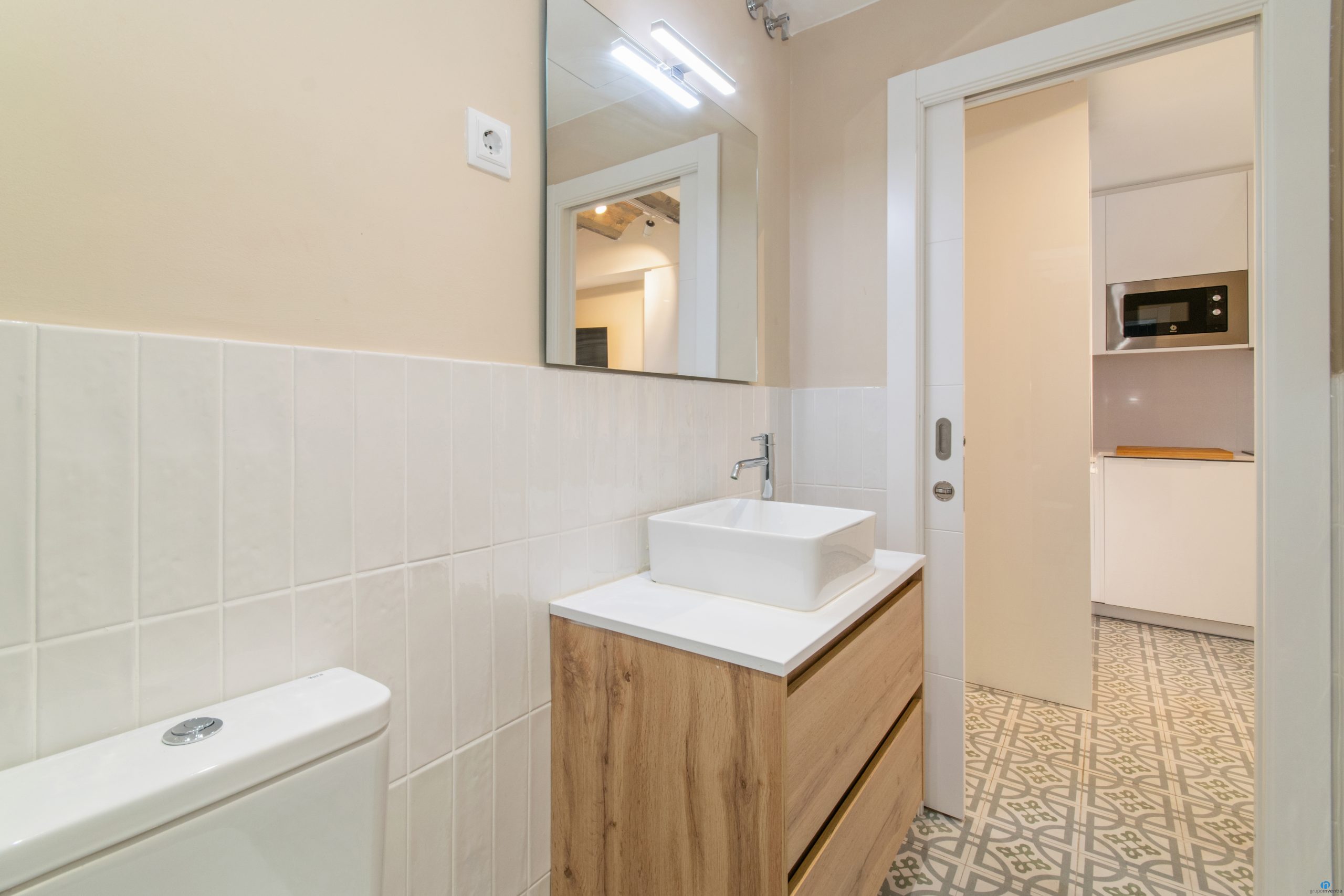 Dentro de esta reforma integral también nos hemos encargado de mejorar el cuarto de baño. Ahora cuenta con un equipamiento sanitario completo y listo para ofrecer las mejores prestaciones. El lavabo es de diseño cuadrado y cuenta con un mueble de almacenaje en su parte inferior. Le acompaña un inodoro con cisterna en la espalda y un plato de ducha.