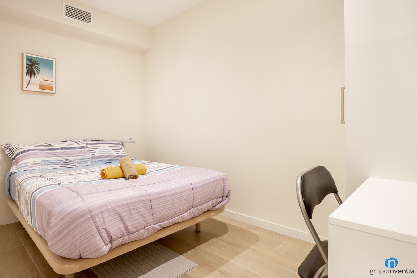 También nos hemos encargado de colocar algunos muebles. En el comedor hay una mesa, en la sala de estar un sofá y una televisión y en el recibidor un banco y un colgador. Además, cada dormitorio cuenta con una cama, un armario y una zona de trabajo.