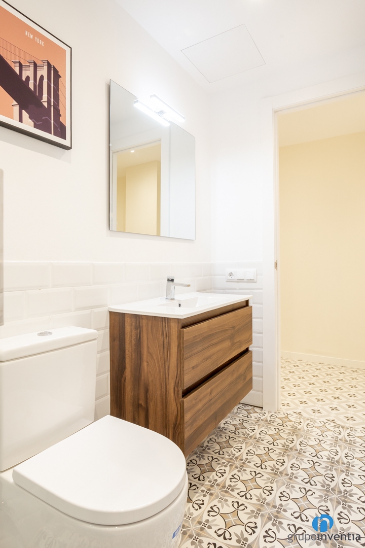 La vivienda cuenta con dos cuartos de baño que también hemos mejorado en imagen y equipamiento sanitario. Tras esta reforma de baños cada espacio de aseo ofrece un uso funcional para cualquier momento del día. Ahora cada cuarto de baño dispone de un lavabo con mueble de almacenaje incorporado, un inodoro y un plato de ducha.