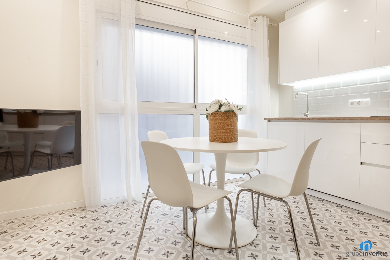 Por otro lado, la encimera es amplia y está equipada con una placa vitrocerámica y un fregadero. Una gran novedad en esta reforma de cocina es que cuenta con capacidad de almacenaje tanto en la parte superior como inferior. Además, en esta última también hemos integrado el lavavajillas. Todo ello en un mueble de cocina blanco a juego con el diseño del resto de la vivienda.