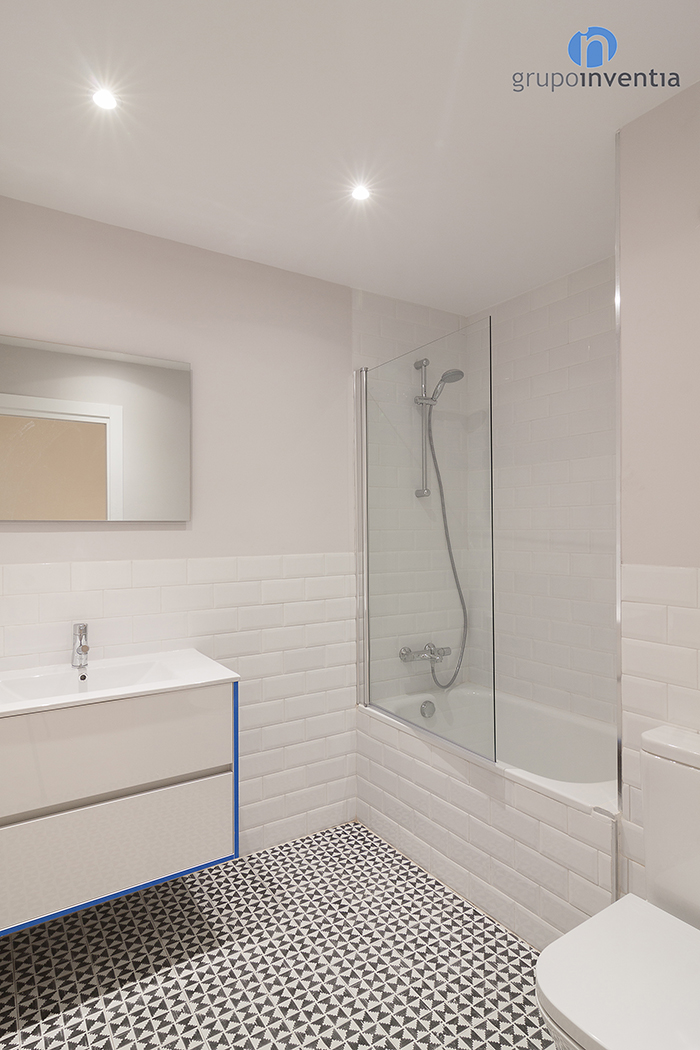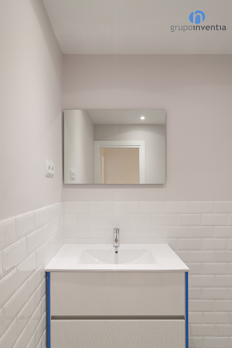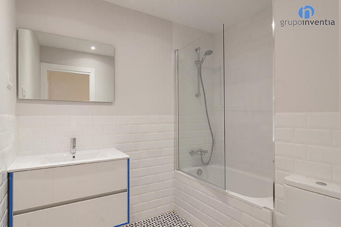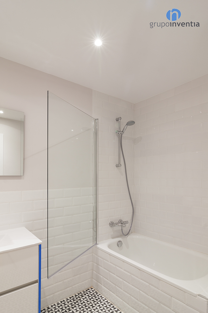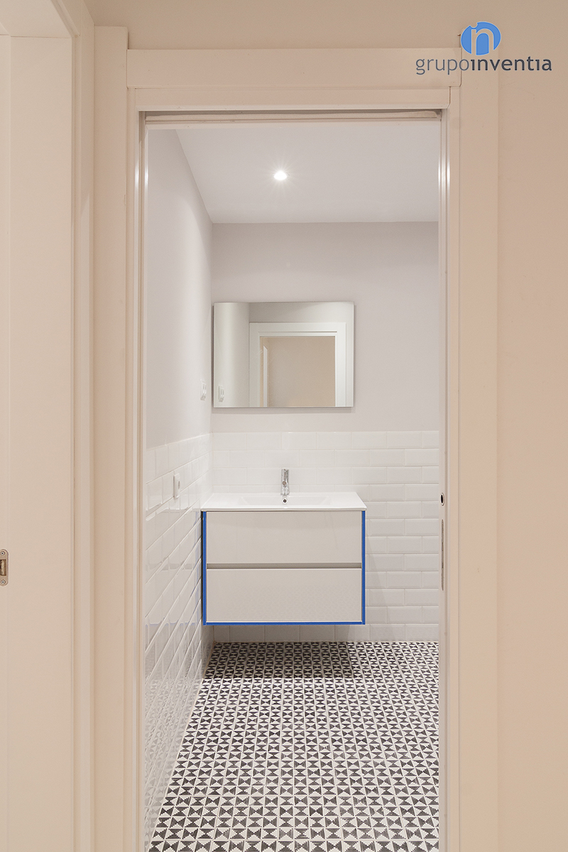 Para la reforma de baño se apostó por un diseño en el que predomina el color blanco, utilizado en el alicatado de la estancia y en los elementos sanitarios. Además de cambiar la imagen, esta reforma de baño se equipó con un amplio lavabo, un inodoro y una bañera. Como detalle, en el pavimento se mantuvo el suelo hidráulico original, el cual fue restaurado previamente.